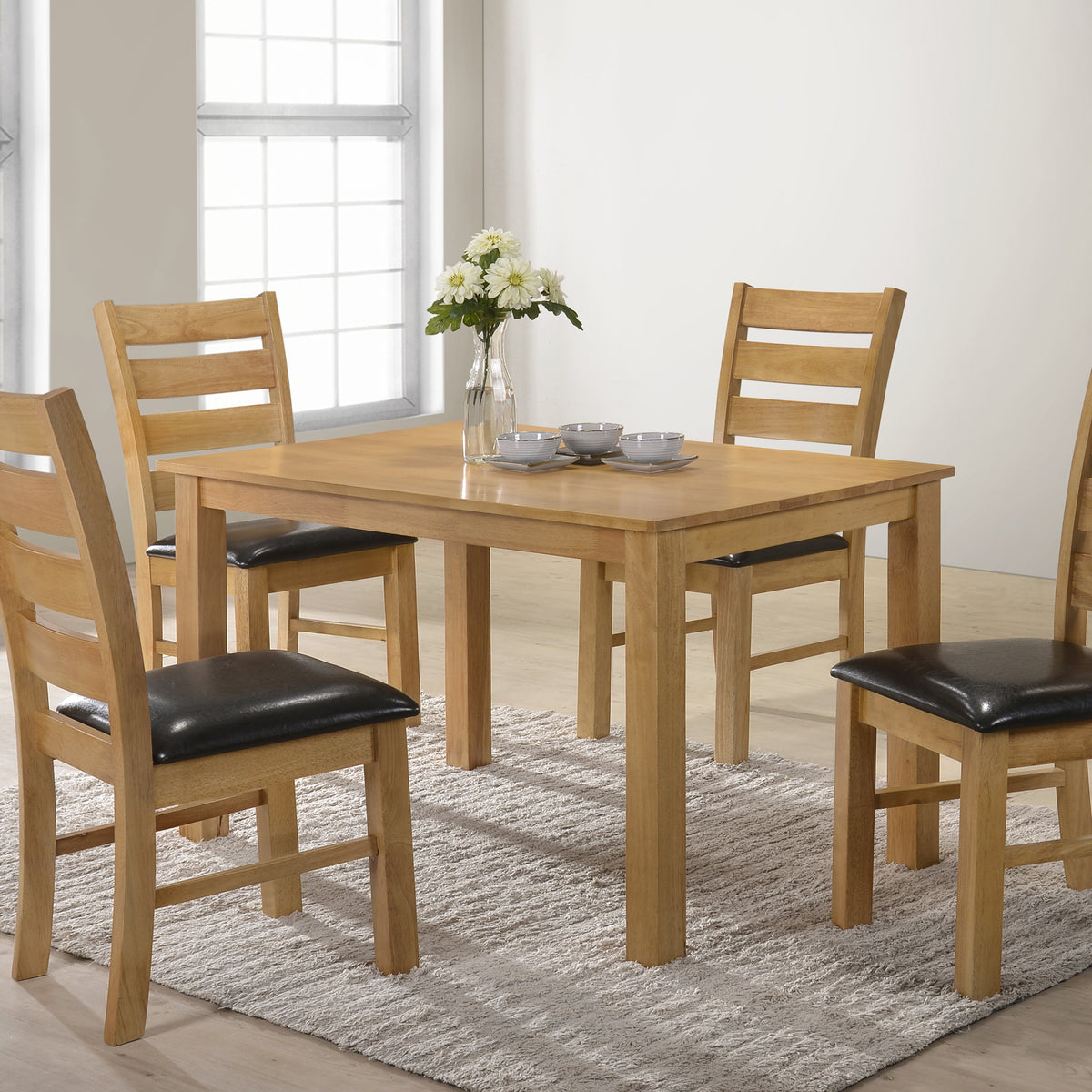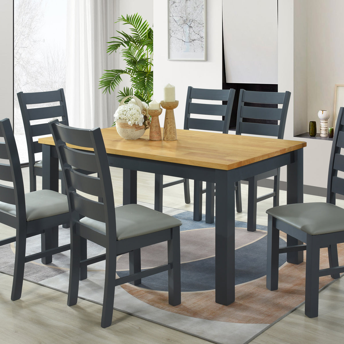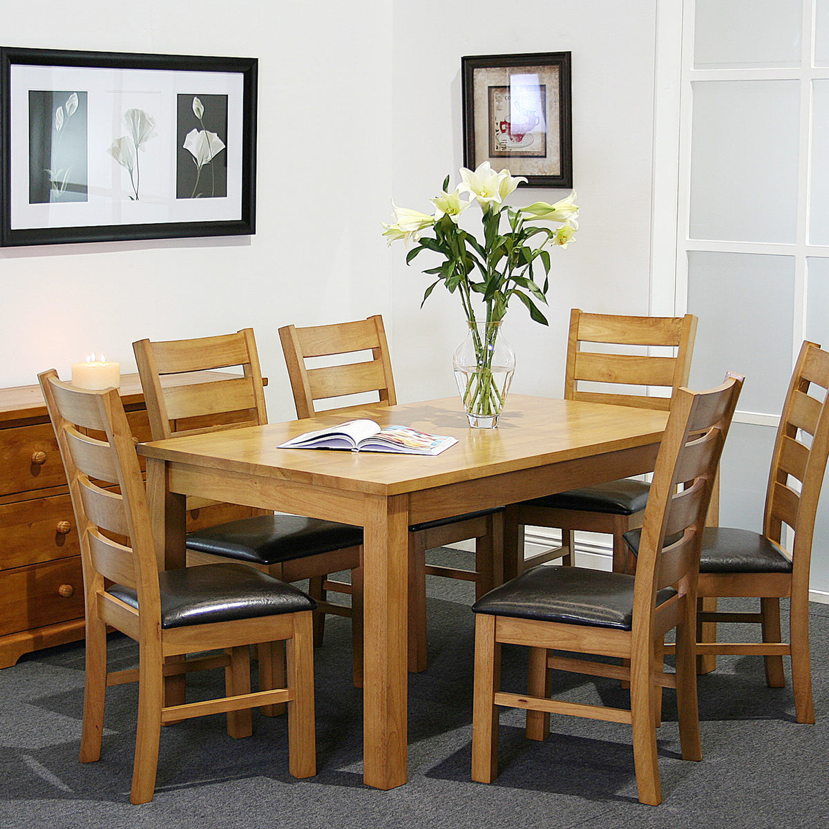 This classic dining set features a rectangular wooden table and six chairs with leatherette seats. The set exudes a warm and inviting atmosphere with its natural wood finish. The table's clean lines and sturdy construction provide a solid foundation for dining, while the chairs' comfortable design ensures a pleasant seating experience. The overall aesthetic of the set is both timeless and versatile, making it a suitable addition to a variety of home decor styles.