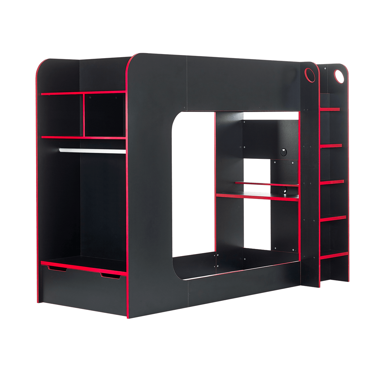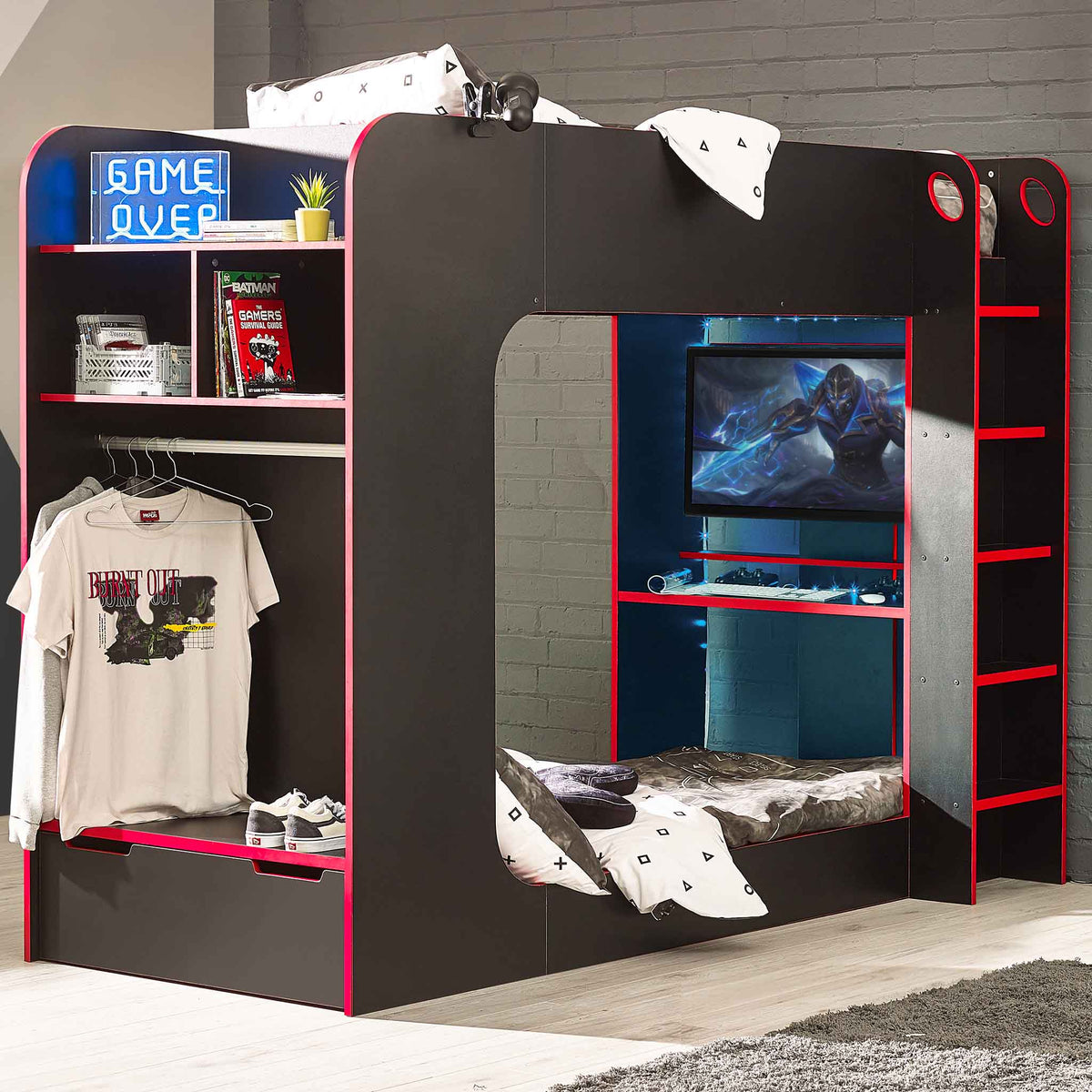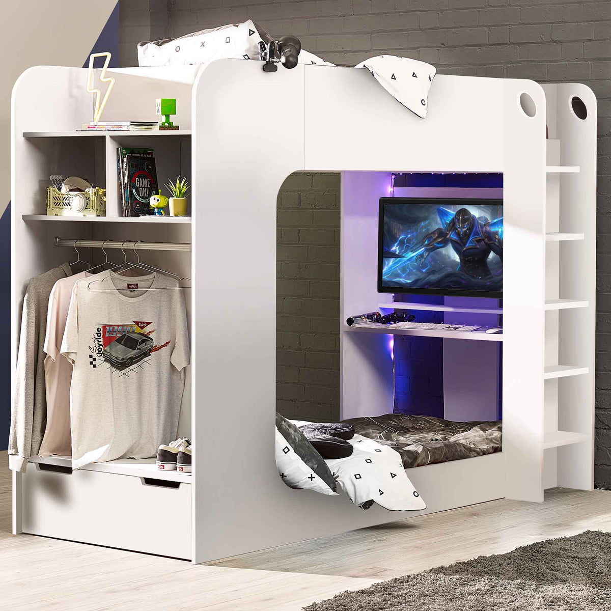 The Lombard Gaming Bunk provides the perfect set up for teenage gamers, with a large underbed space and desk for a monitor. Featuring a hanging rail and multiple storage areas, this modern gaming bed provides the ideal space to sleep, play and stream. Available in Black/Red or All White.