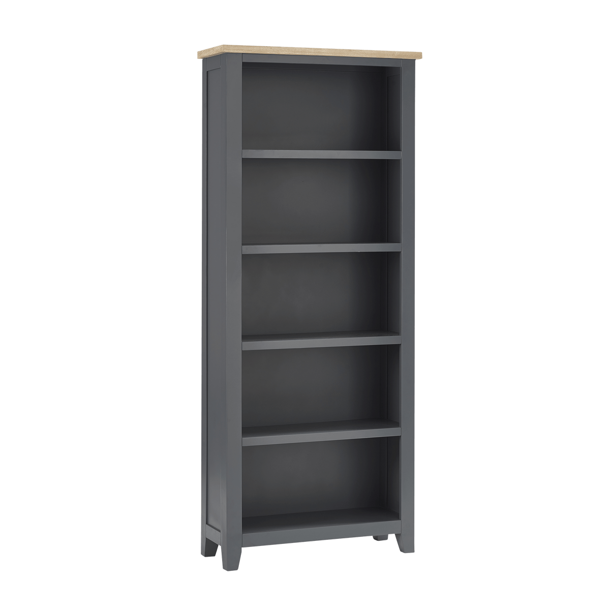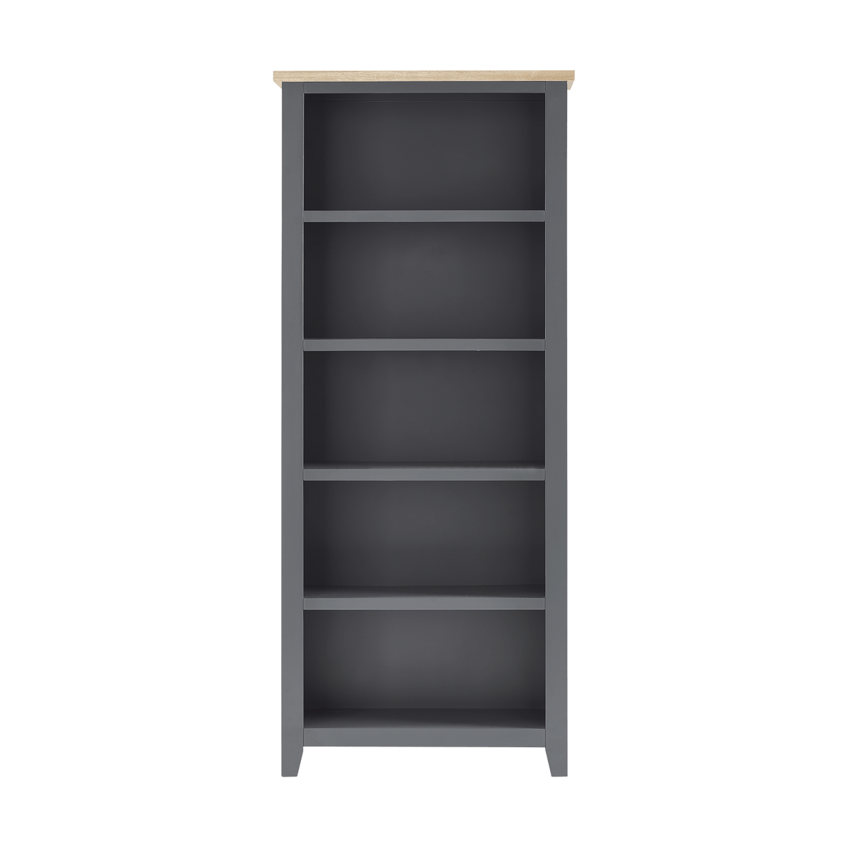 Introducing our Lyon tall bookcase, designed to seamlessly fit into any room with its sleek dark grey finish and natural wood top. Featuring five spacious shelves, it offers ample storage for books, decor, and more. Constructed from high-quality materials, this bookcase combines durability with contemporary style, perfect for modern homes.