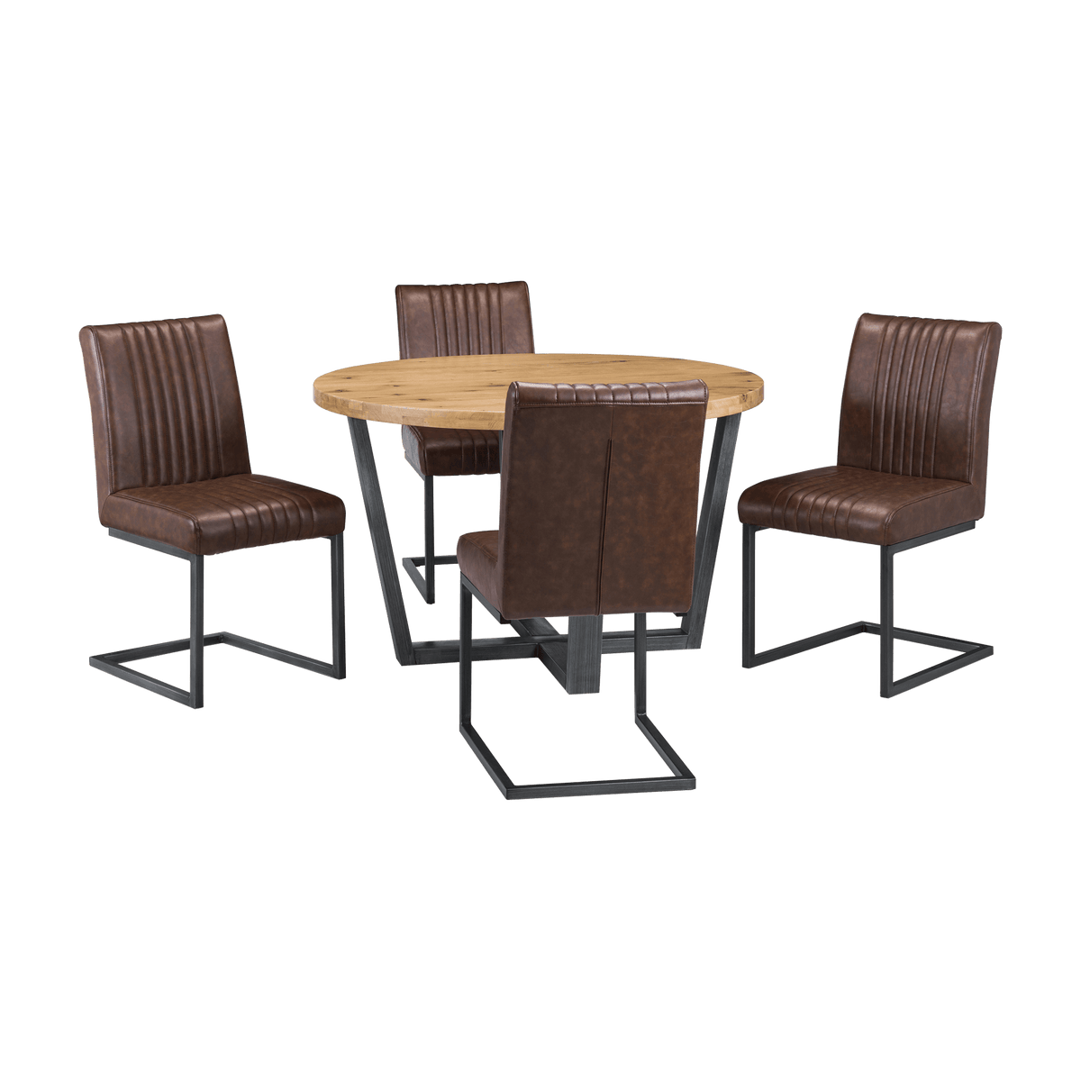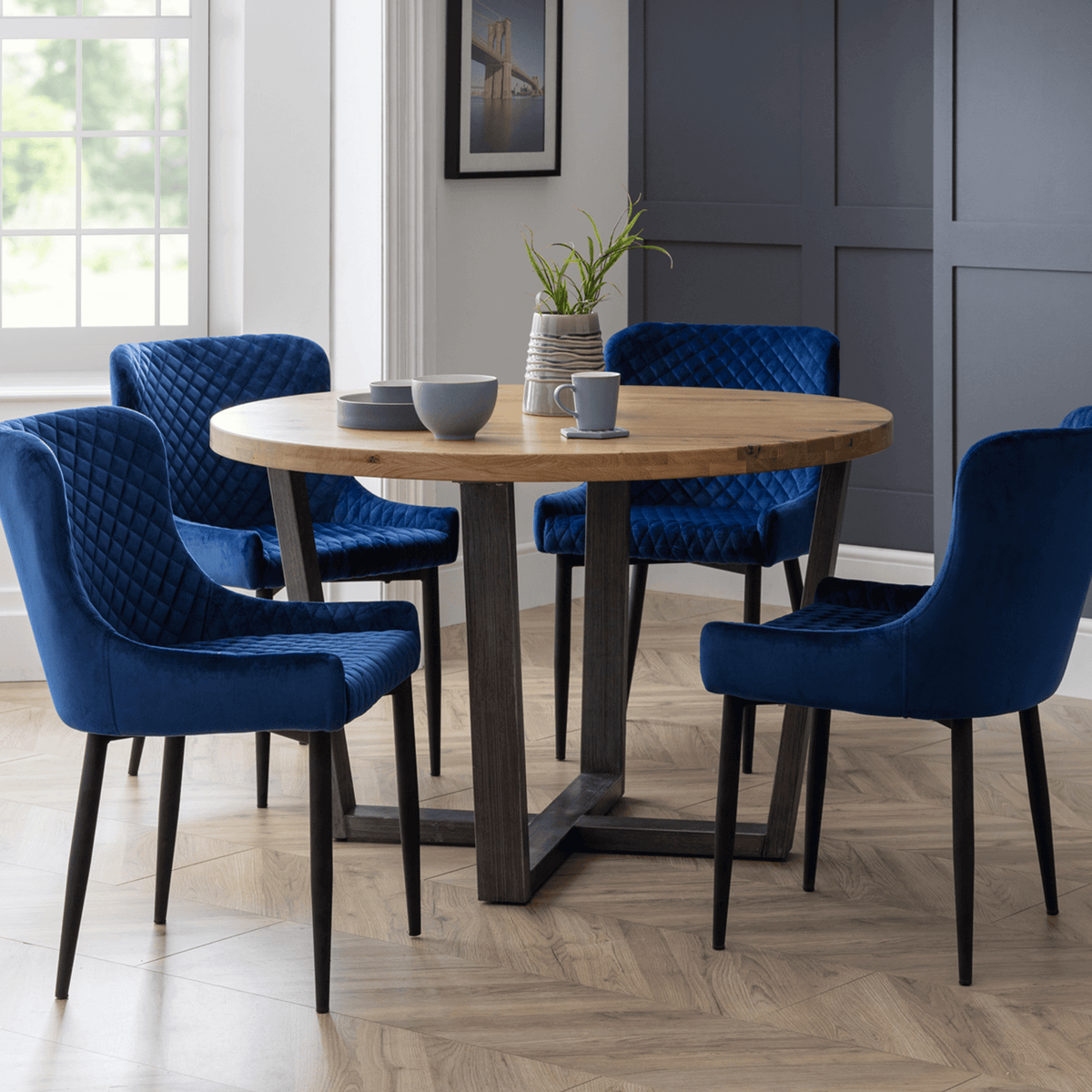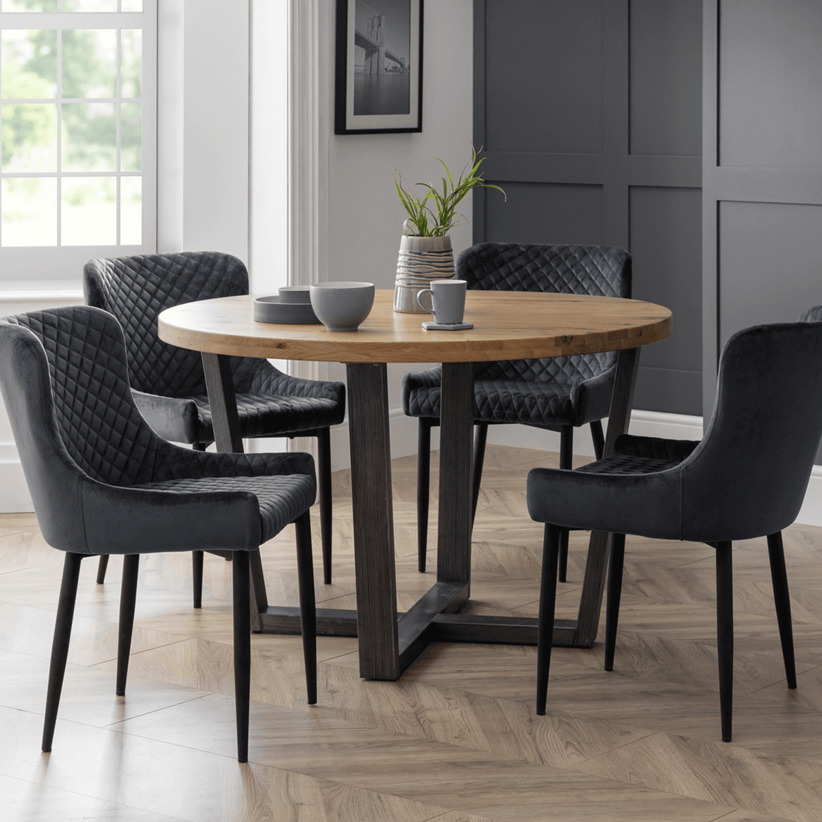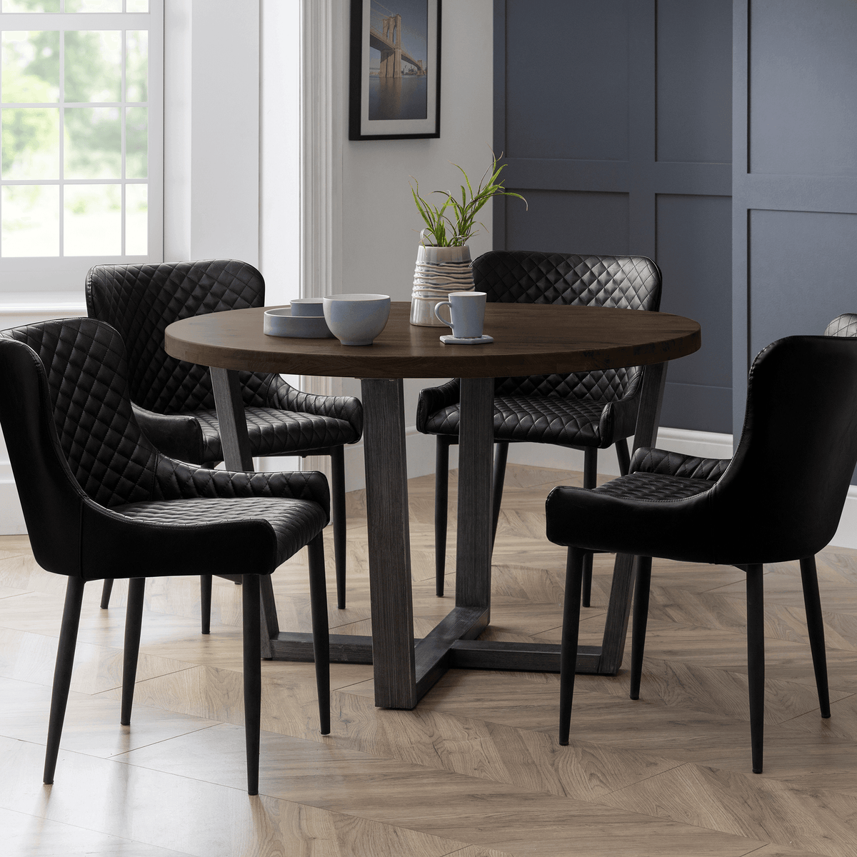 This elegant Madison round dining table is available in two stunning finishes: Natural and Dark Oak. Featuring a sleek metal base with a contemporary design, it offers both style and stability. Perfect for intimate gatherings or family meals, this table will elevate any dining space.