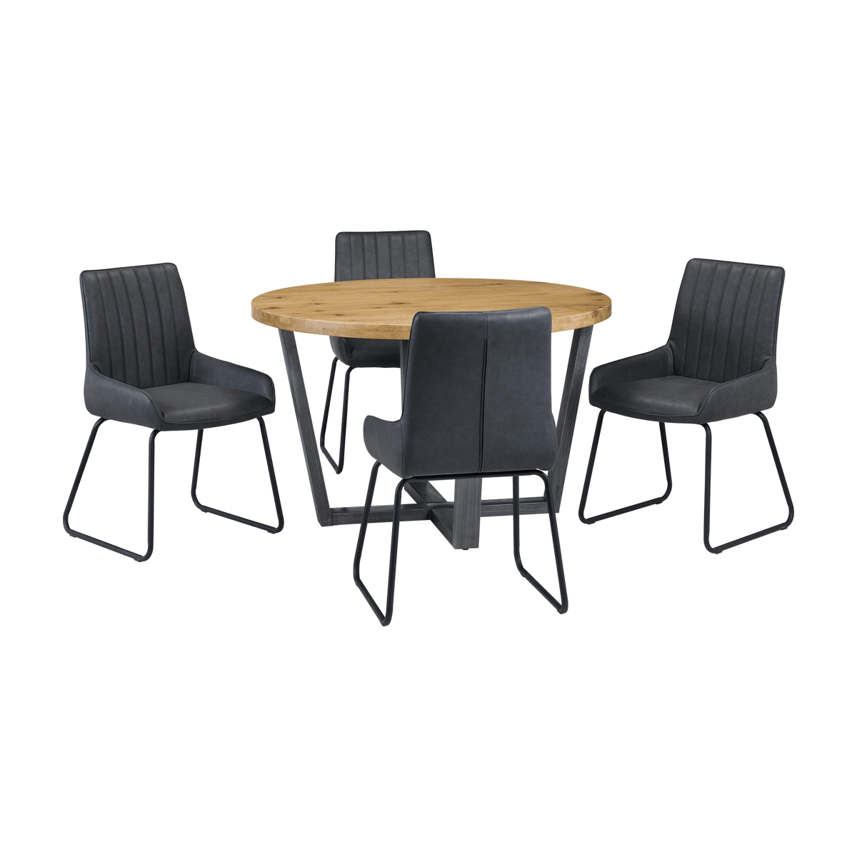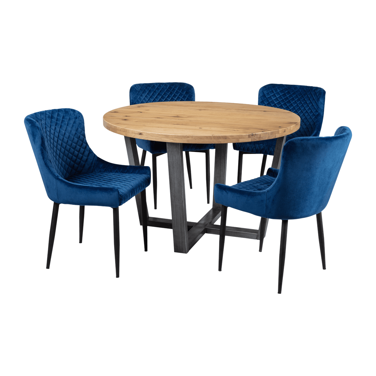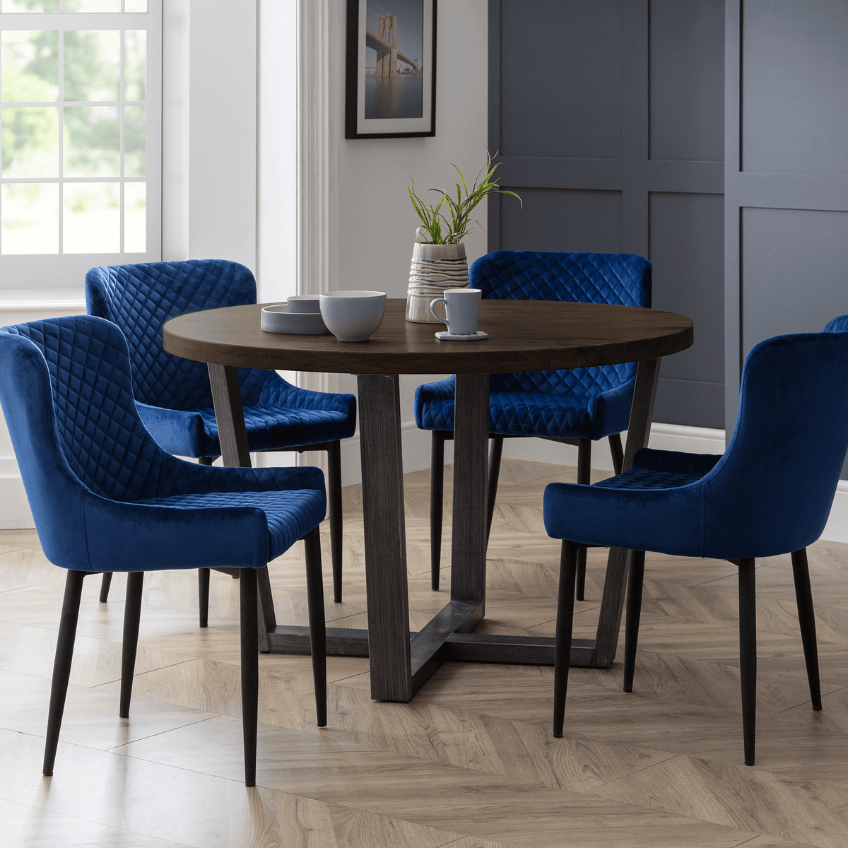 This elegant Madison round dining table is available in two stunning finishes: Natural and Dark Oak. Featuring a sleek metal base with a contemporary design, it offers both style and stability. Perfect for intimate gatherings or family meals, this table will elevate any dining space.