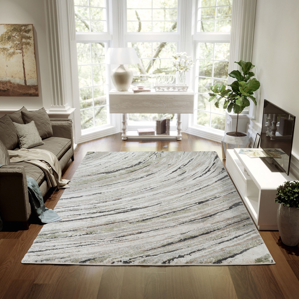 The Marble Wave- Green Cream Rug features sweeping curves in shades neutral tones like beige, grey, and black, accented by hints of green. The colours blend harmoniously, making it versatile for various interior styles, from contemporary to transitional.
