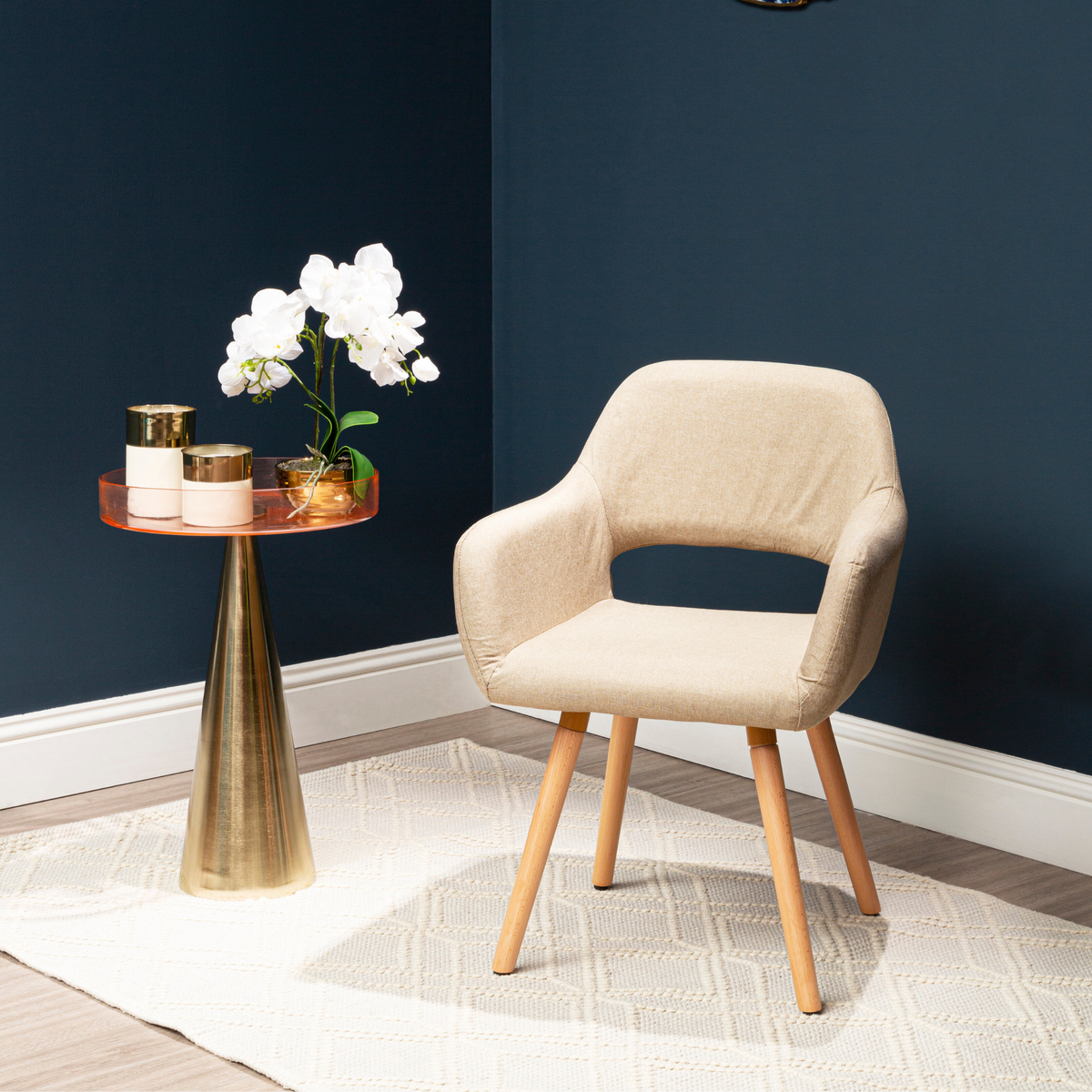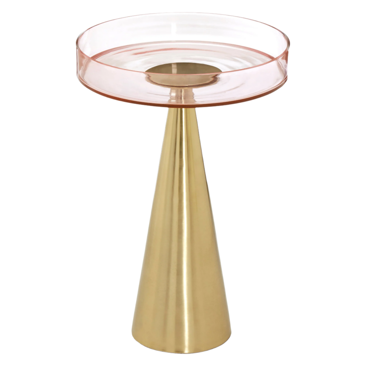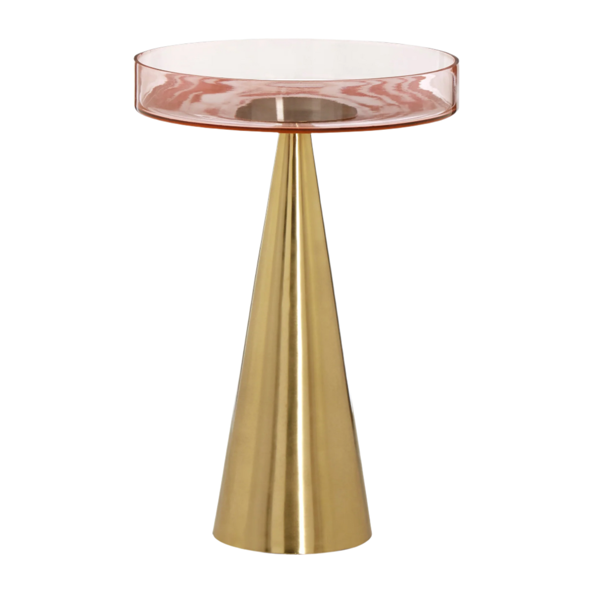 This table's round top is formed from pink-tinted glass creating a light and airy aesthetic. The sculptural base in gold finish gently tapers upwards to create a striking conical design.