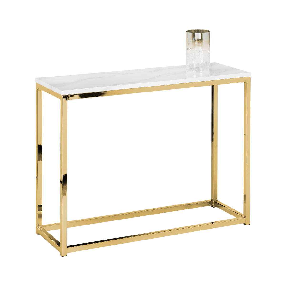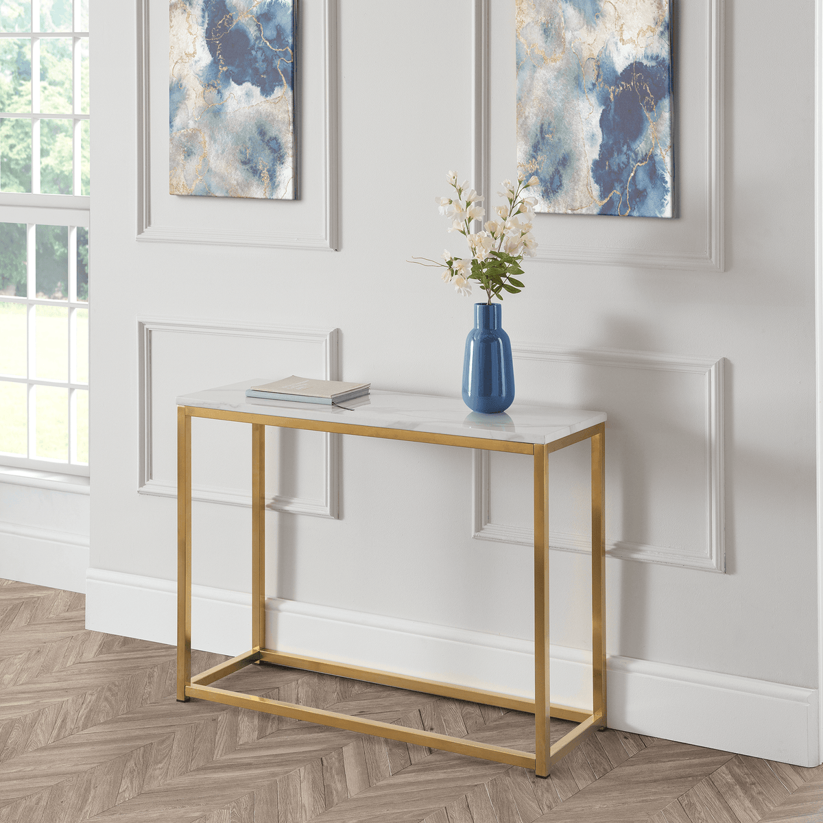 Add a touch of elegance to your hallway or living area with the Matteo White Marble Console Table. This stunning piece showcases a white marble surface atop graceful gold metal legs, creating a look that is both modern and timeless. Perfect for homeowners who desire a luxurious entryway or a stylish accent piece.
