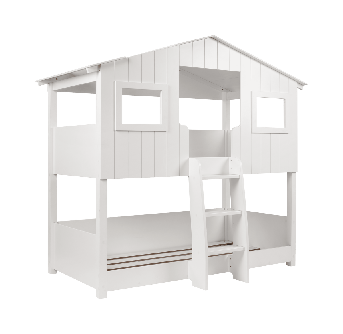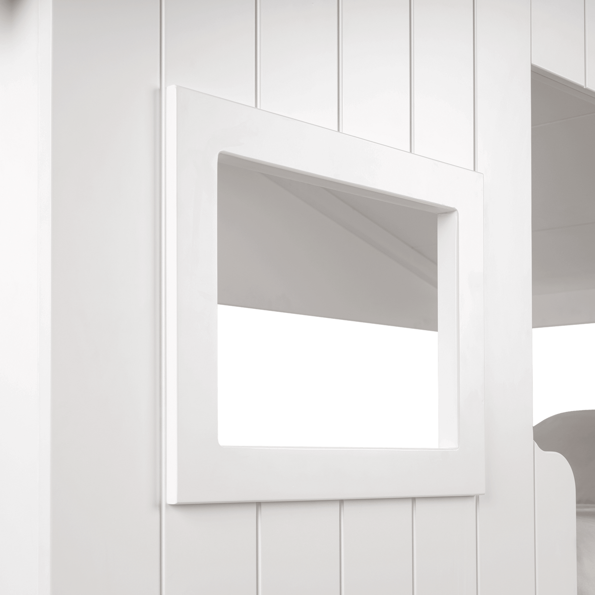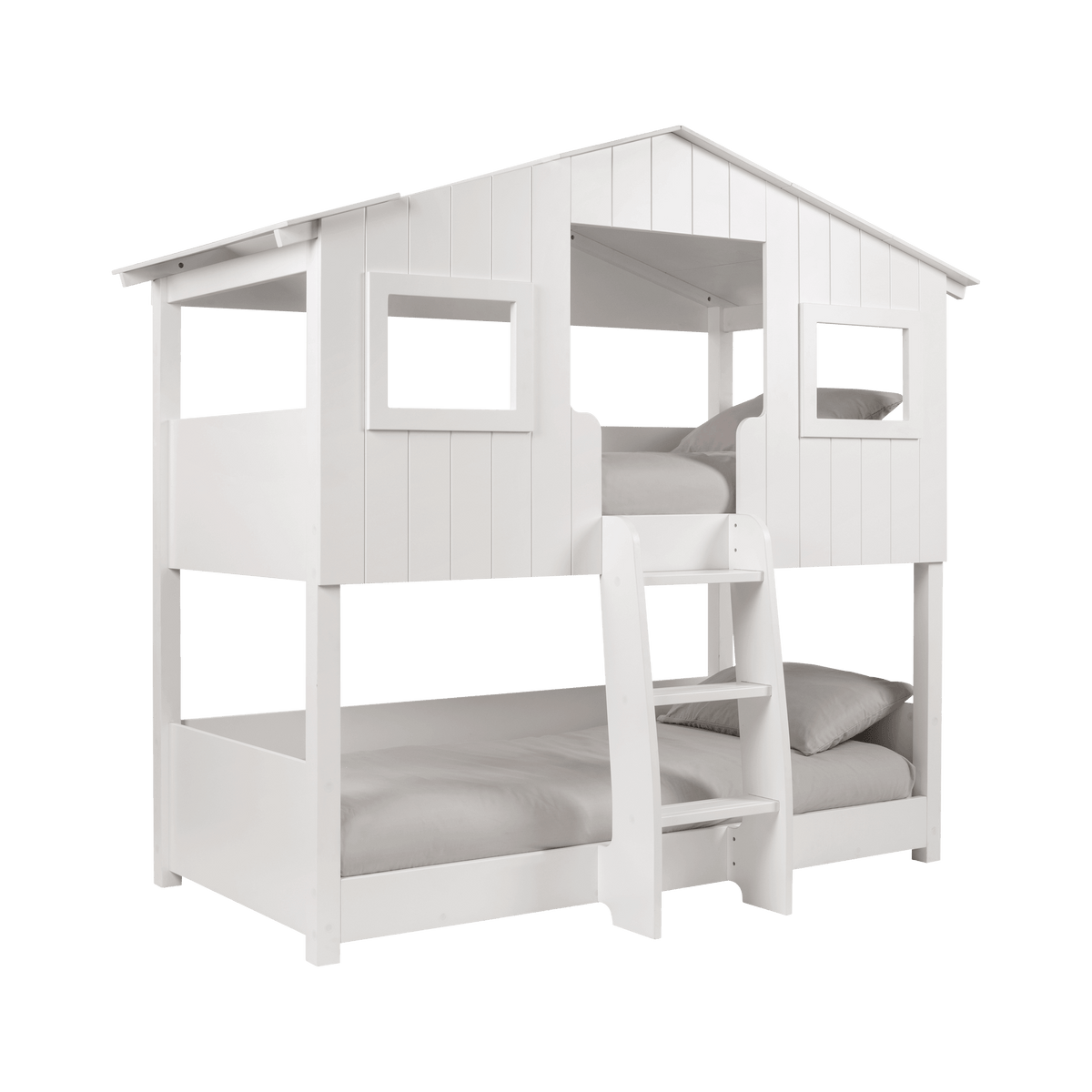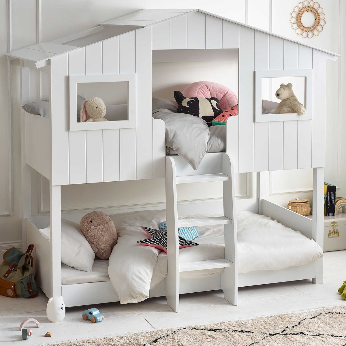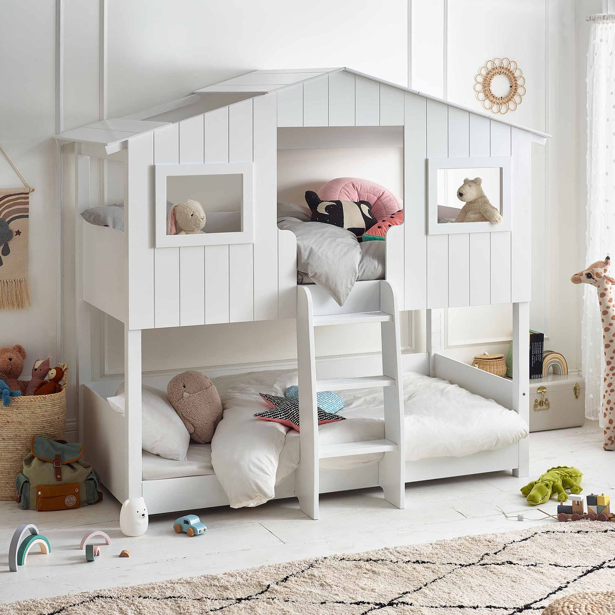 Its charming treehouse aesthetic, featuring playful windows and an easy-to-climb ladder, sparks creativity and invites endless adventures, making it a favourite spot for children. The elevated top bunk provides a cosy space for sleeping, while the bottom area doubles as an extra bed or a fun nook for reading and play.