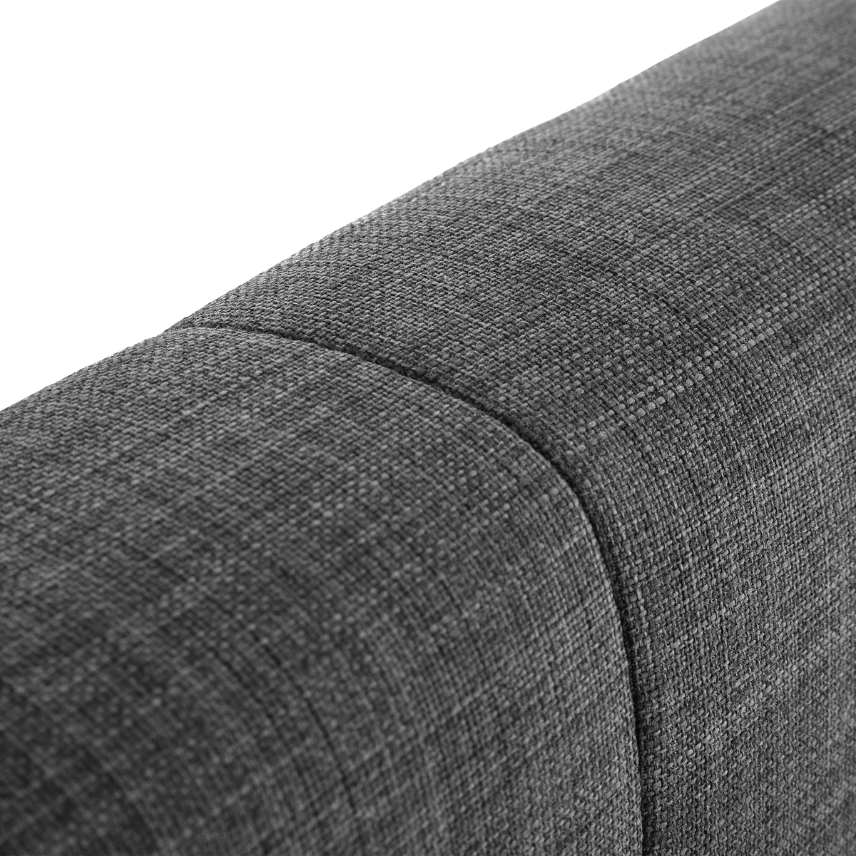 The bed is upholstered in a sophisticated slate grey linen fabric, providing a neutral and stylish look. The contemporary high headboard features diamond-shaped button detailing, adding a touch of luxury that complements various bedroom decors.