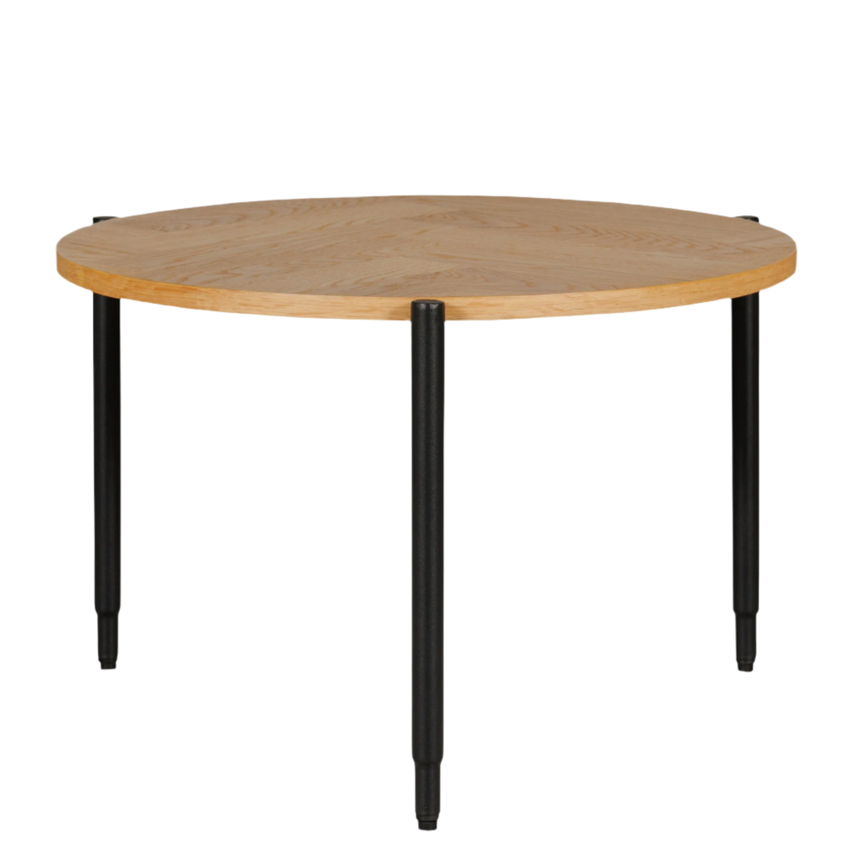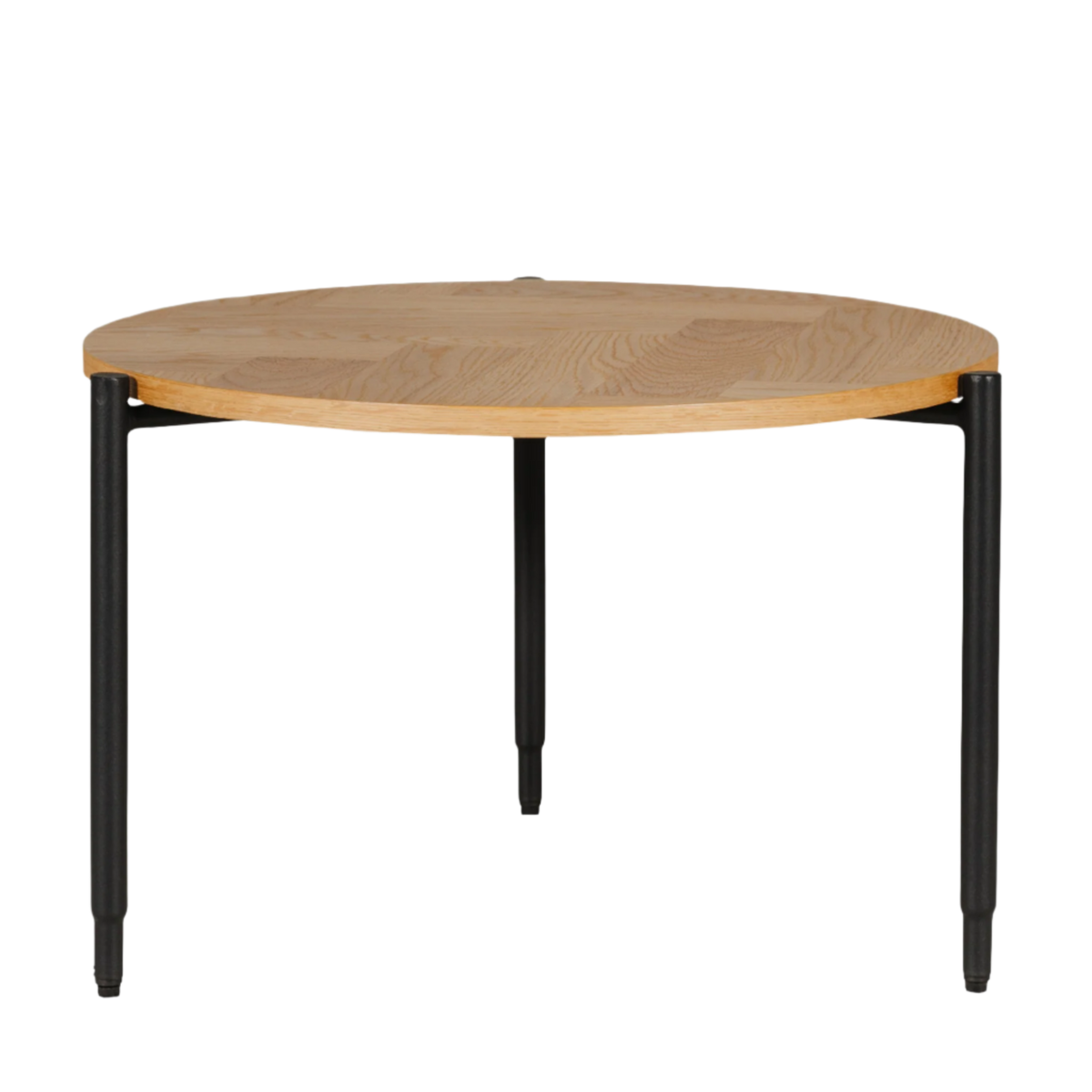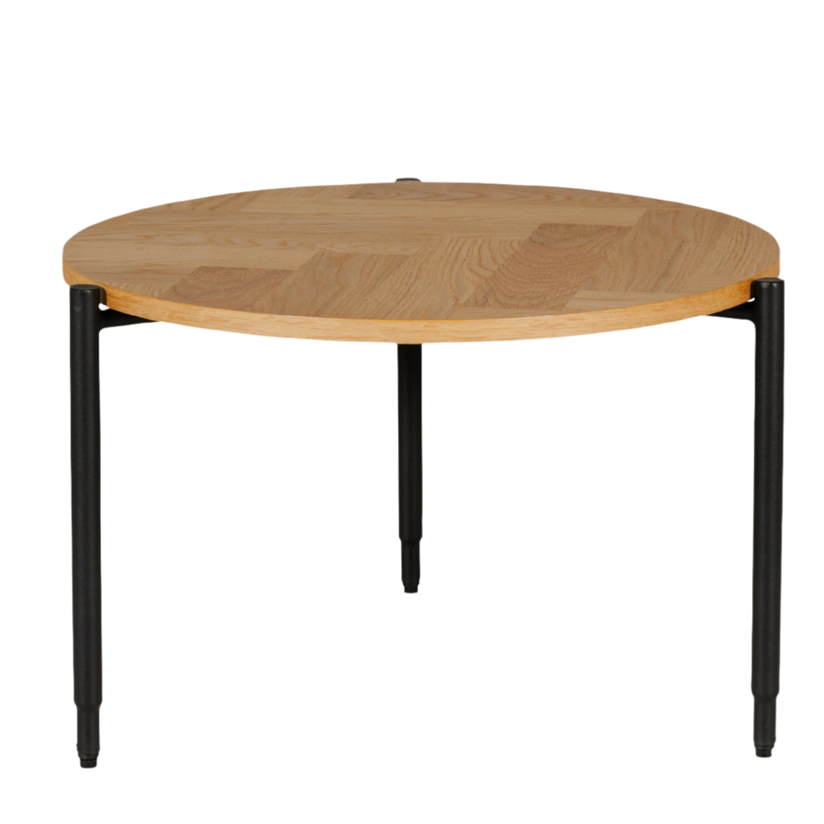 Nathan Lamp Table in Natural Oak features a contemporary design with a distinctive parquet-style top, crafted from engineered wood. The natural oak finish enhances its modern appeal, while the black powder-coated metal legs add a sleek, industrial touch. This lamp table is both stylish and functional, providing a sophisticated surface for your lamps or decorative items while seamlessly fitting into various interior styles.