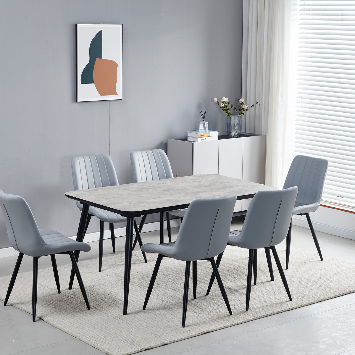 This modern dining set features a rectangular table with a grey marble effect top and six chairs with grey upholstered seats. The set exudes a contemporary and stylish aesthetic with its clean lines and contrasting materials. The black metal legs of the table and chairs provide a sturdy foundation, while the curved design adds a touch of elegance. The upholstered seats offer a comfortable and stylish seating experience. The overall style of the set is versatile, making it a suitable choice for various home decor styles.