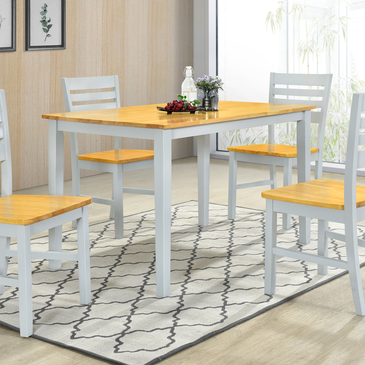 This modern dining set features a rectangular wooden table and four chairs. The set offers a stylish and comfortable dining experience. The table's clean lines and grey finish create a contemporary look, while the warm oak wood top adds a touch of natural warmth. The chairs' comfortable design and combination of grey and oak finishes complement the table's aesthetic. The overall style of the set is versatile, making it suitable for various home decor styles.