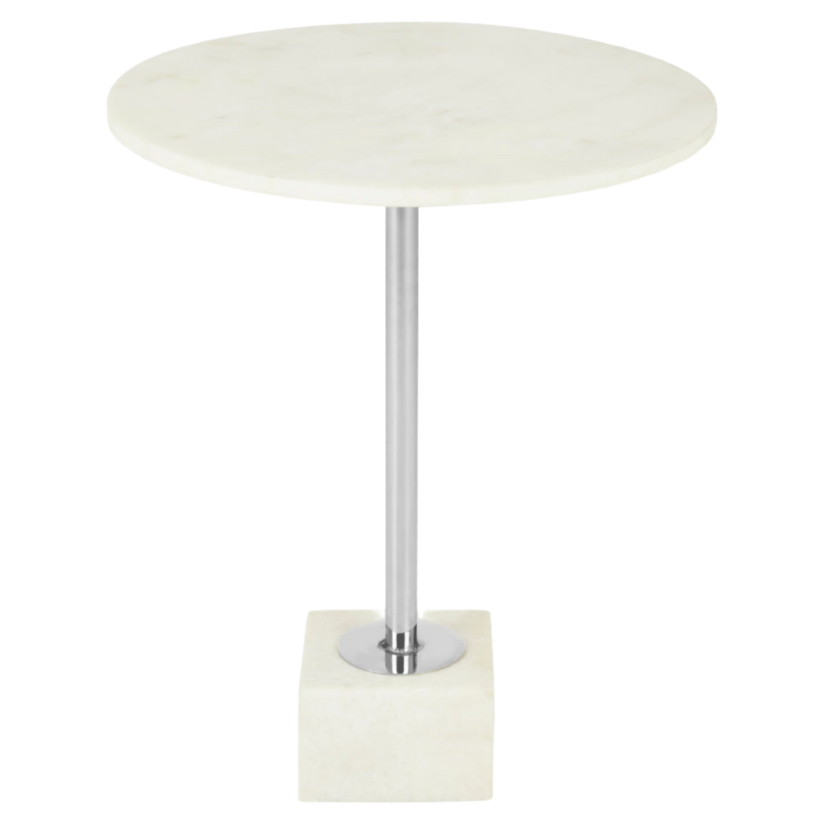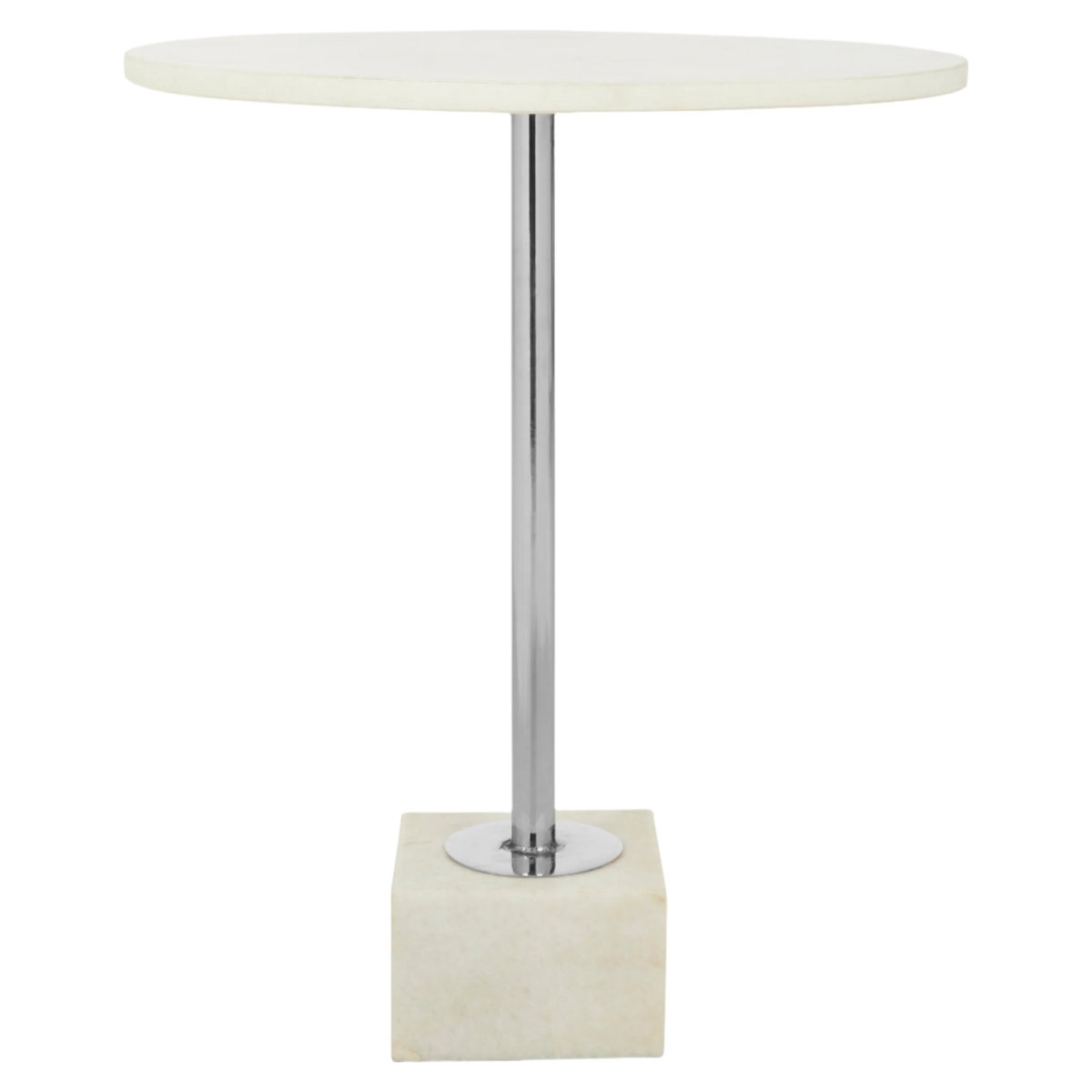 The Rabia side table is a contemporary luxe accent piece with a unique cube-shaped base. The table's frame is formed from smooth steel and features a nickel finish that enhances its luxe appeal. The table's simplistic top is created from a round plane.