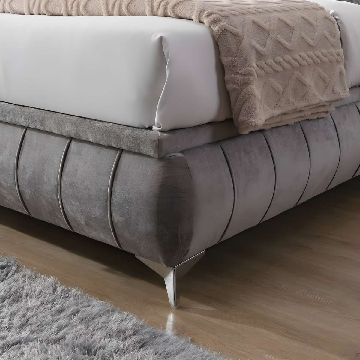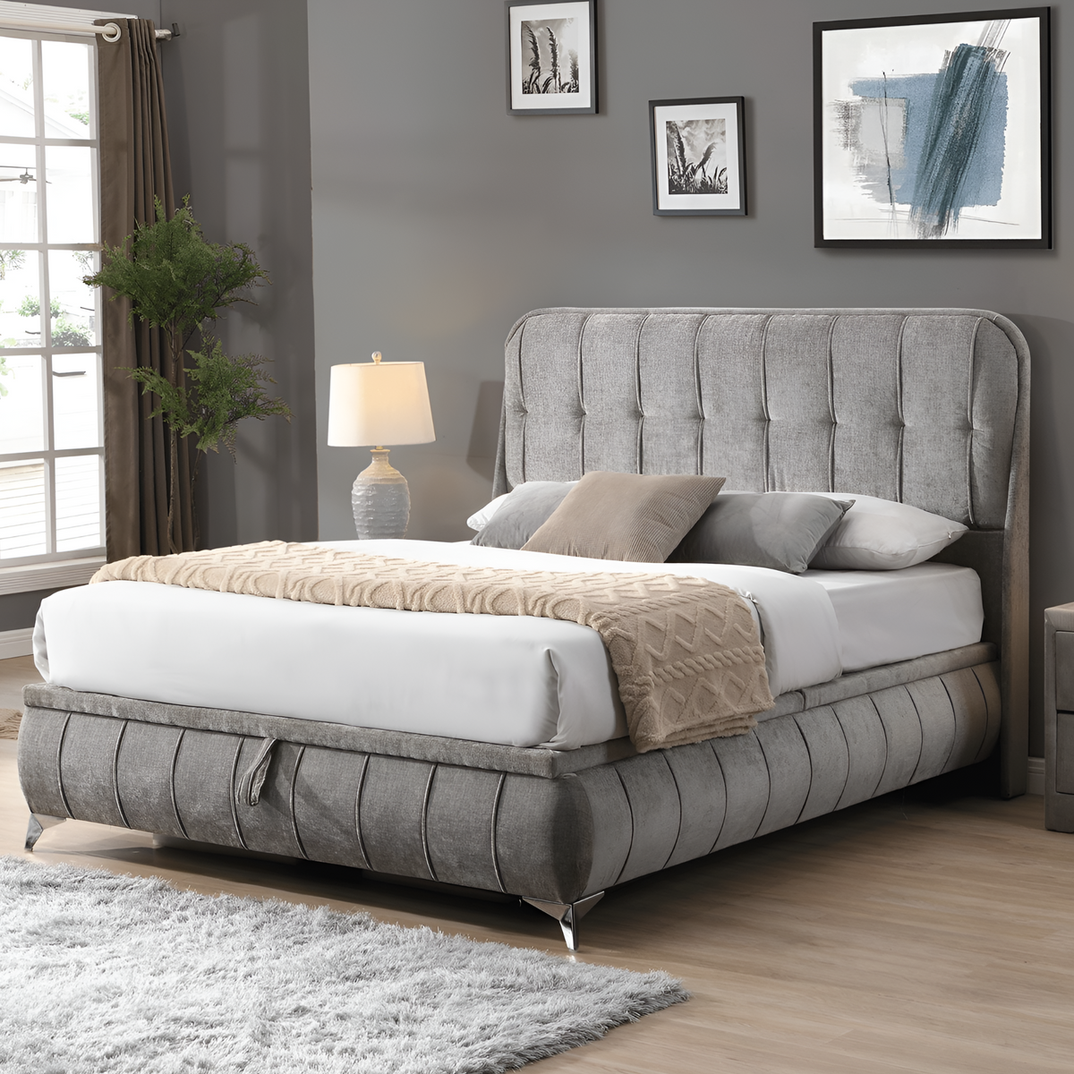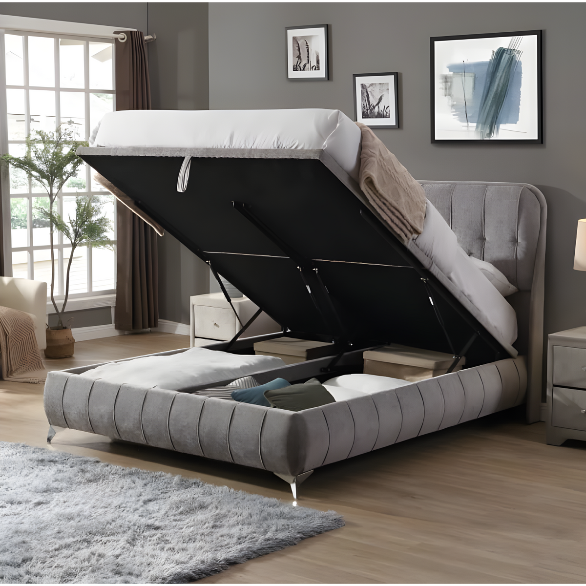 Introducing the River, a luxurious bed combining sleek grey velvet with a sturdy base and supports. Ideal for all your bedroom storage needs with a highly functional gas-lift mechanism to allow a variety of items to be stored under the mattress. Coming in both 4ft6 and 5ft models, the River is the perfect option to declutter your space.