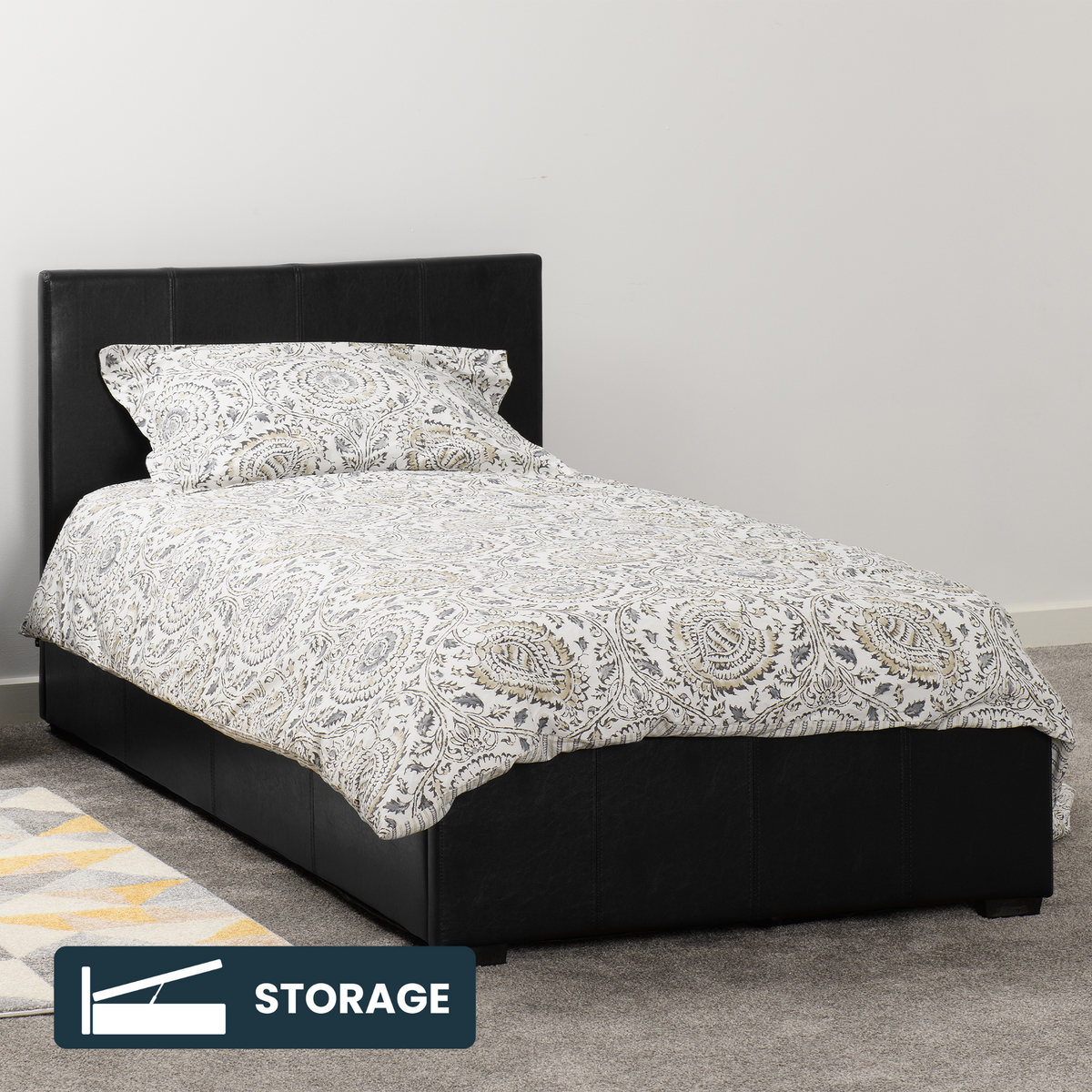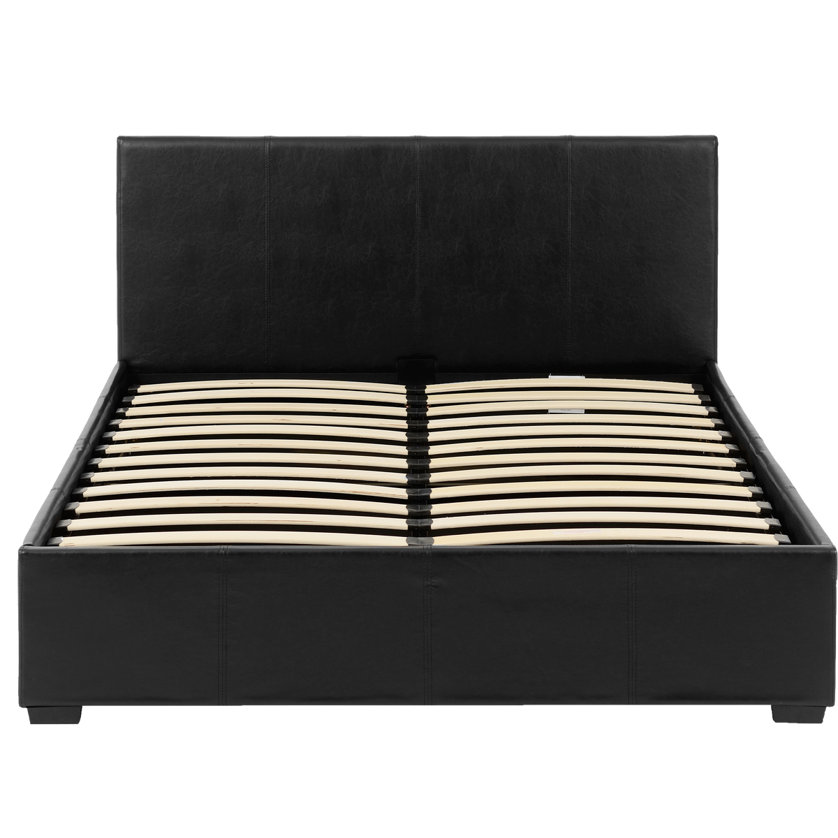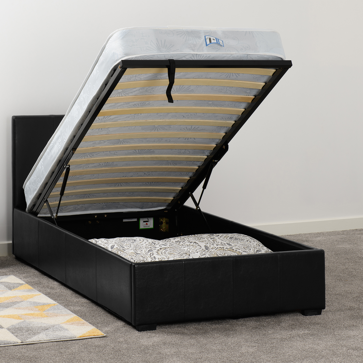 The Russell Ottoman Storage Bedframe is available in two luxurious finishes: Black Faux Leather for a sleek, modern look. The bed features laminated sprung slats paired with plastic slat caps, providing durable mattress support and enhancing comfort.
