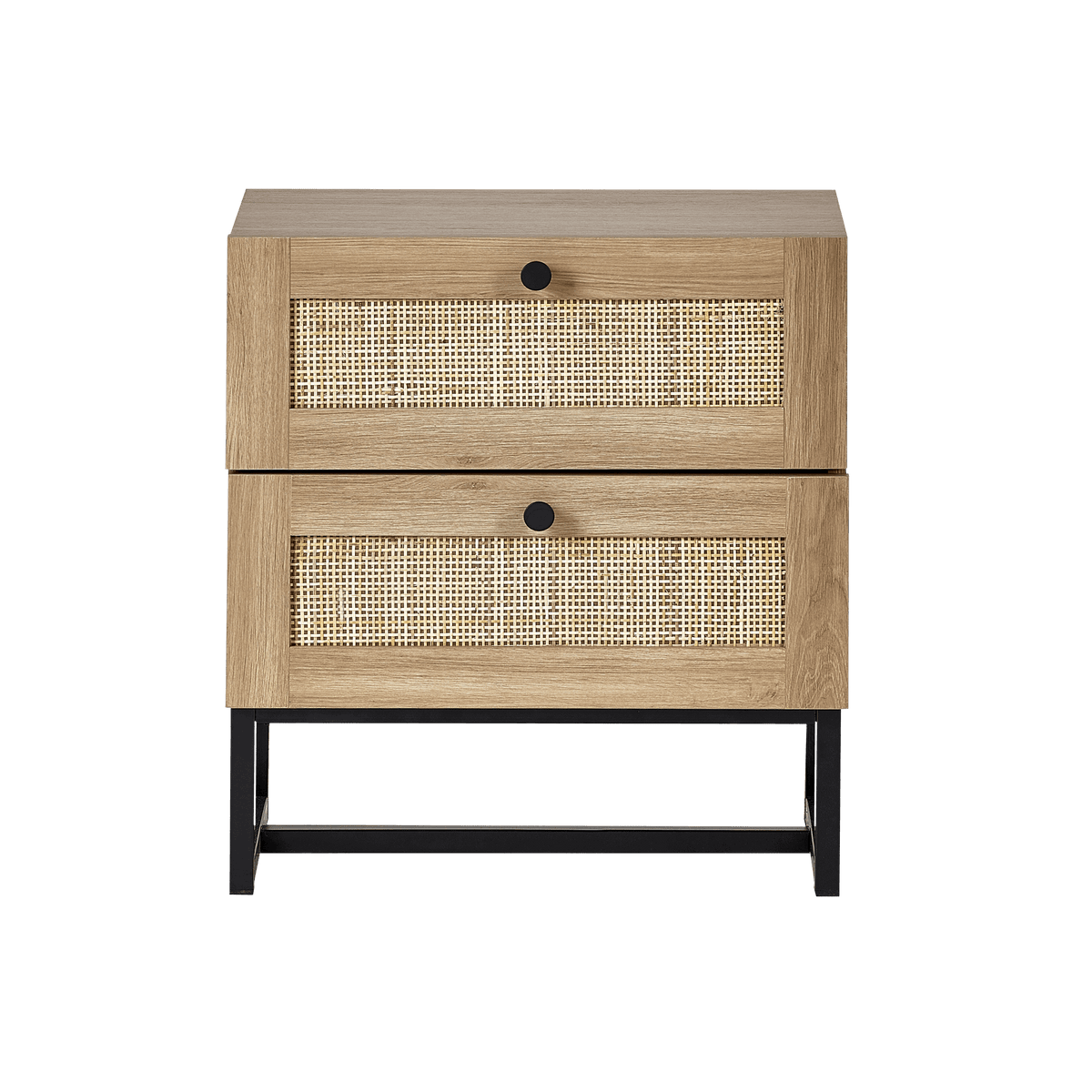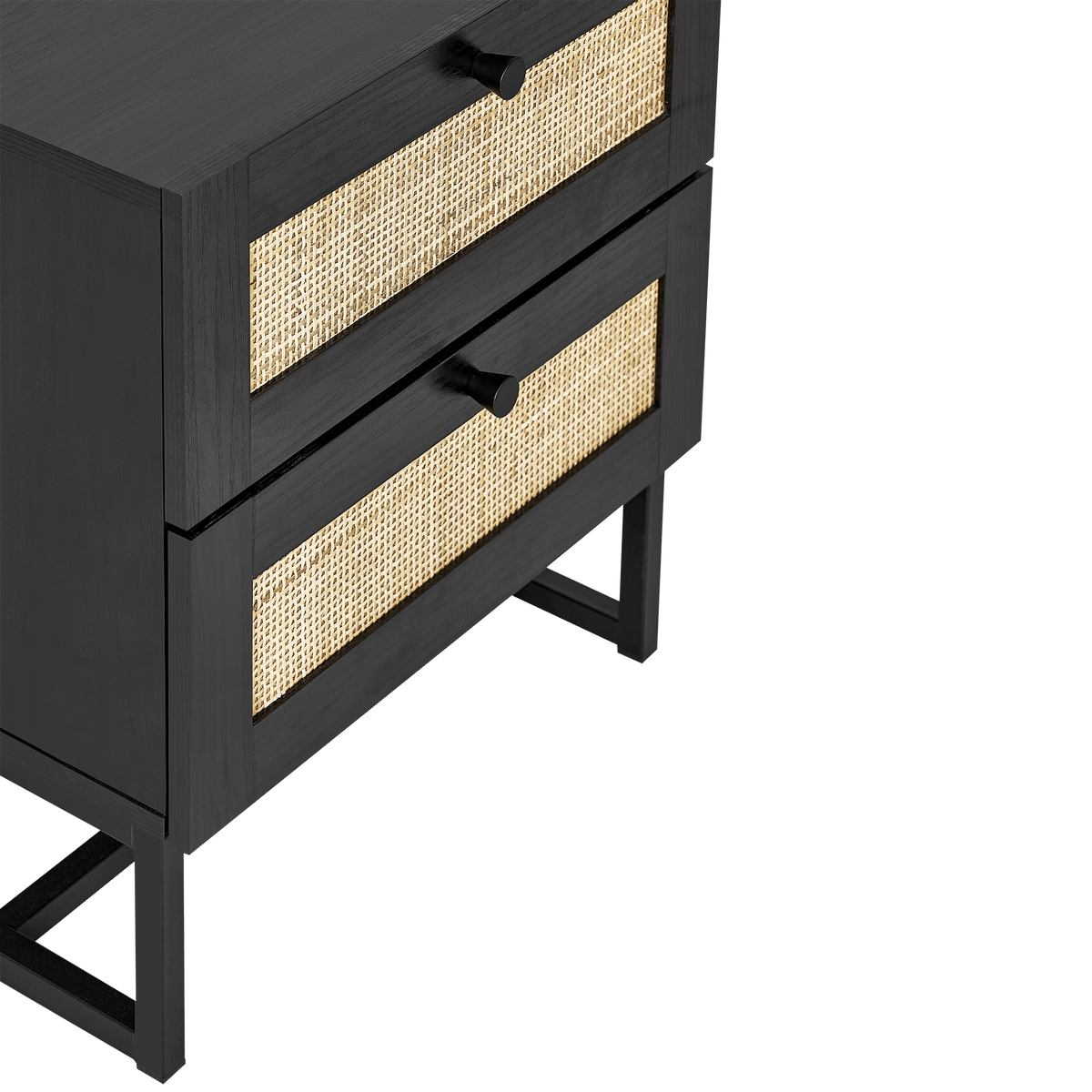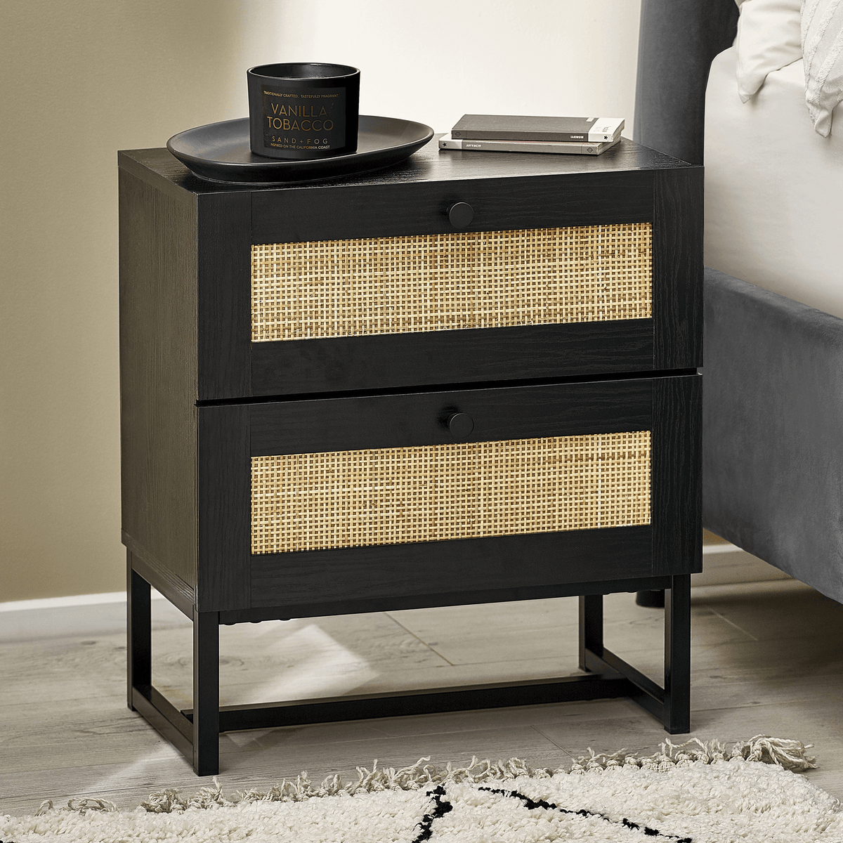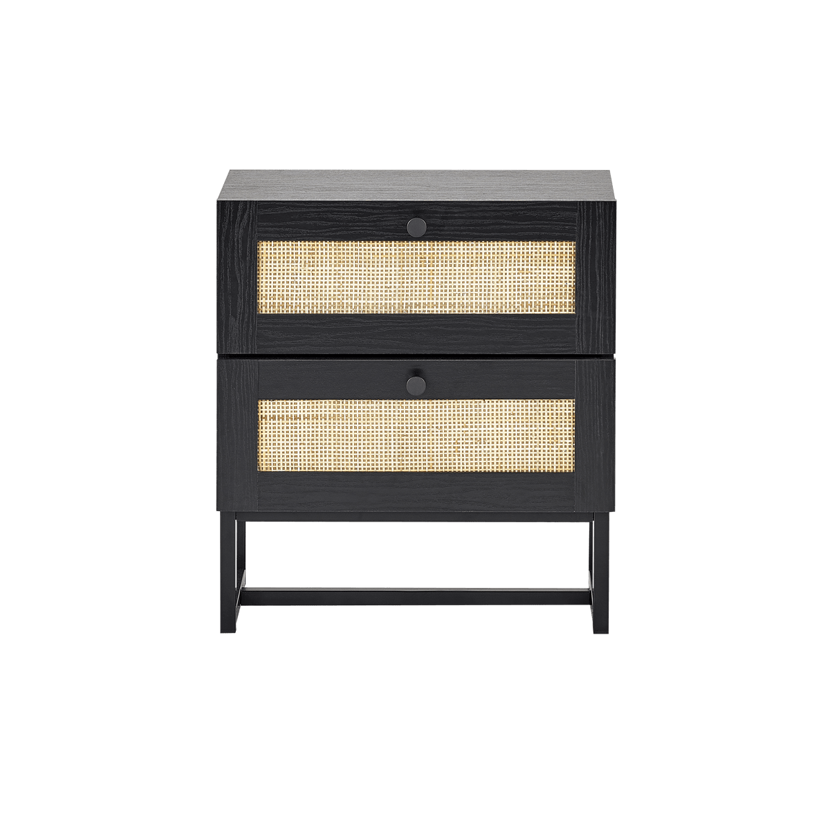 Upgrade your bedroom with this elegant Soho bedside table, showcasing a contemporary wood finish with chic cane accents. Available in natural wood and sleek black, it features two spacious drawers for ample storage, supported by a sturdy black metal base. Perfect for combining style and functionality in any modern space.