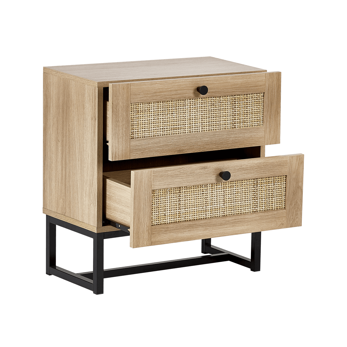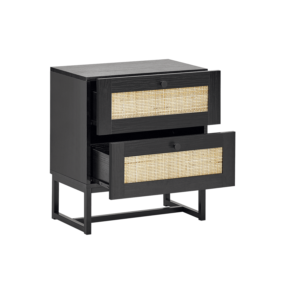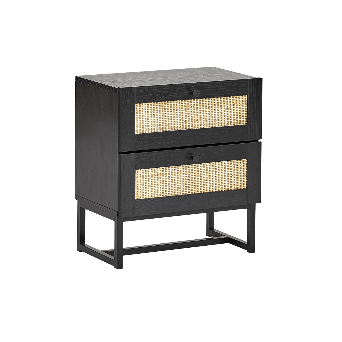 Upgrade your bedroom with this elegant Soho bedside table, showcasing a contemporary wood finish with chic cane accents. Available in natural wood and sleek black, it features two spacious drawers for ample storage, supported by a sturdy black metal base. Perfect for combining style and functionality in any modern space.