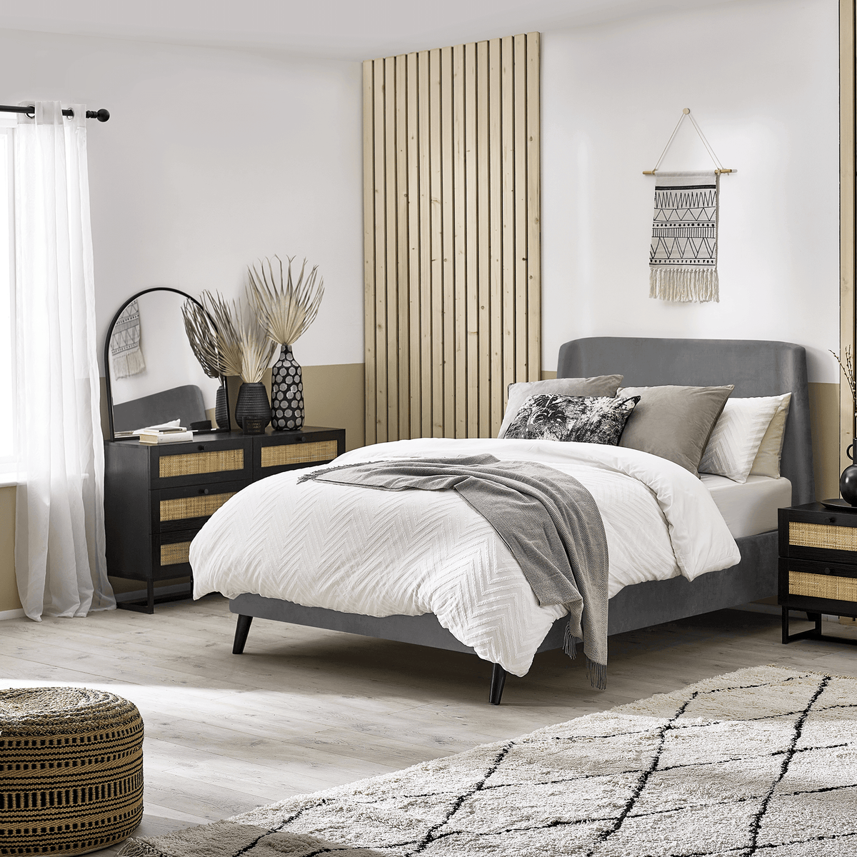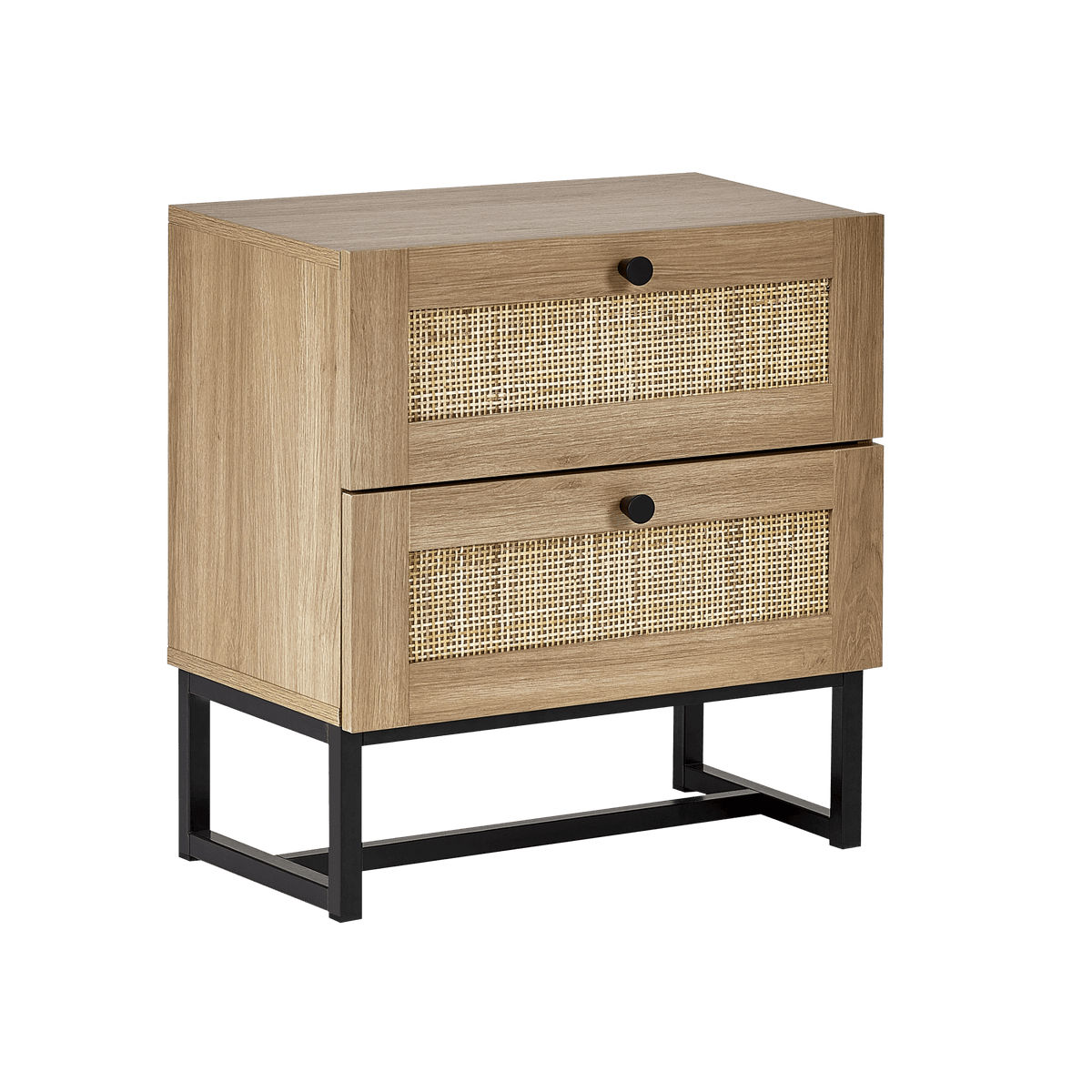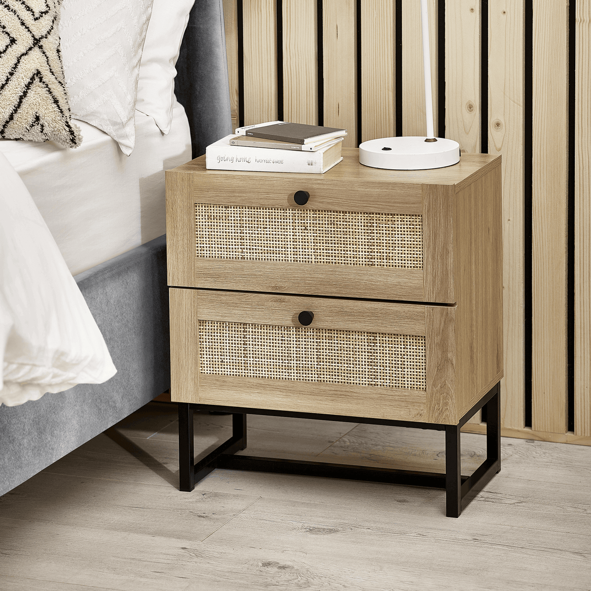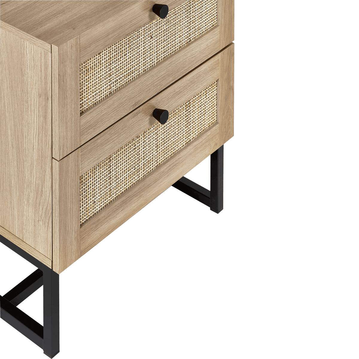 Upgrade your bedroom with this elegant Soho bedside table, showcasing a contemporary wood finish with chic cane accents. Available in natural wood and sleek black, it features two spacious drawers for ample storage, supported by a sturdy black metal base. Perfect for combining style and functionality in any modern space.