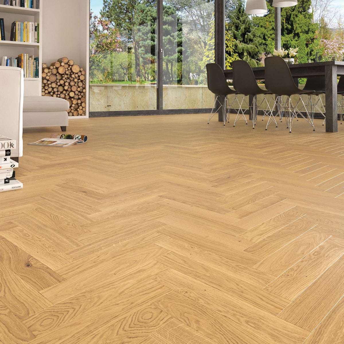 A 4mm oak veneer top layer preserves the solid wood look and allows for refinishing when necessary. With an 18mm thickness, it offers a stable, comfortable feel underfoot. The glue-down installation ensures a secure fit, ideal for maintaining herringbone precision.