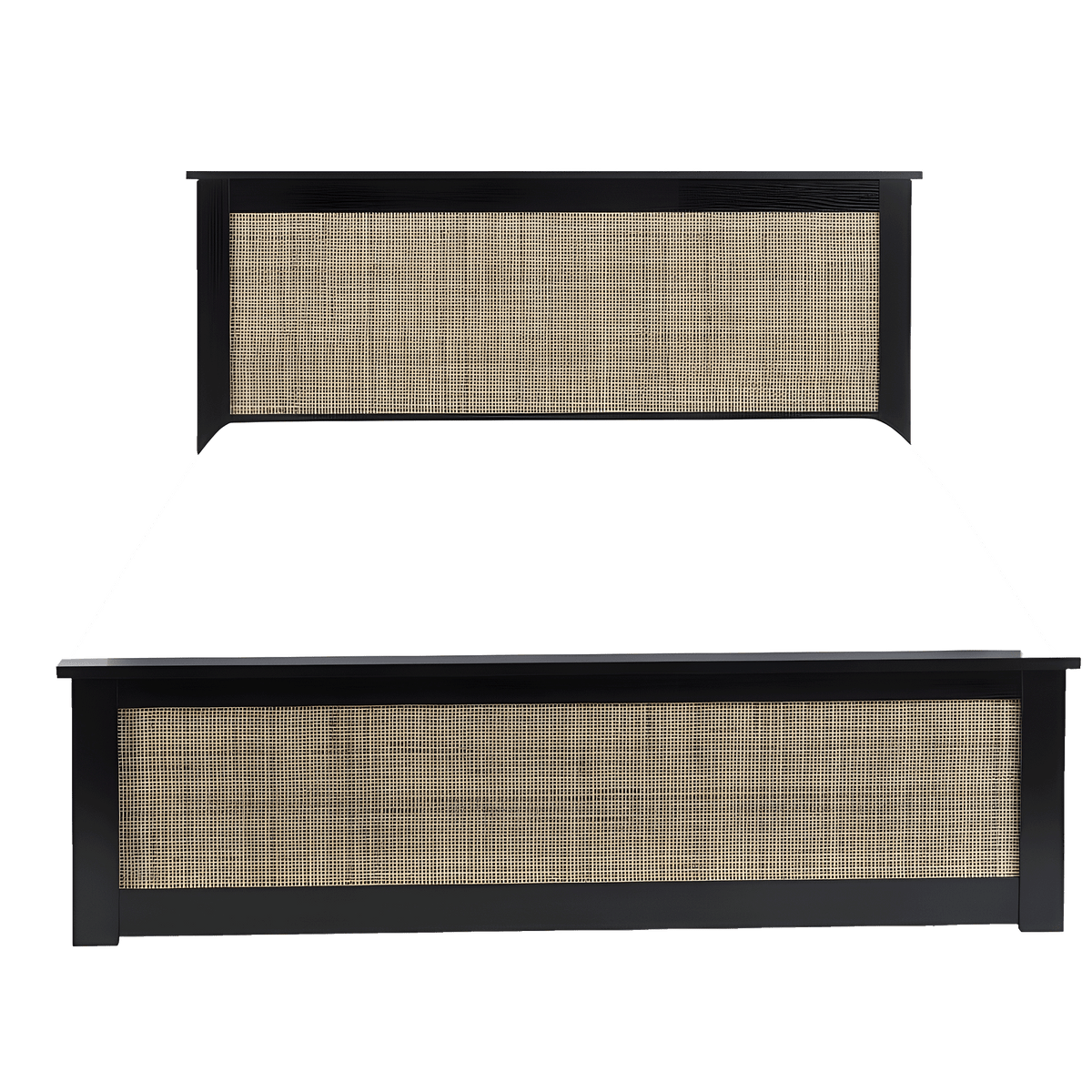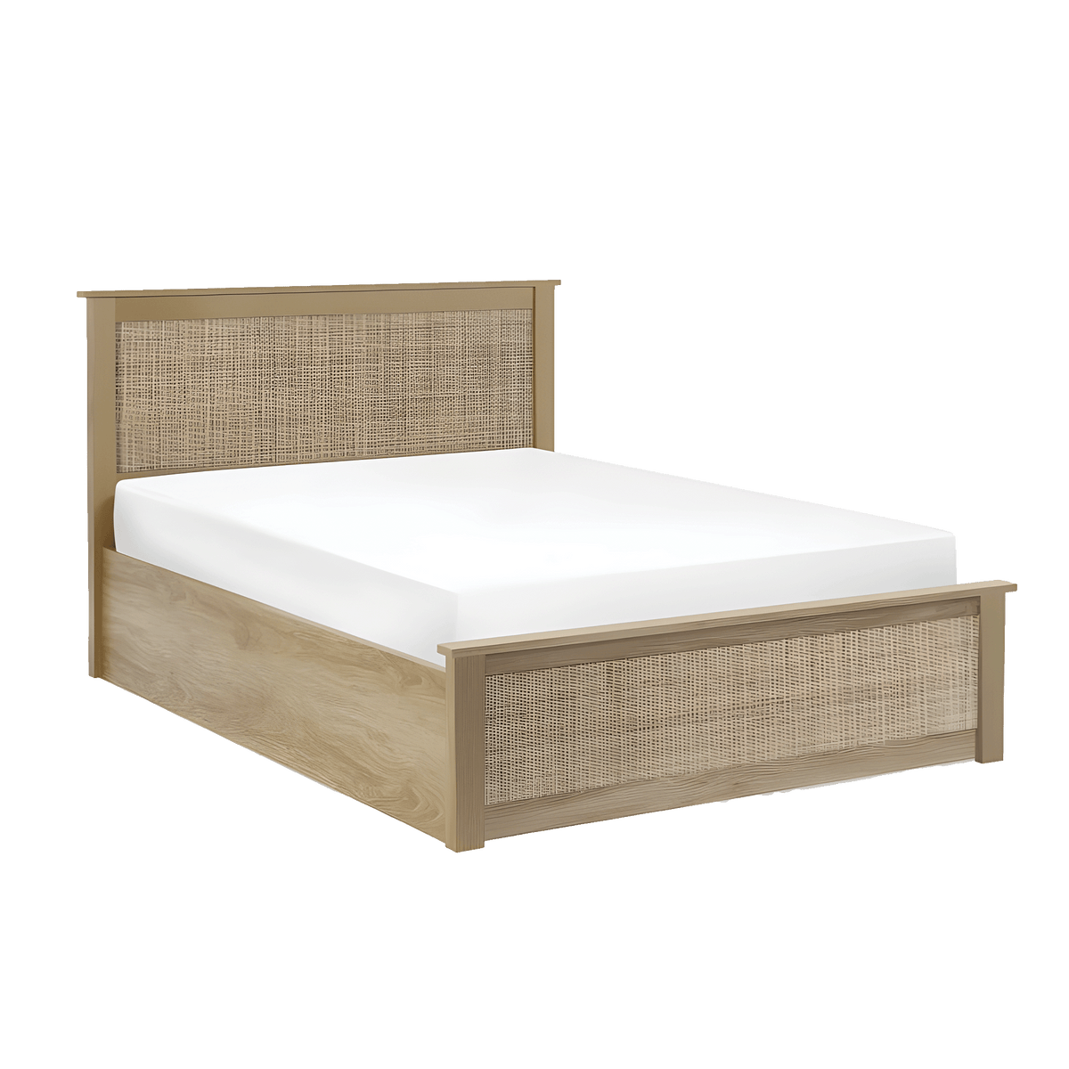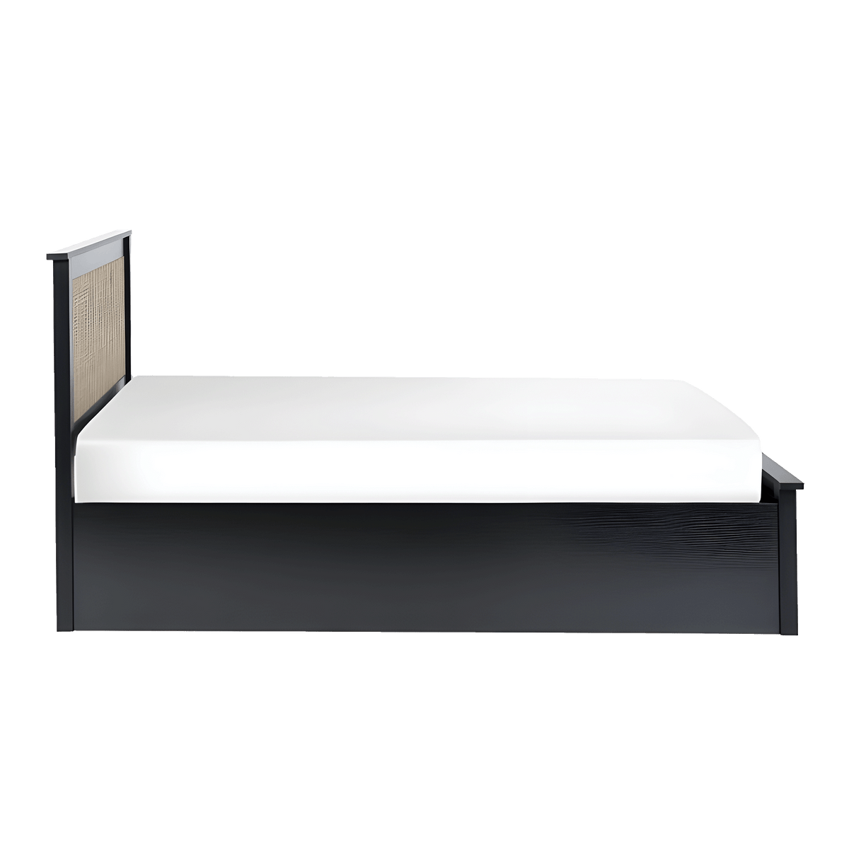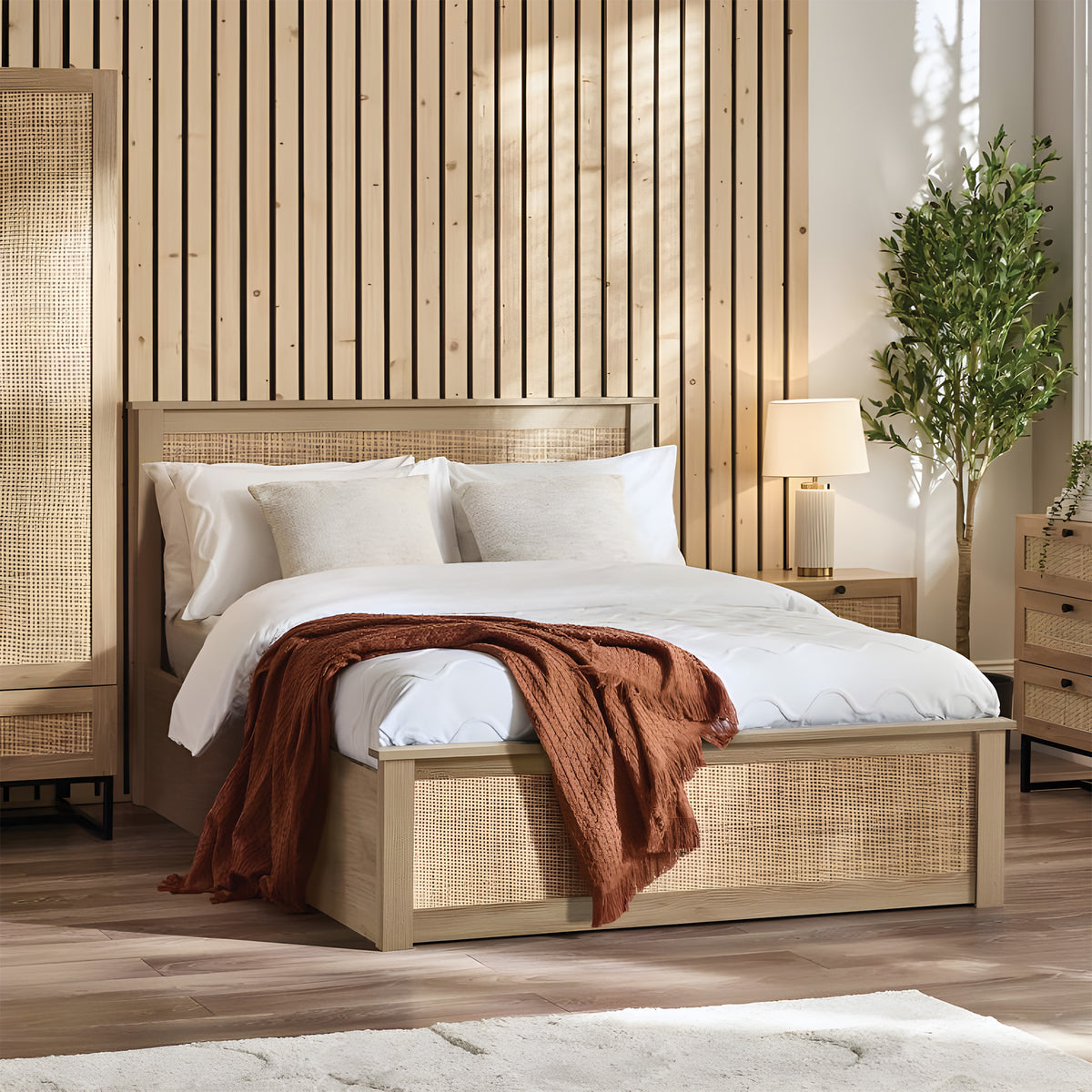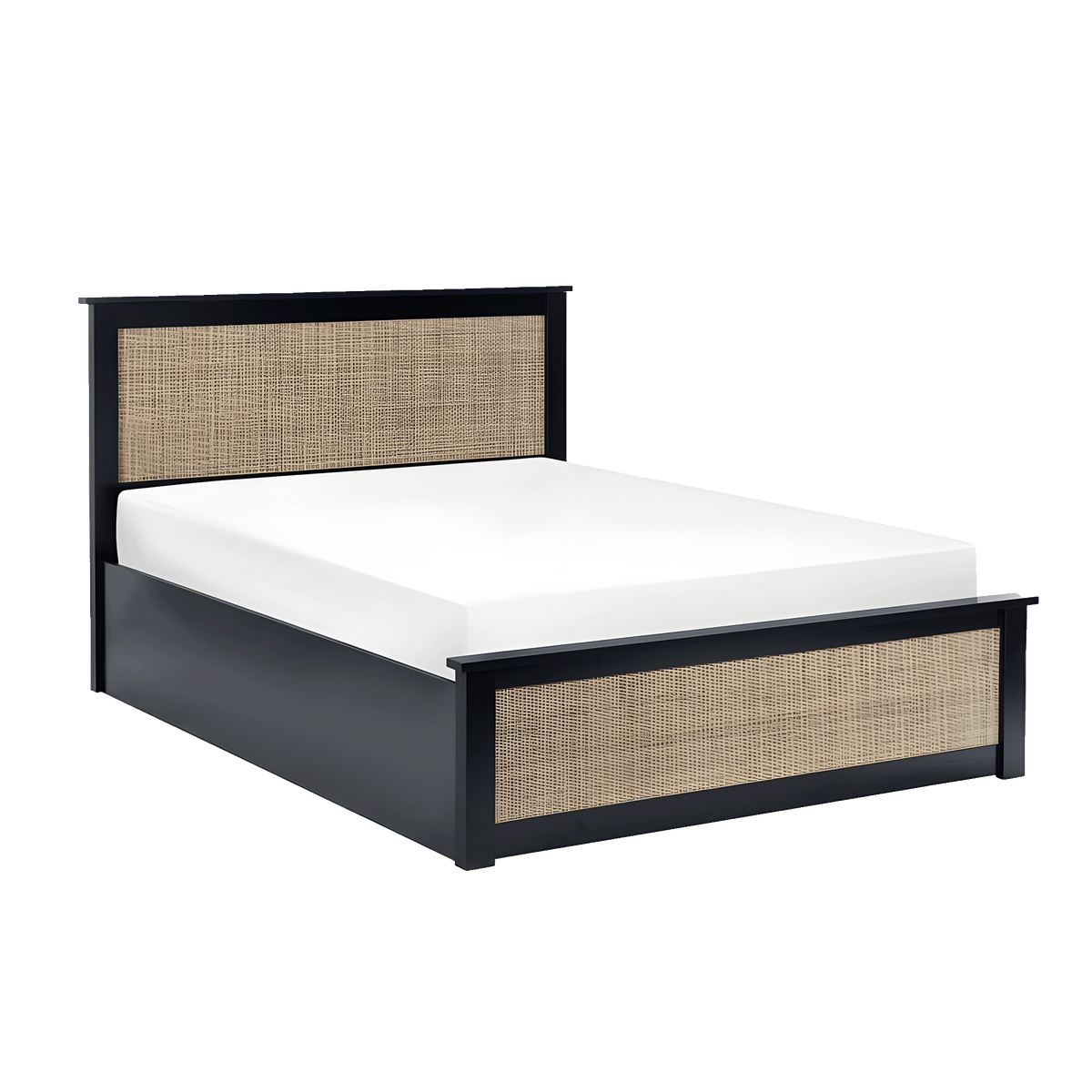 This bed features an elegant design, highlighted by intricate woven rattan detailing on the headboard, adding a touch of natural texture and warmth. The bold, striking finish complements a wide range of bedroom styles, bringing a modern yet timeless look that effortlessly enhances any space.