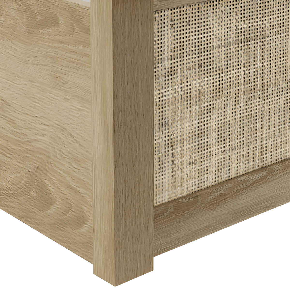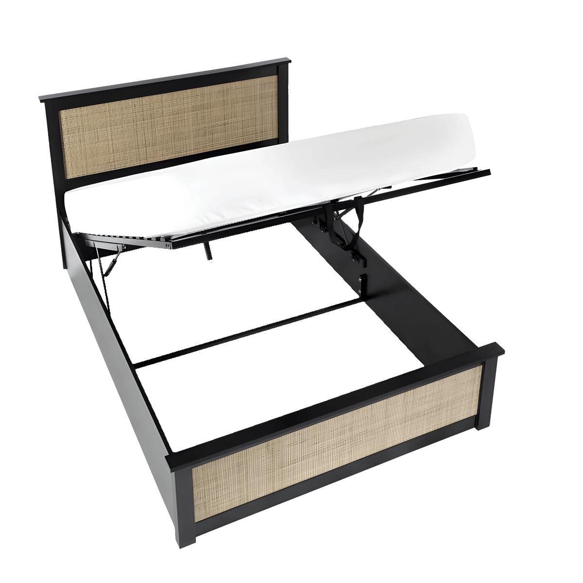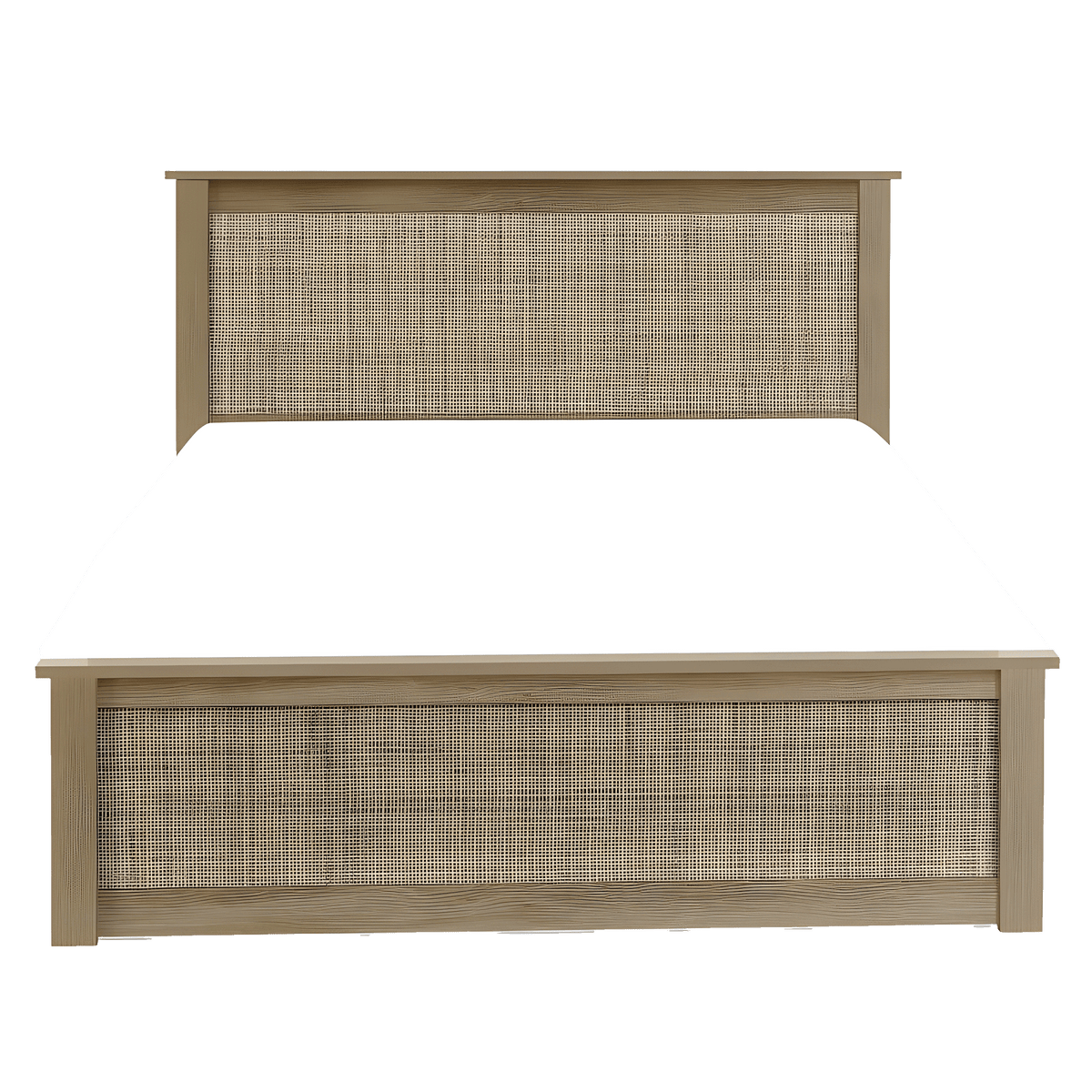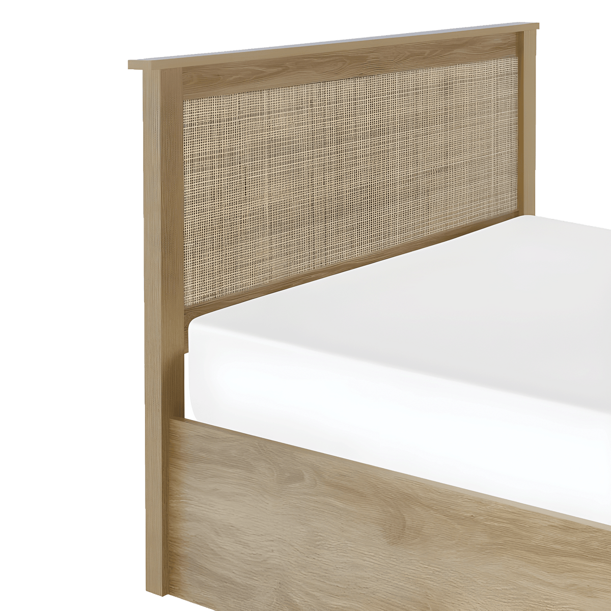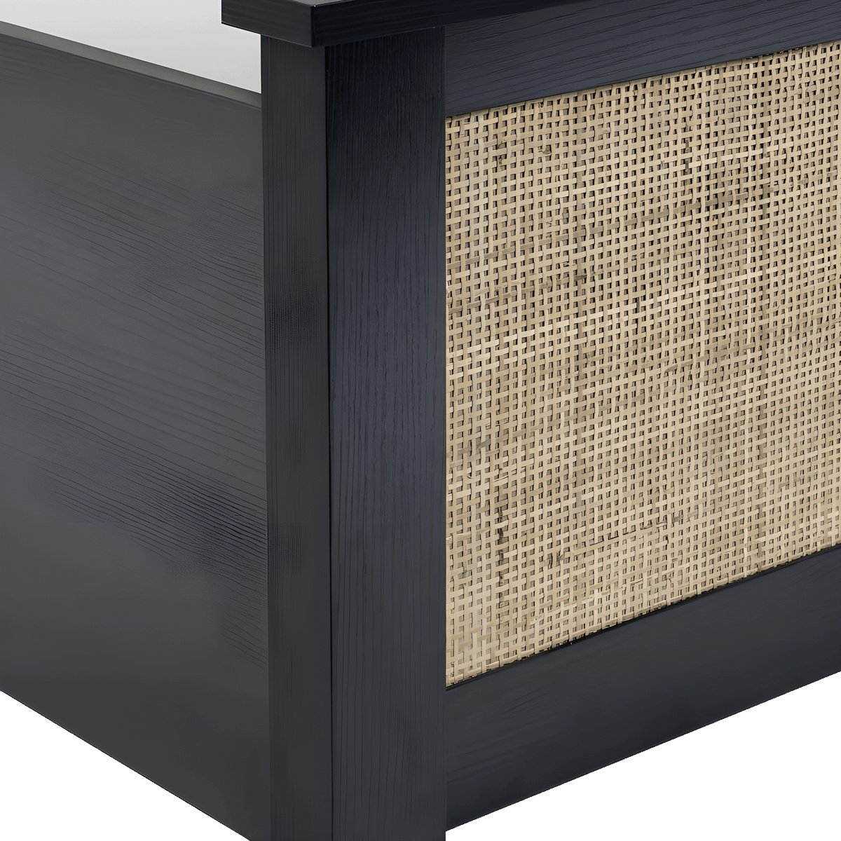 This bed features an elegant design, highlighted by intricate woven rattan detailing on the headboard, adding a touch of natural texture and warmth. The bold, striking finish complements a wide range of bedroom styles, bringing a modern yet timeless look that effortlessly enhances any space.
