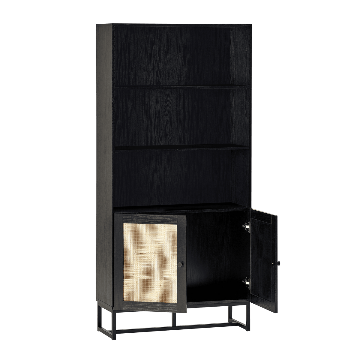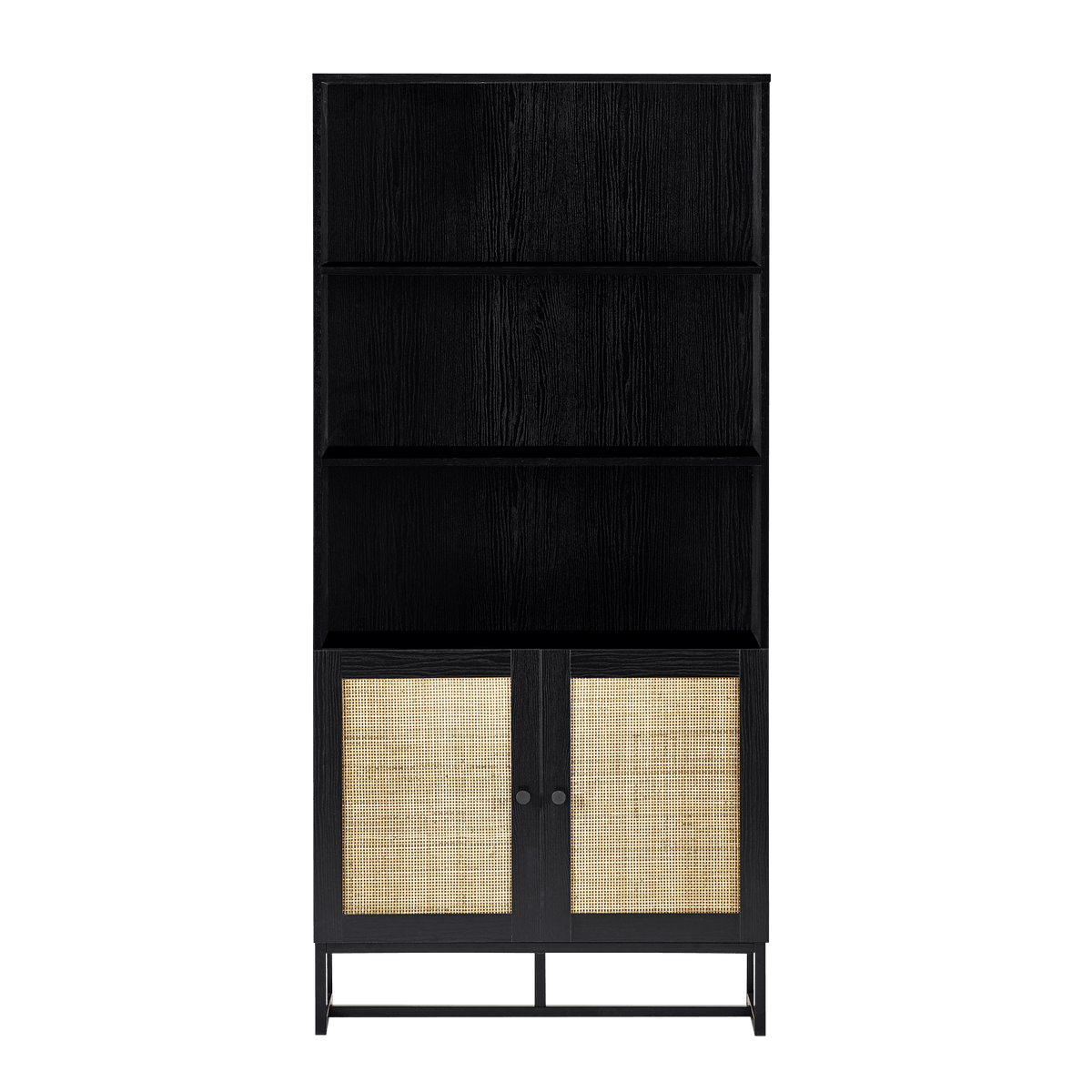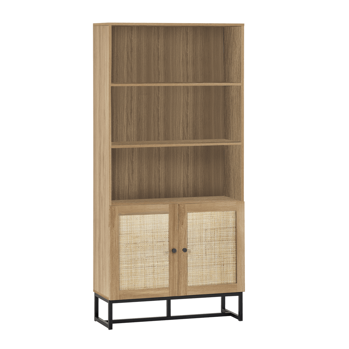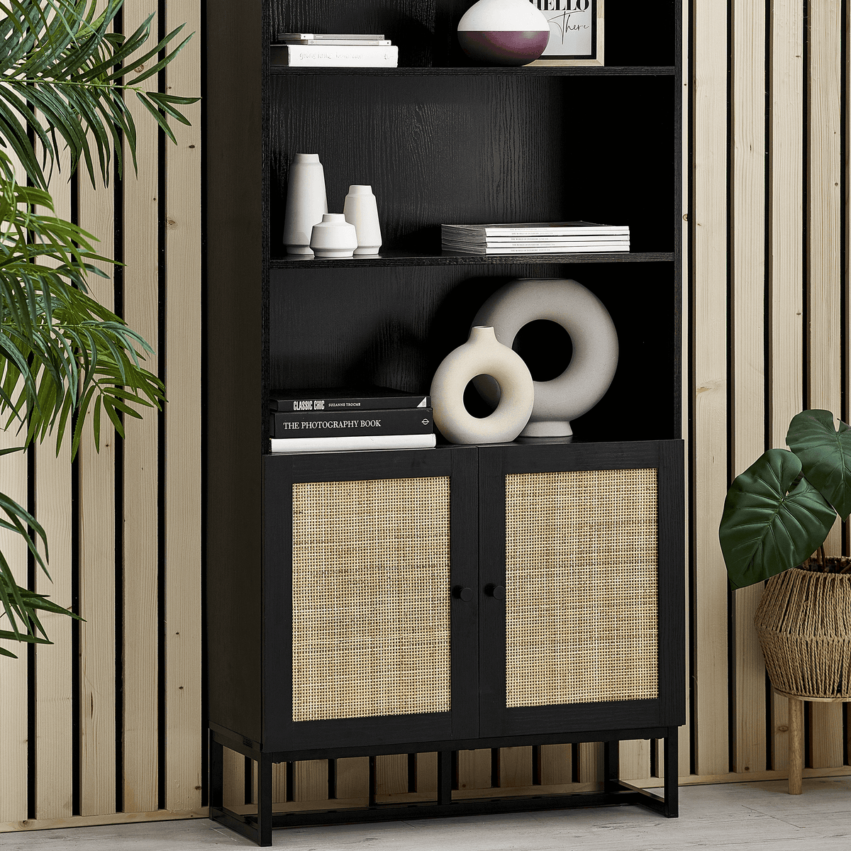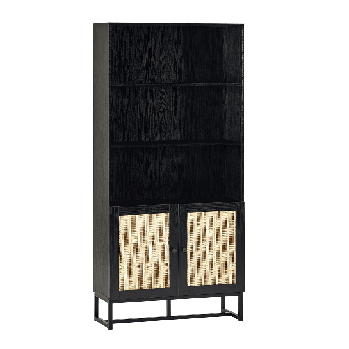 Elevate your space with this sleek, tall Soho bookcase featuring a natural wood finish and a modern black metal frame. Perfect for displaying your favorite books and decor, it offers ample storage with three spacious shelves and a chic, rattan-inlaid cabinet. Also available in a stylish black variant for a contemporary look.