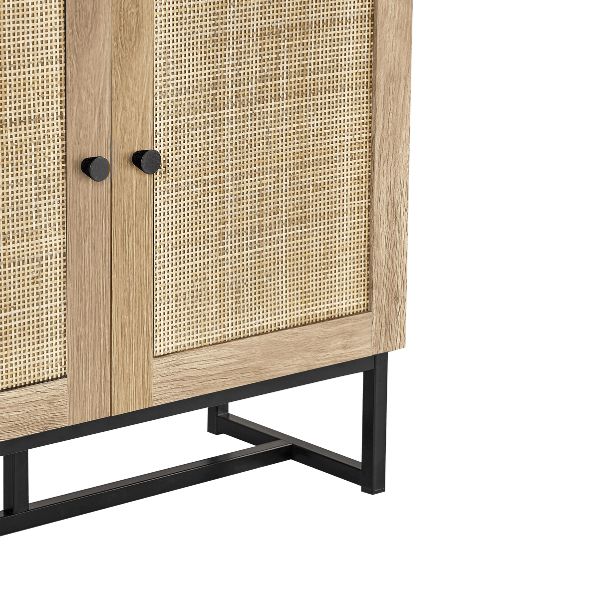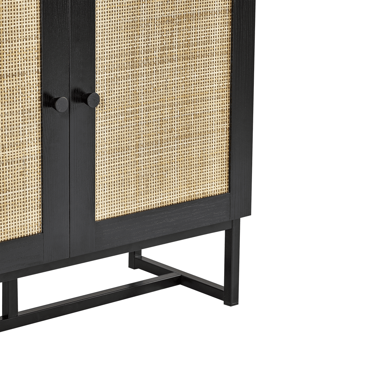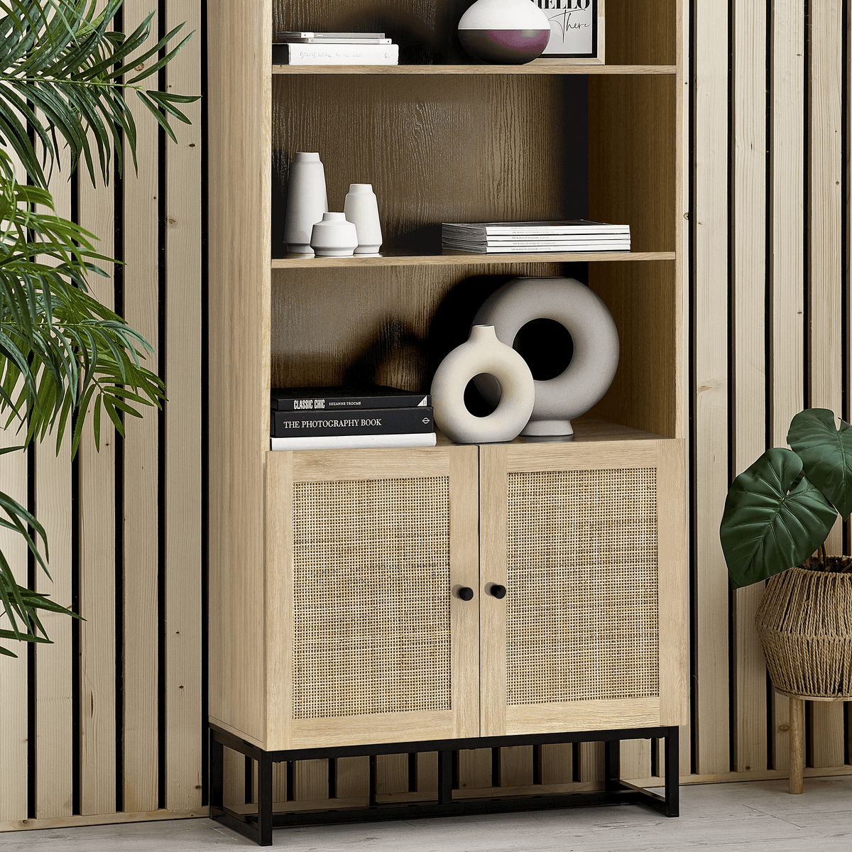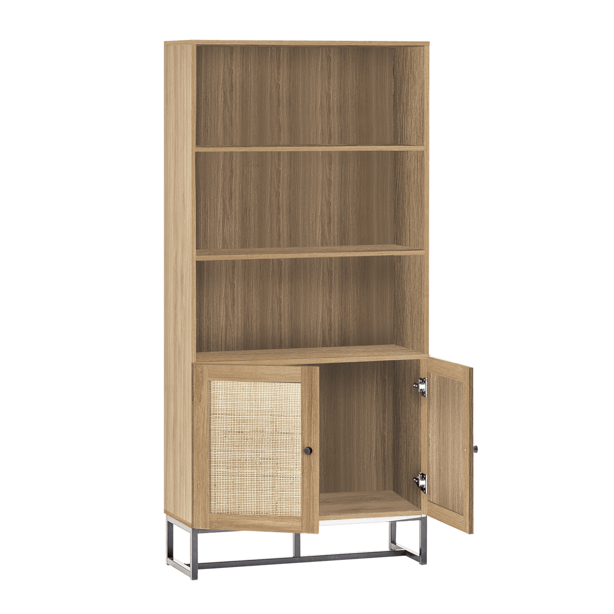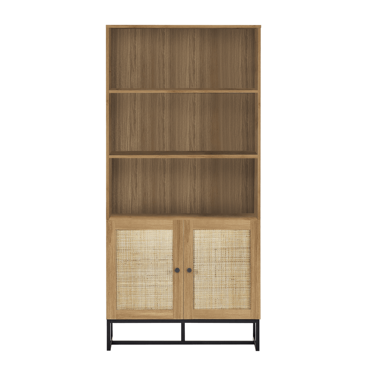 Elevate your space with this sleek, tall Soho bookcase featuring a natural wood finish and a modern black metal frame. Perfect for displaying your favorite books and decor, it offers ample storage with three spacious shelves and a chic, rattan-inlaid cabinet. Also available in a stylish black variant for a contemporary look.