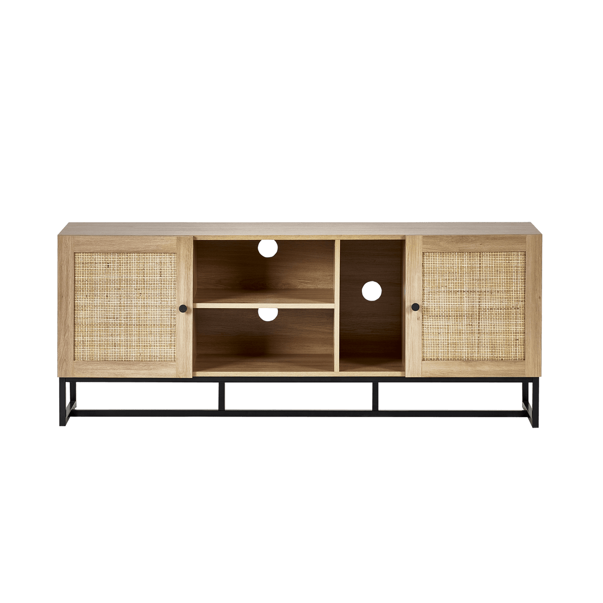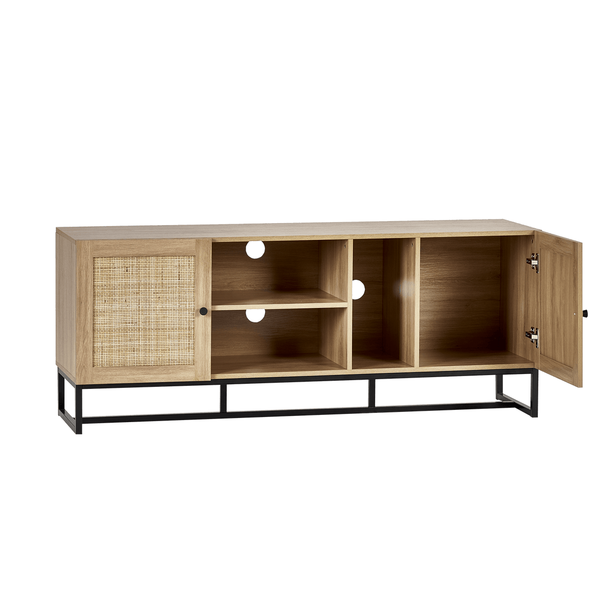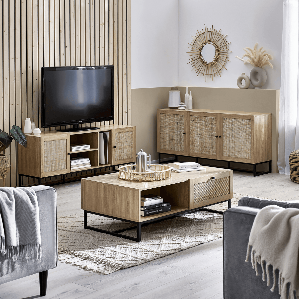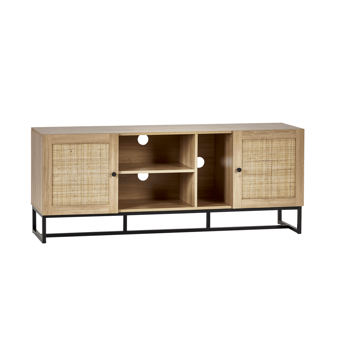 Upgrade your living space with our stylish Soho TV unit, featuring a natural wood finish and woven rattan doors for a chic, modern look. This unit offers ample storage with two spacious cabinets and open shelving, perfect for organizing your entertainment essentials. Available in both natural wood and sleek black finishes to match any decor.