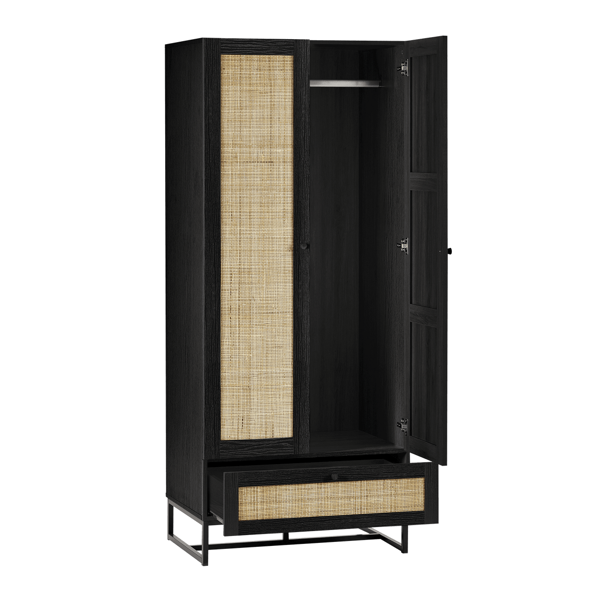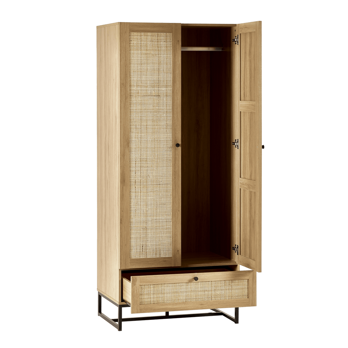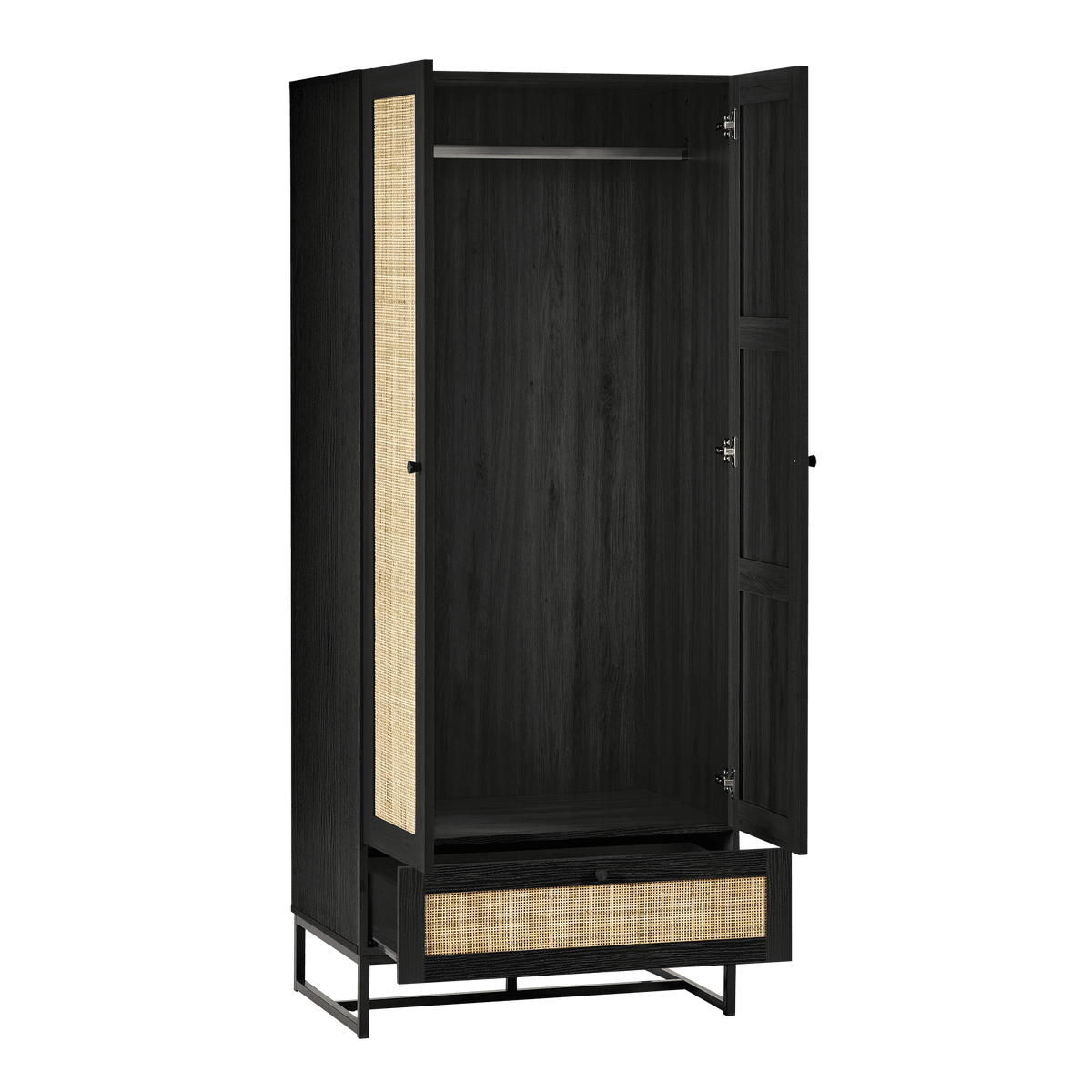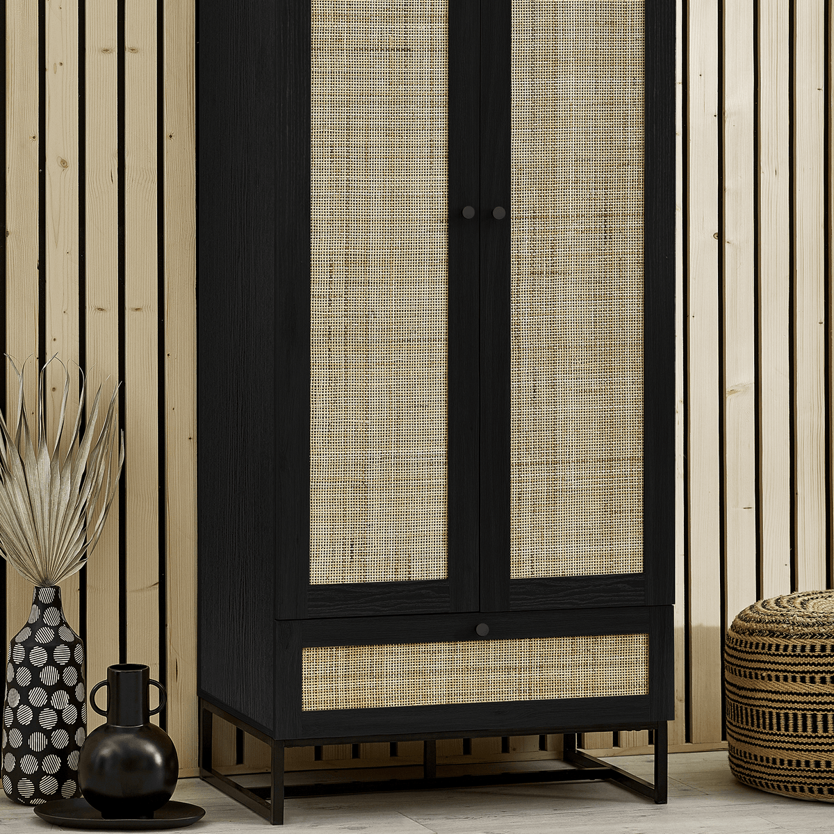 Introducing our stylish Soho wooden wardrobe featuring natural woven rattan doors and a spacious lower drawer. Perfect for adding a touch of elegance to any bedroom, this wardrobe offers ample storage with a hanging rod and a drawer for accessories. Available in natural wood finish and sleek black.