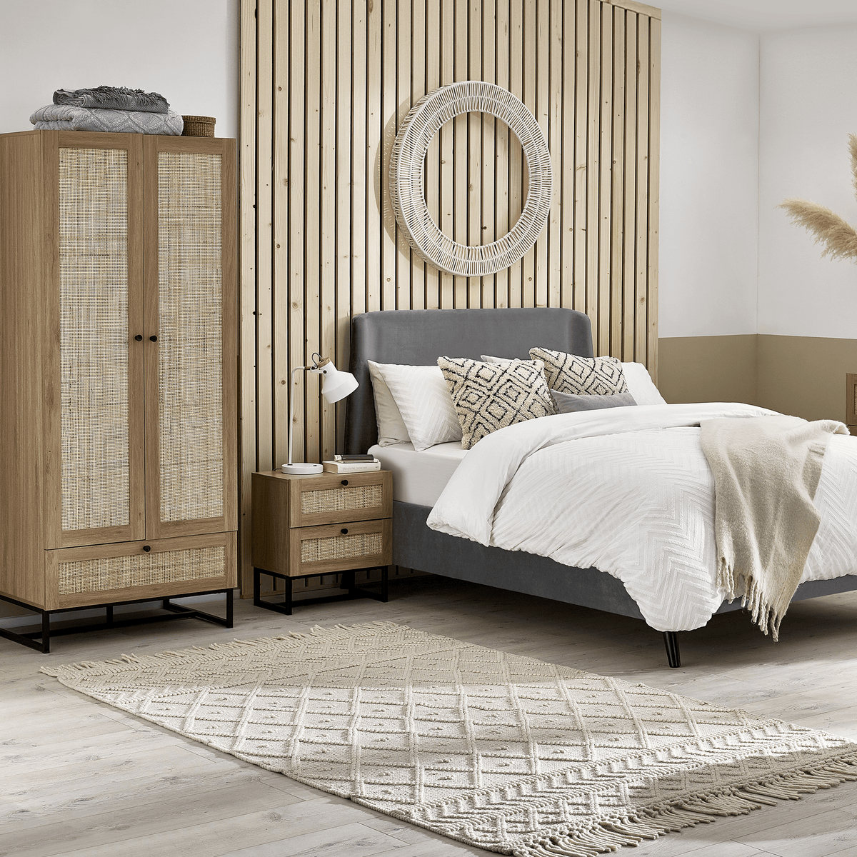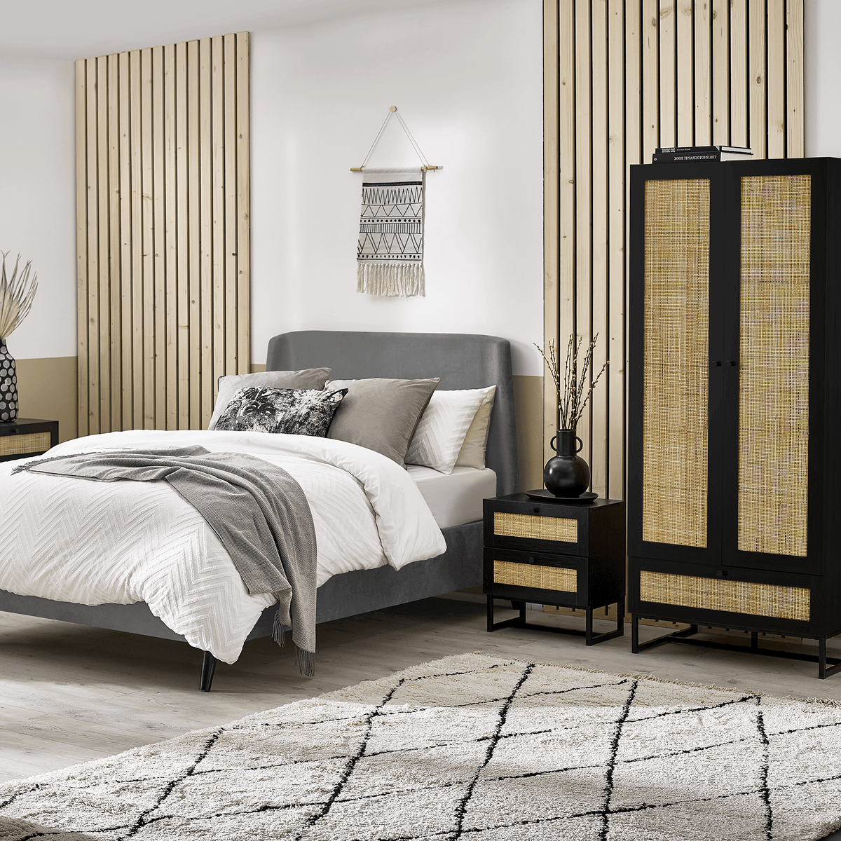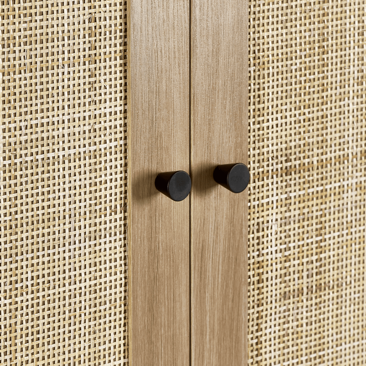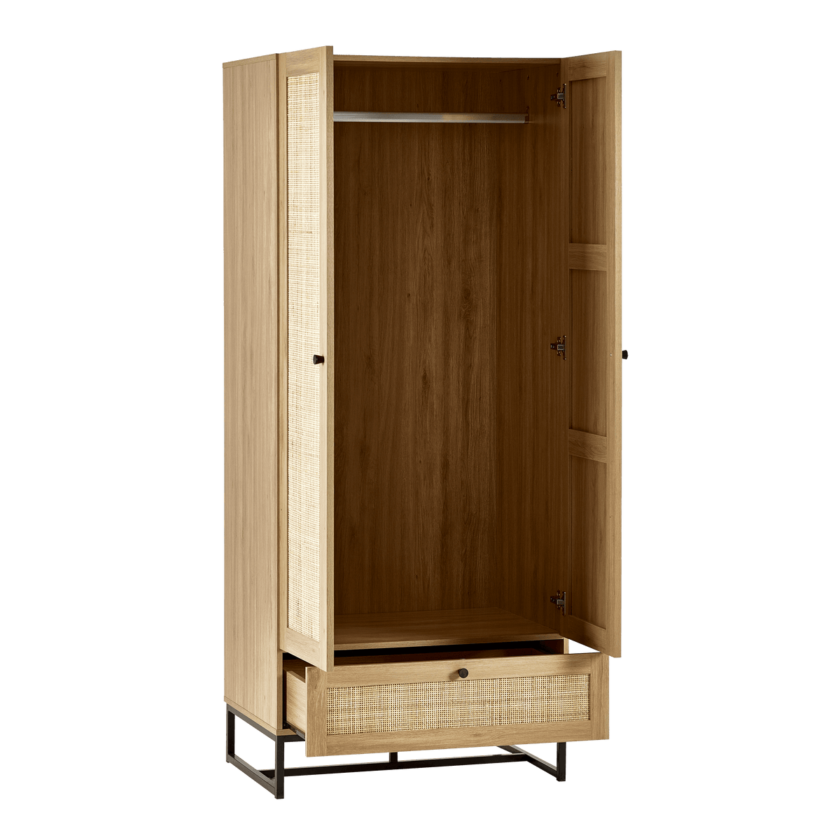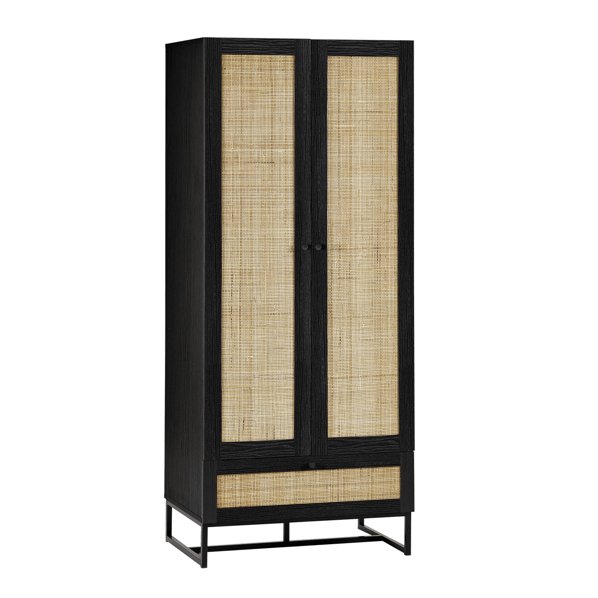 Introducing our stylish Soho wooden wardrobe featuring natural woven rattan doors and a spacious lower drawer. Perfect for adding a touch of elegance to any bedroom, this wardrobe offers ample storage with a hanging rod and a drawer for accessories. Available in natural wood finish and sleek black.