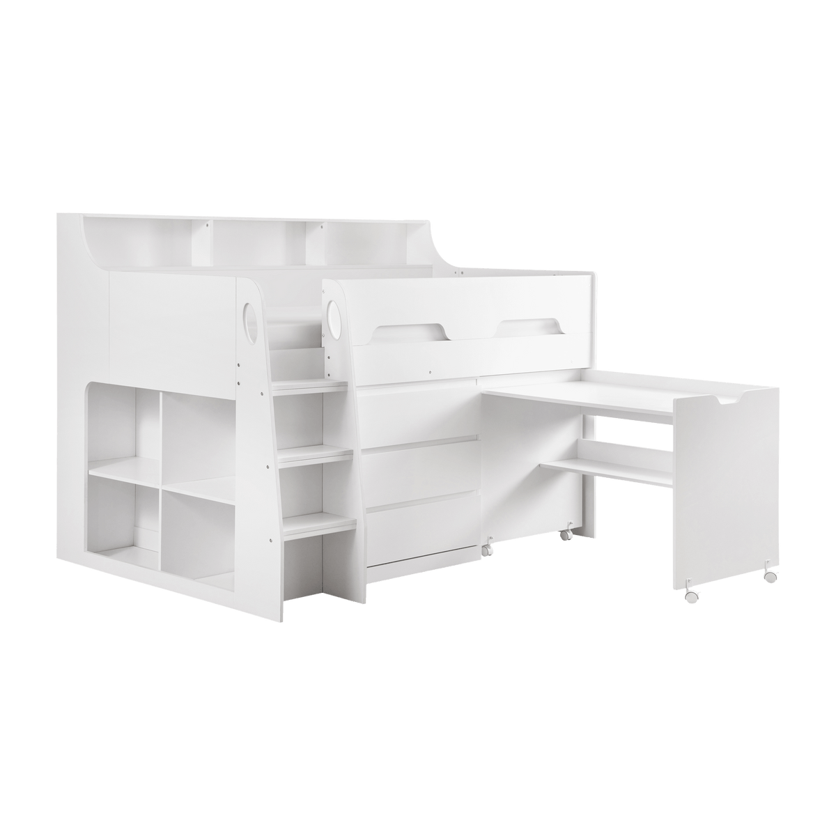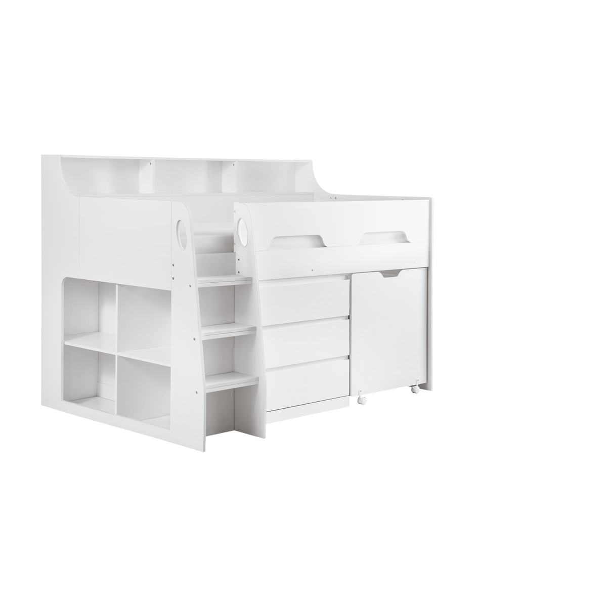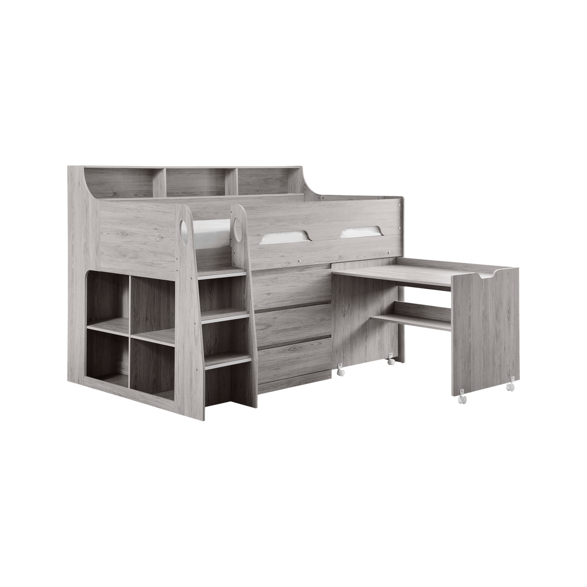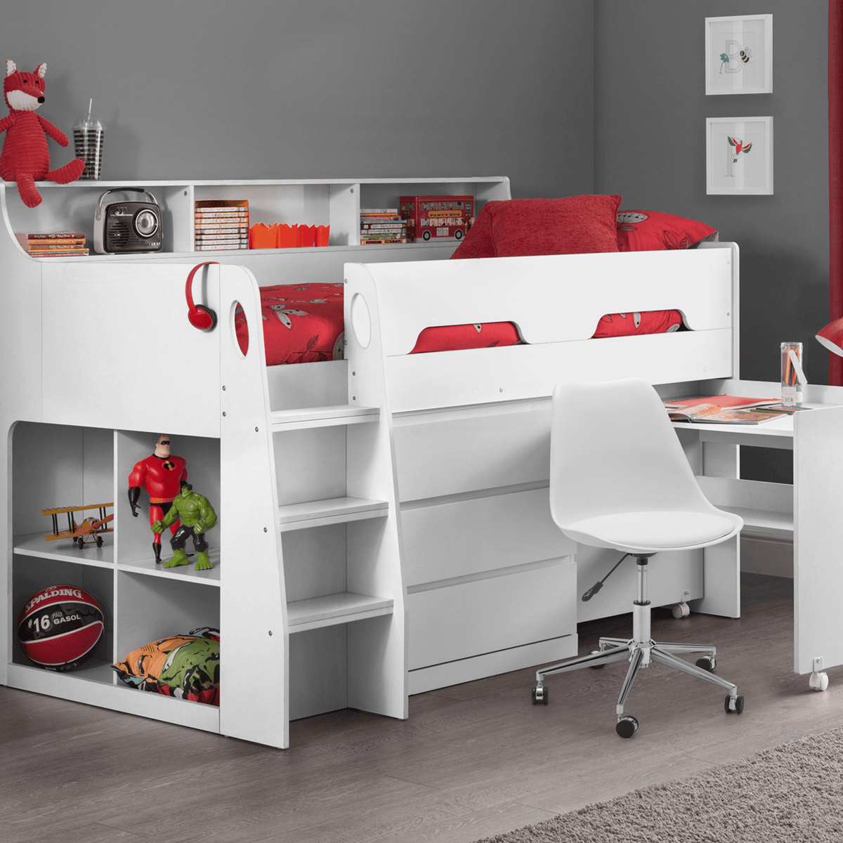 The Solar Mid Sleeper includes a spacious chest of drawers, a pullout desk for homework or play, and ample shelving to keep books, toys, and essentials neatly organised. Designed with safety and ease of use in mind, the bed features a robust ladder equipped with sleek cut-out handles, allowing for easy and secure access.
