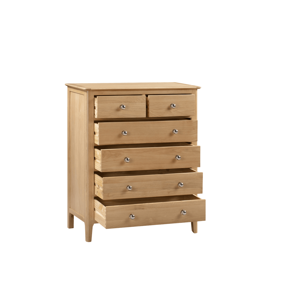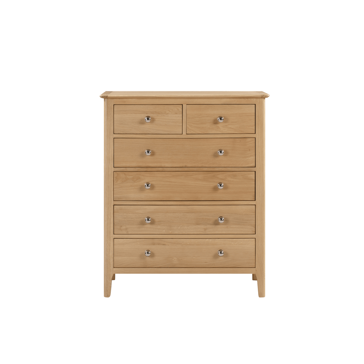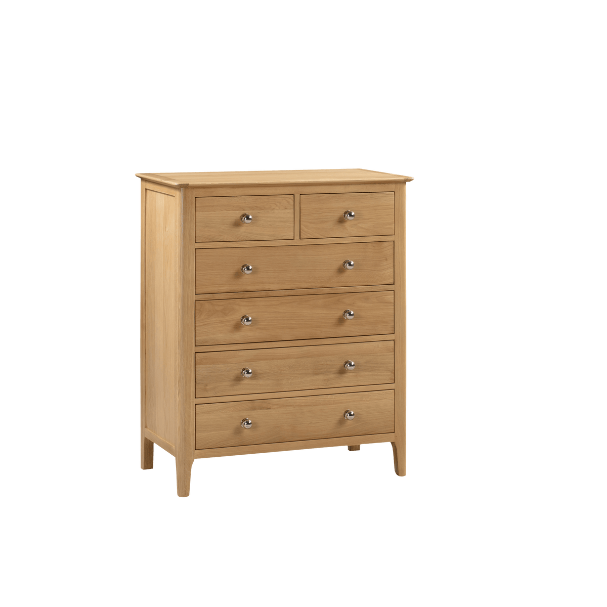Experience the perfect blend of style and functionality with our Stratford 4+2 Drawer Chest. Crafted from solid oak and oak veneers, this chest ensures long-lasting durability and a timeless appeal. It features round silver knobs and is designed with two small drawers and four large drawers, providing ample storage for all your essentials.