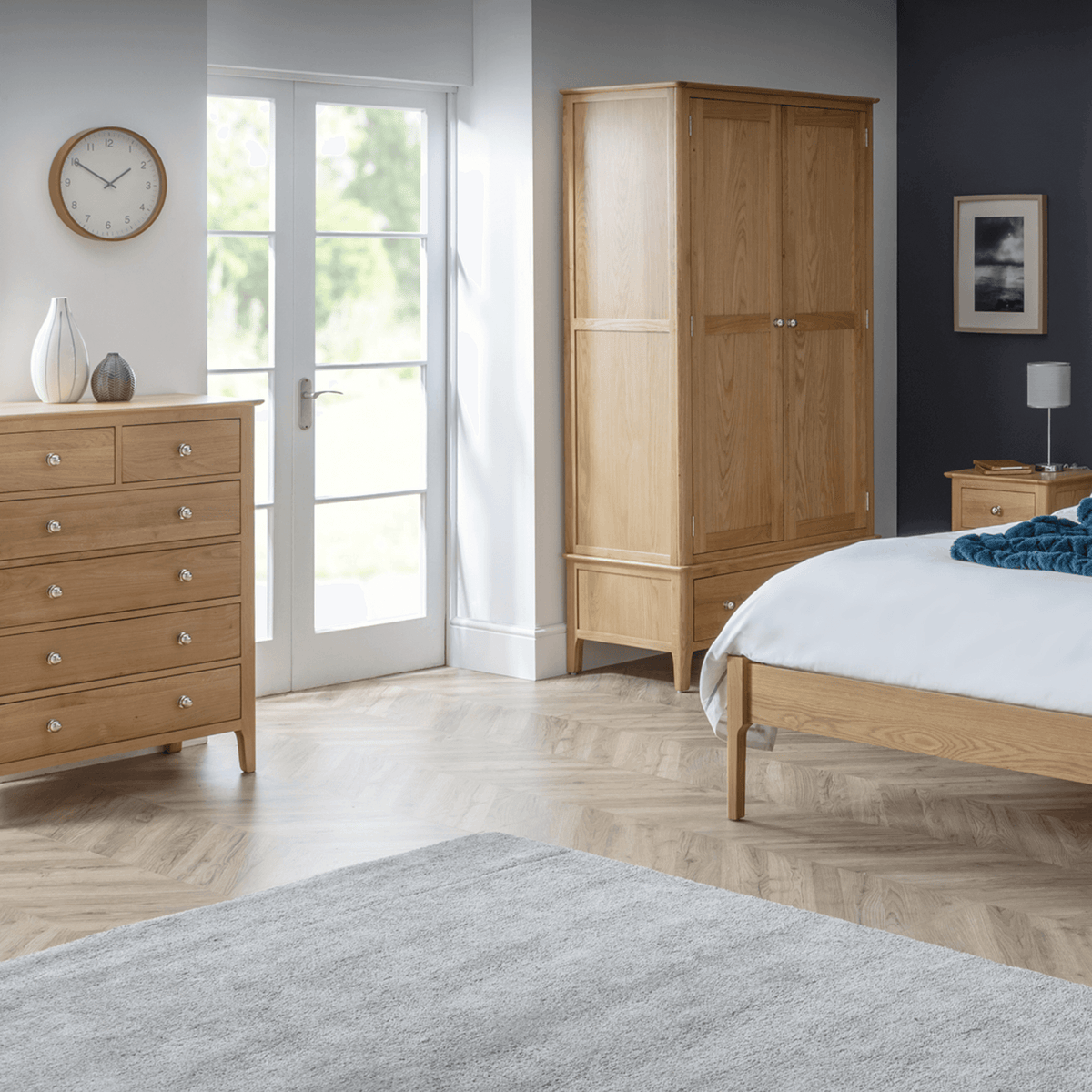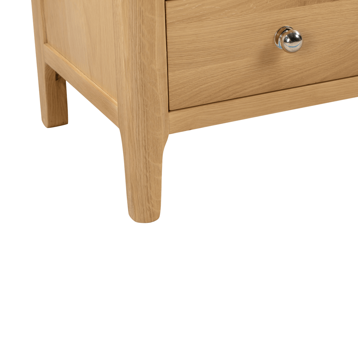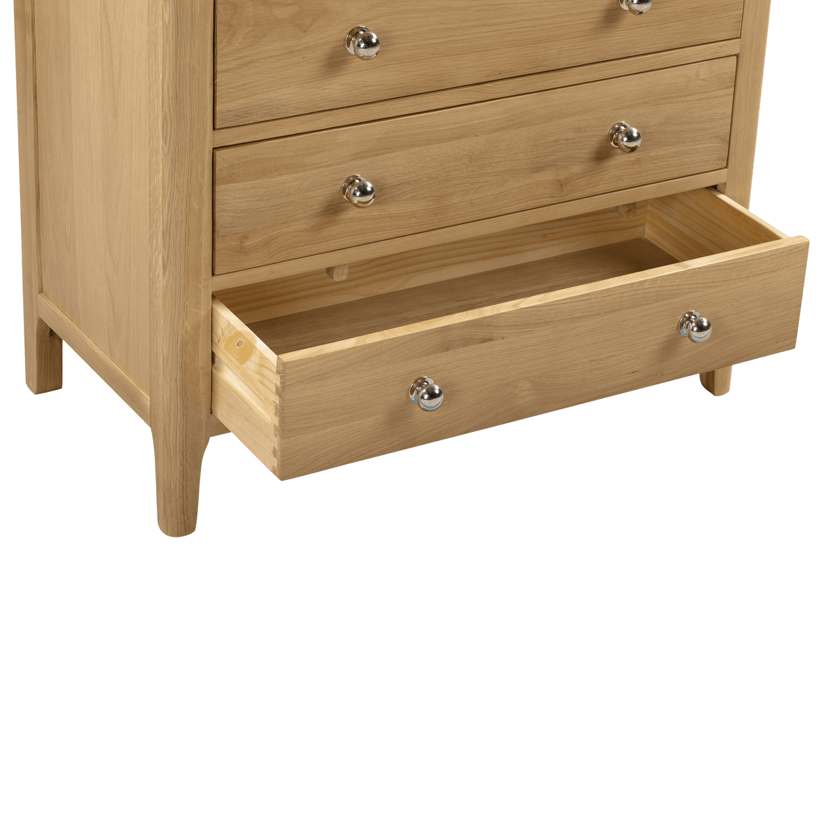 Experience the perfect blend of style and functionality with our Stratford 4+2 Drawer Chest. Crafted from solid oak and oak veneers, this chest ensures long-lasting durability and a timeless appeal. It features round silver knobs and is designed with two small drawers and four large drawers, providing ample storage for all your essentials.