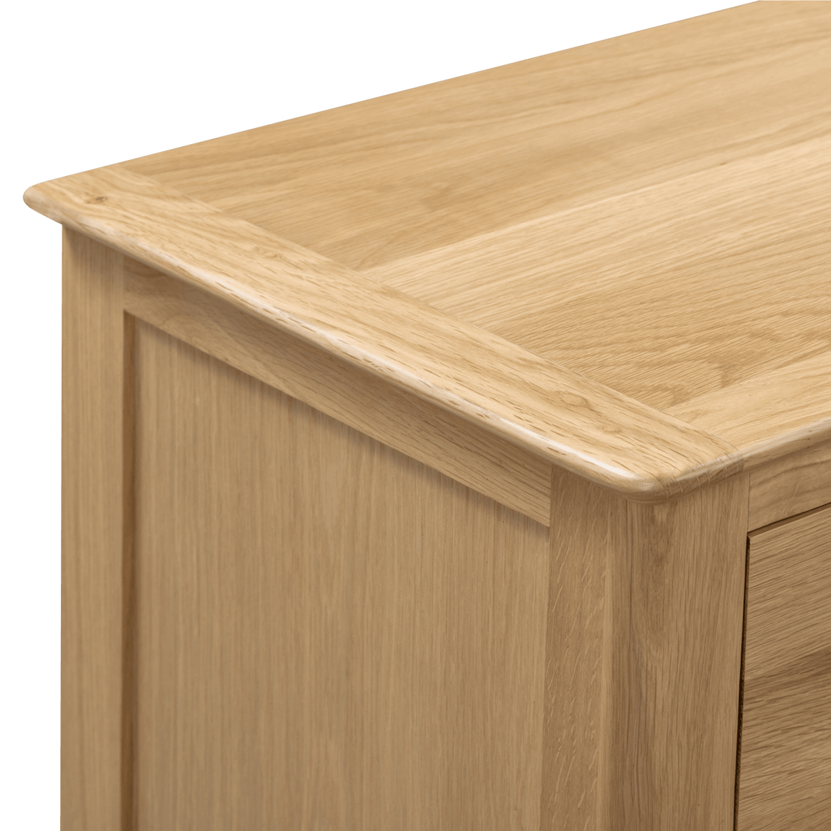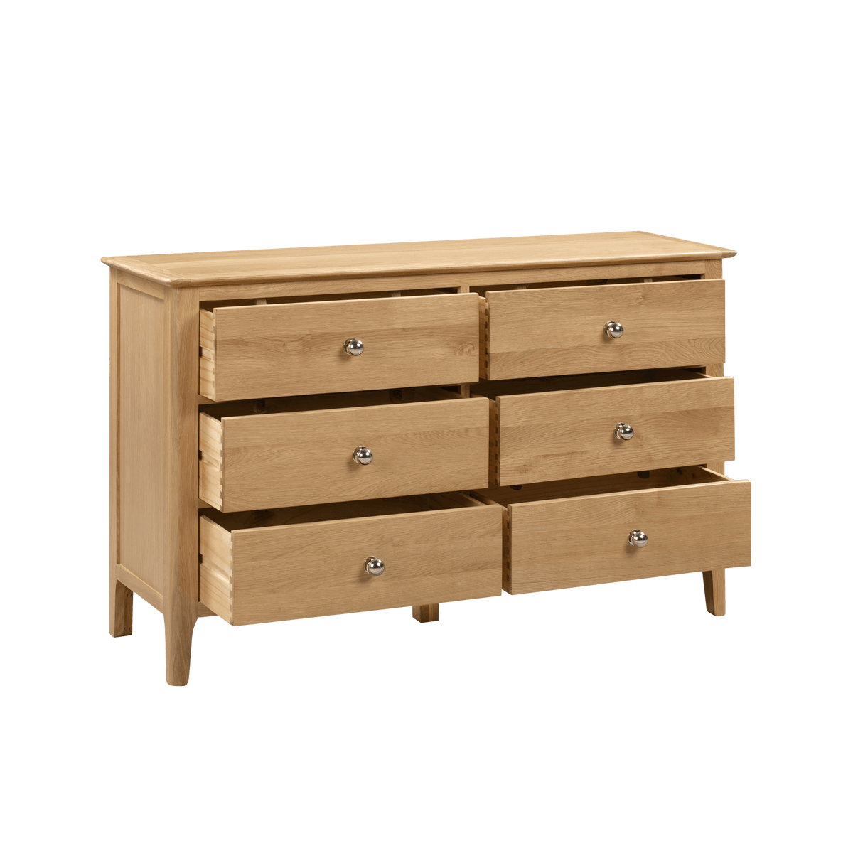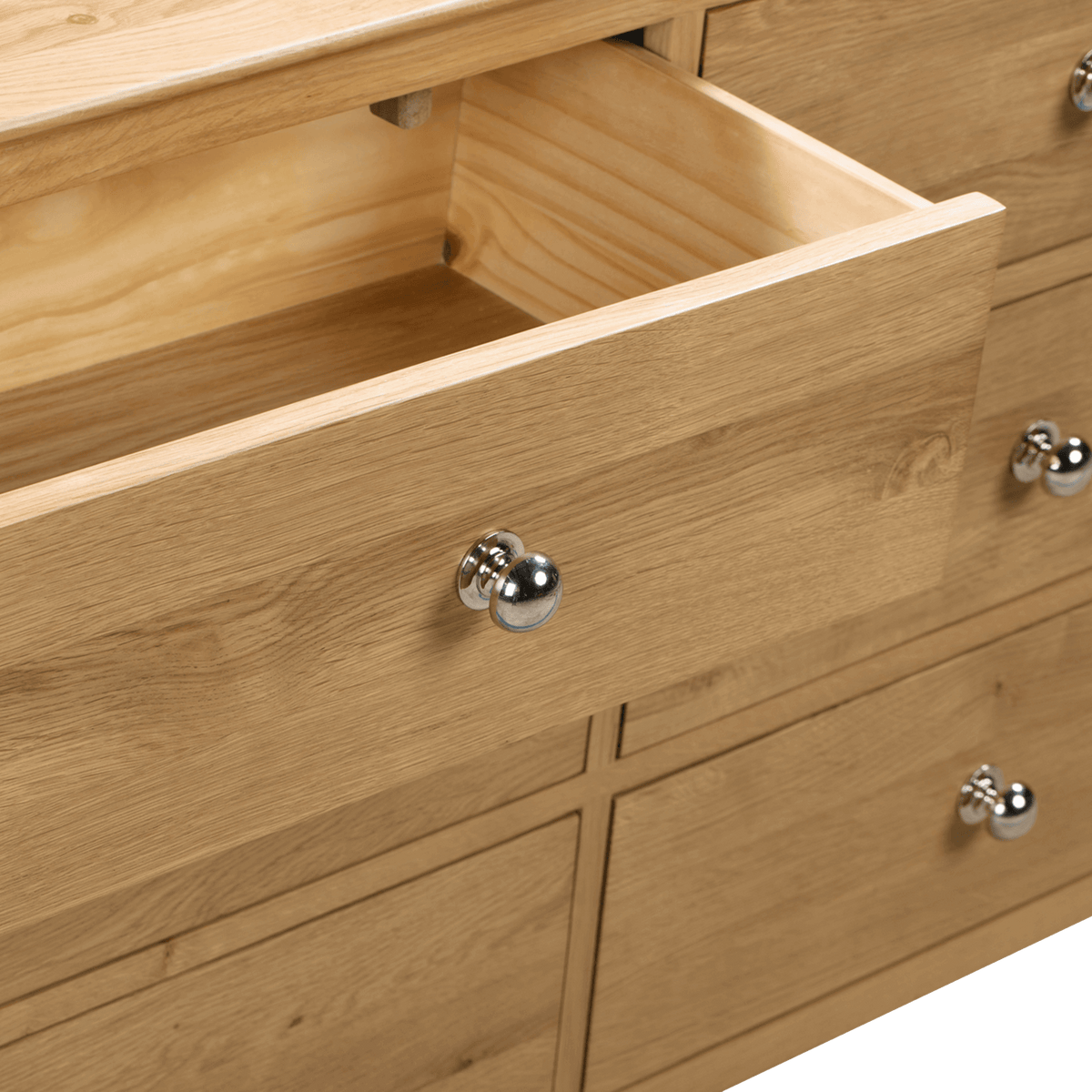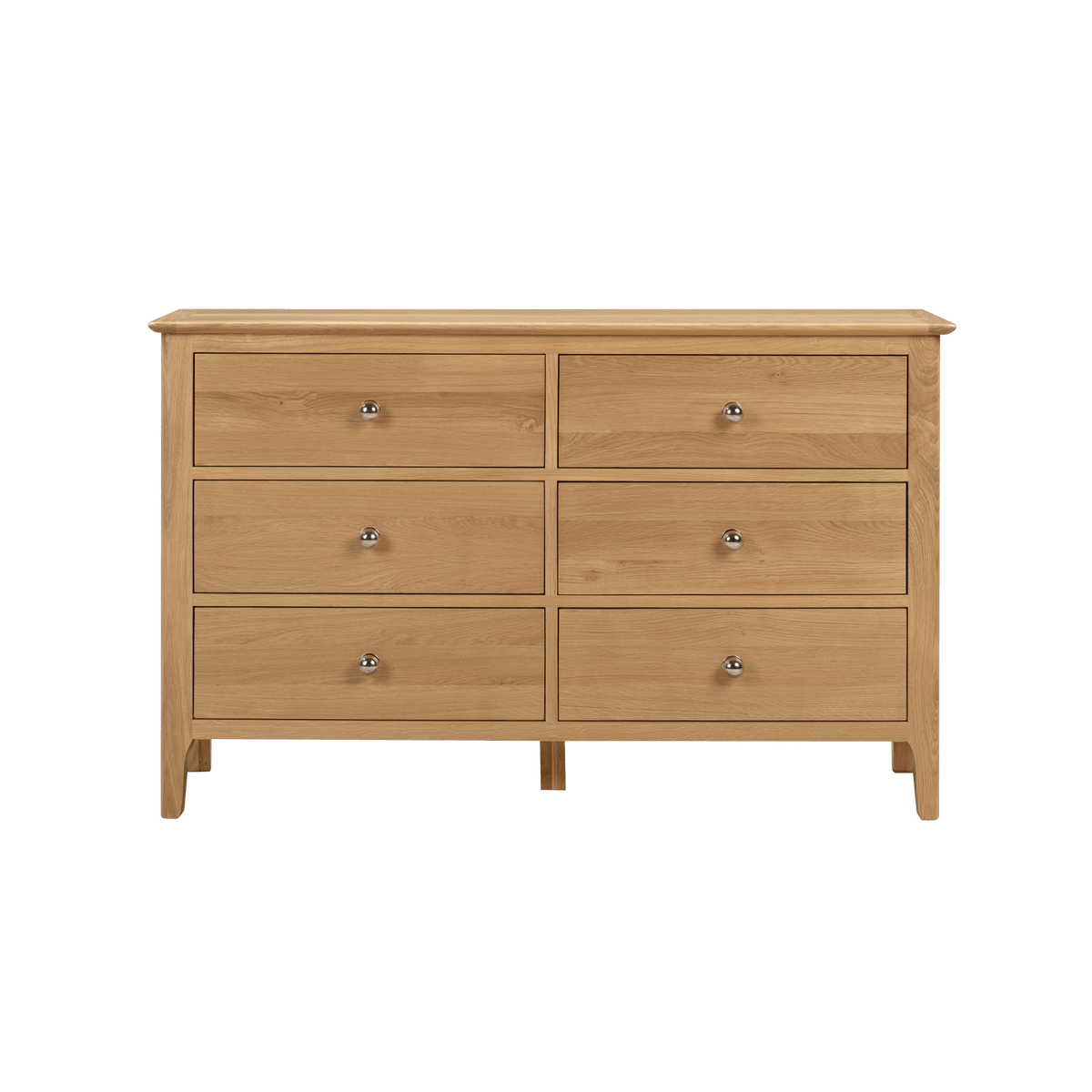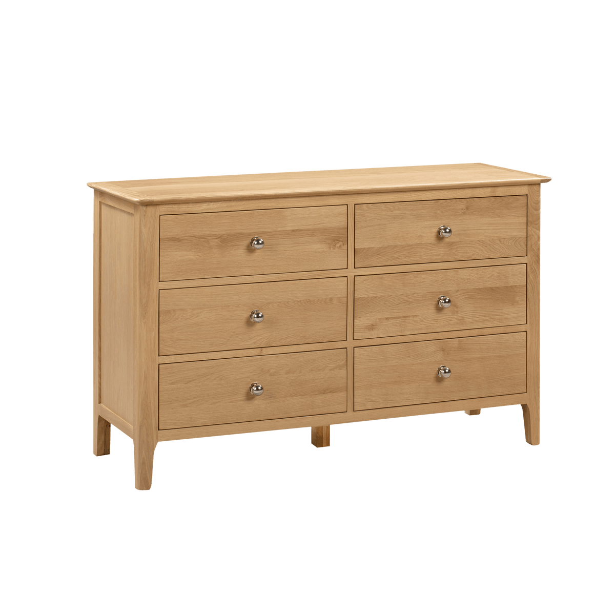 Enhance your bedroom with our elegant Stratford 6-Drawer Wide Chest, meticulously crafted from premium solid oak and oak veneers for unmatched durability and timeless beauty. The chest features six spacious drawers, providing ample storage for your essentials, and is adorned with sleek round silver knobs that add a touch of modern sophistication. Its sturdy construction and classic design make it a perfect blend of style and functionality for any home decor.