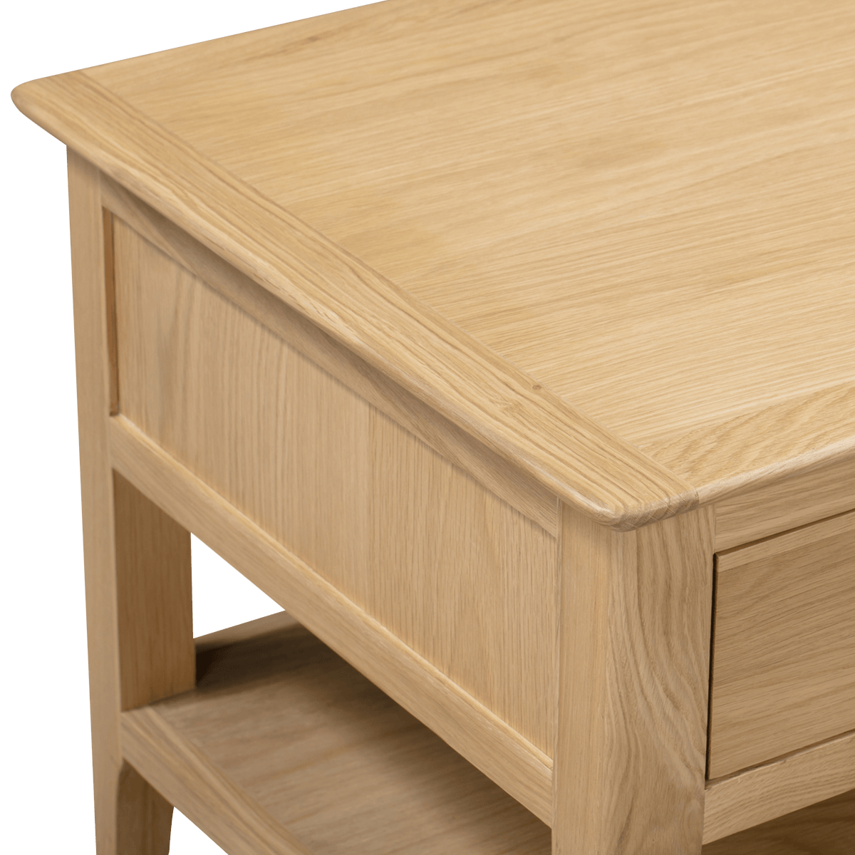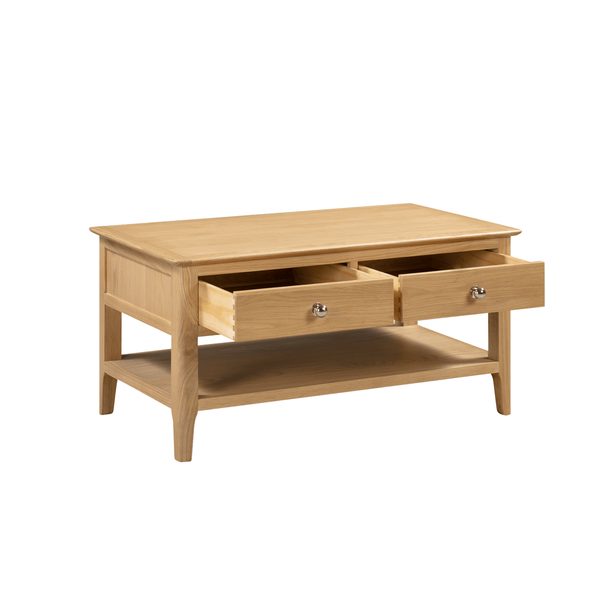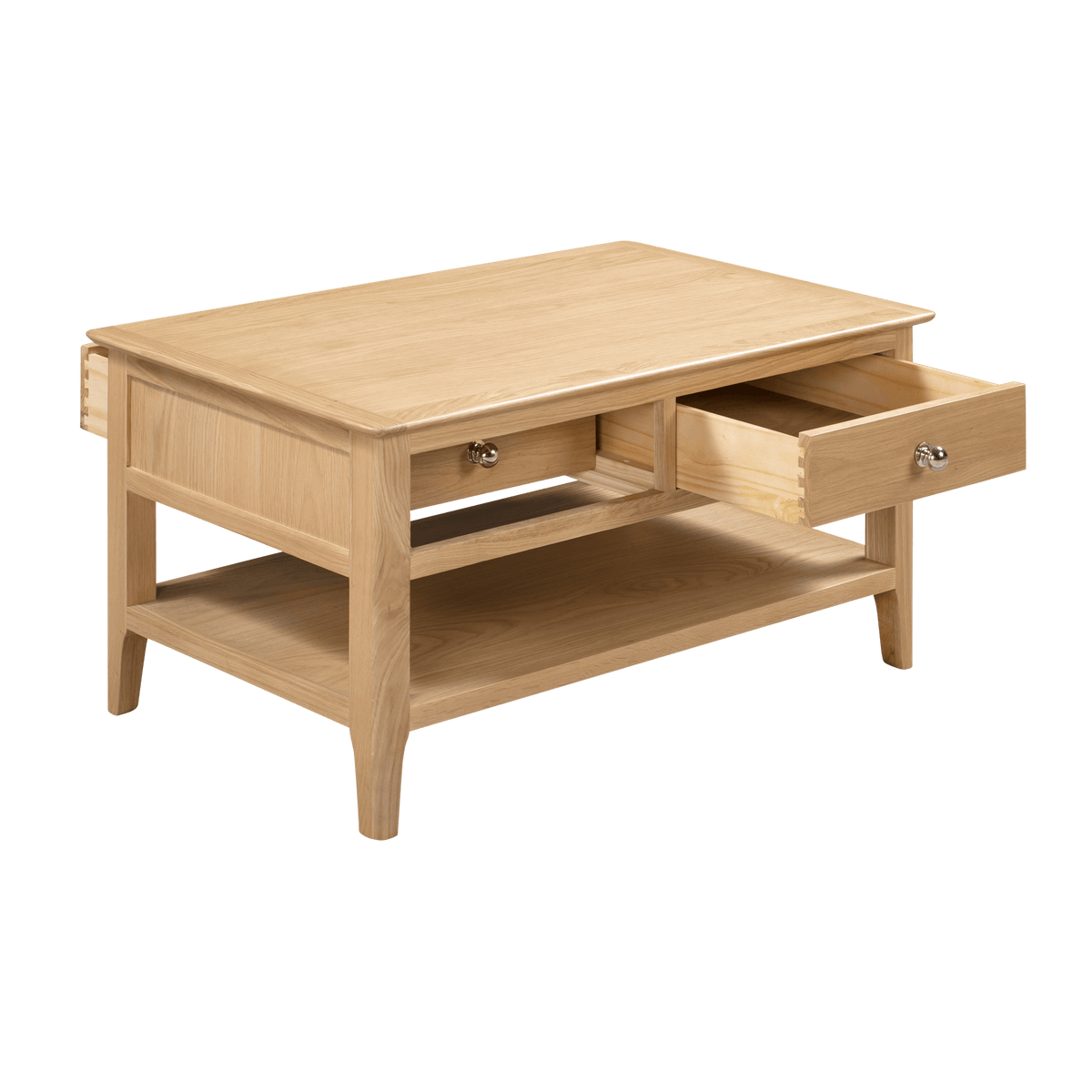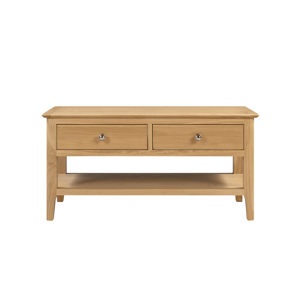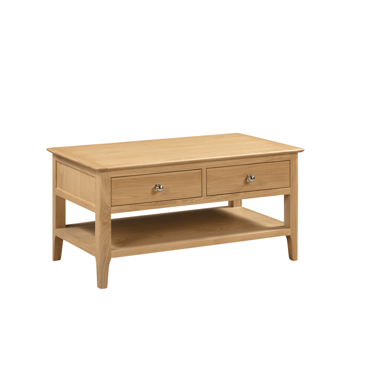 Enhance your living space with our Stratford coffee table, crafted from solid oak and oak veneers for long-lasting durability. Featuring two spacious drawers with stylish round silver knobs, and an additional lower shelf, it provides ample storage for your essentials while adding a touch of sophistication to your home decor.