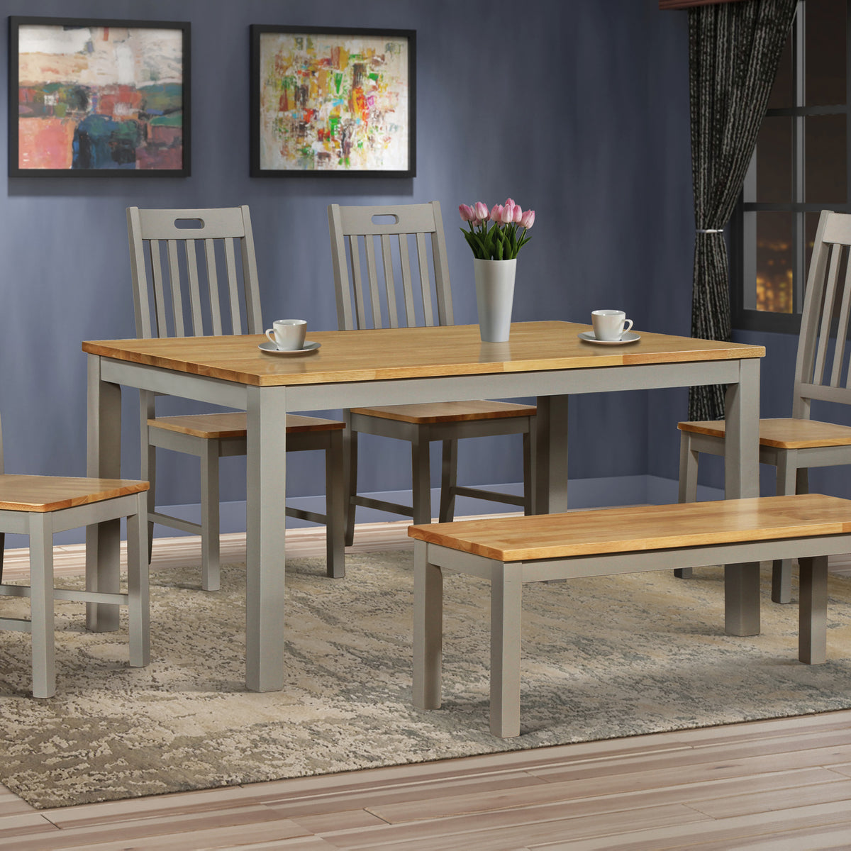 This modern dining set features a rectangular wooden table with a grey base and a natural oak wood top, paired with four chairs and a matching bench. The set offers a stylish and comfortable dining experience. The table's clean lines and contrasting colors create a contemporary aesthetic. The chairs' comfortable design and slatted backs complement the table's style. The overall style of the set is versatile, making it suitable for various home decor styles.
