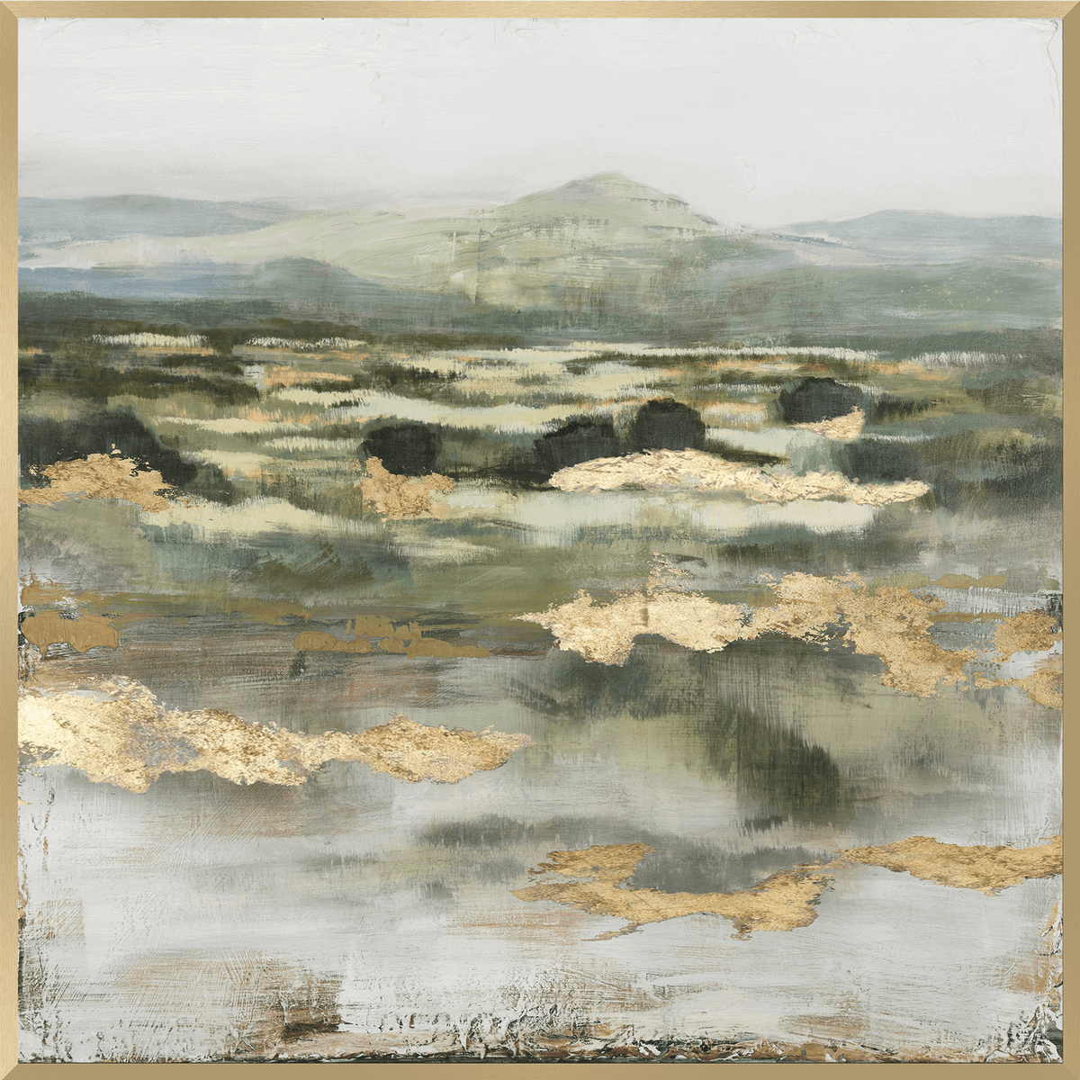 Enriched with structure and layers, Bosky is a modern abstract painting. This original artwork features the hues of green and gold, finished inside a bright gold frame, making it a focus point in any interior. Bosky is a printed and hand-painted design, by artist Amber Fey.