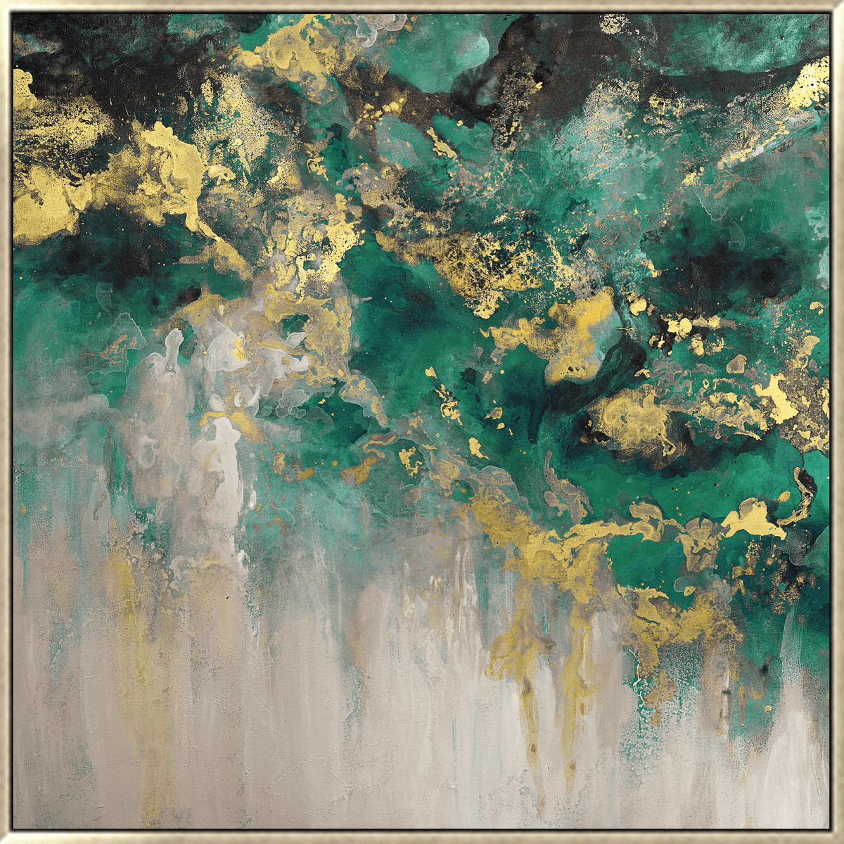Champagne Skies, Multi blends bright, vivid colors of greens to create a vibrant abstract painting with metallic gold paint. Champagne Skies is a printed and hand-painted design, by artist Patrick St. Germain.