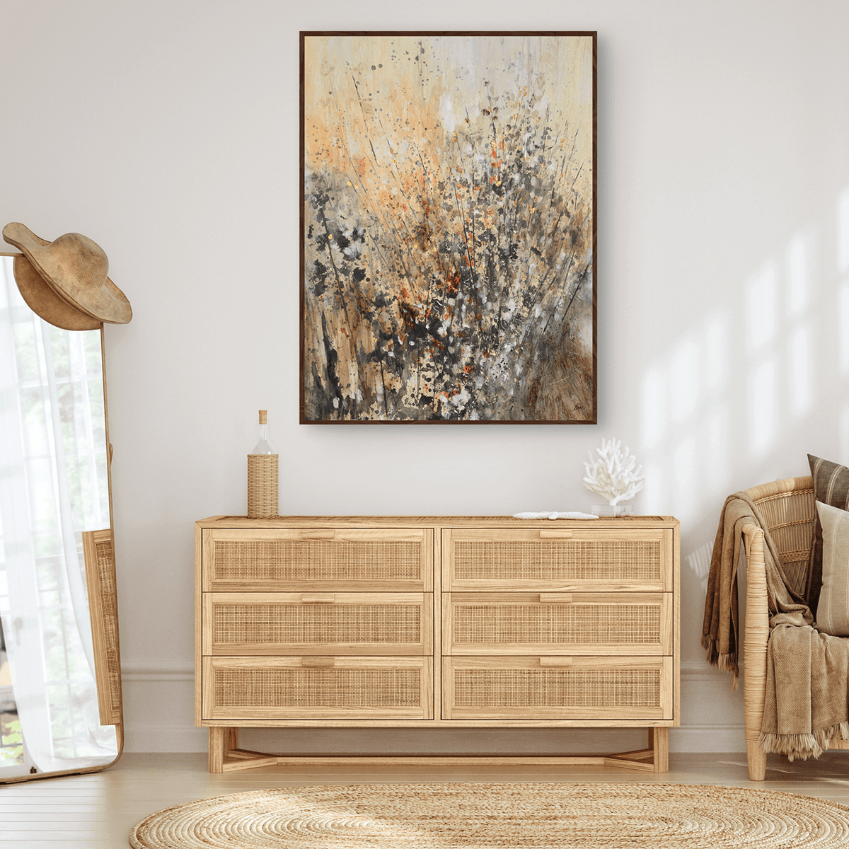 Clennam 1 absorbs nature’s beauty in a picturesque fashion. The dark brown frame acts as the final touch to draw out the rich details within the design. Clennam 1, is a printed and hand-painted design, by artist Lune.
