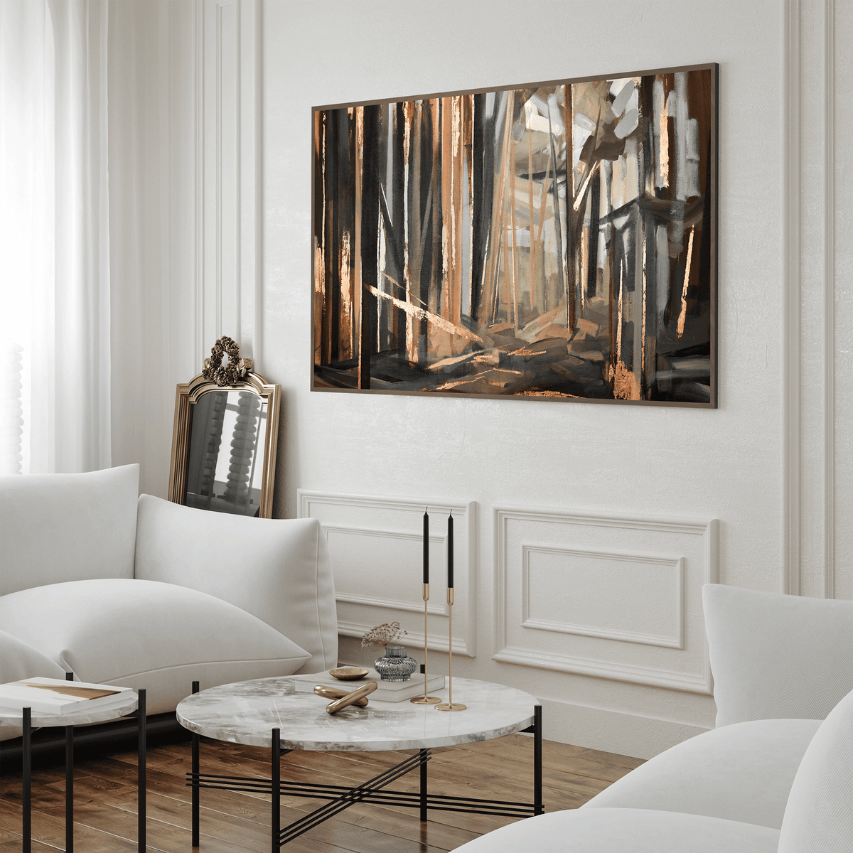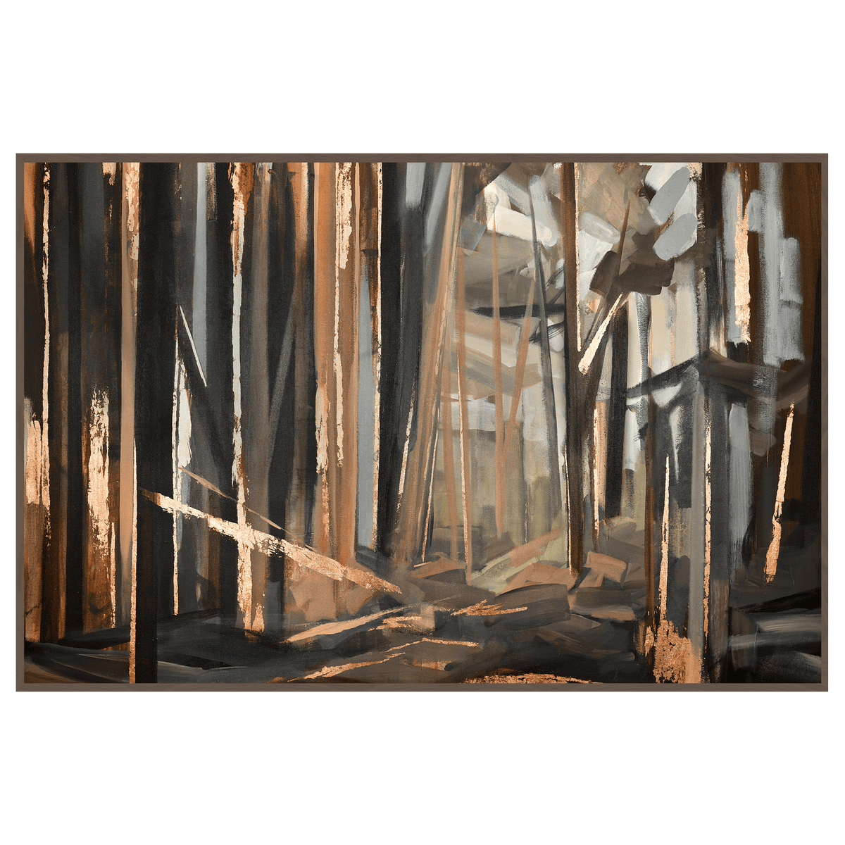 The copper woods art piece will give you a feeling of like walking through the forest. The energy of the woods with accents of copper foil is poured into your home through this work of art. Copper woods is printed and hand-painted design, by artist Lune.