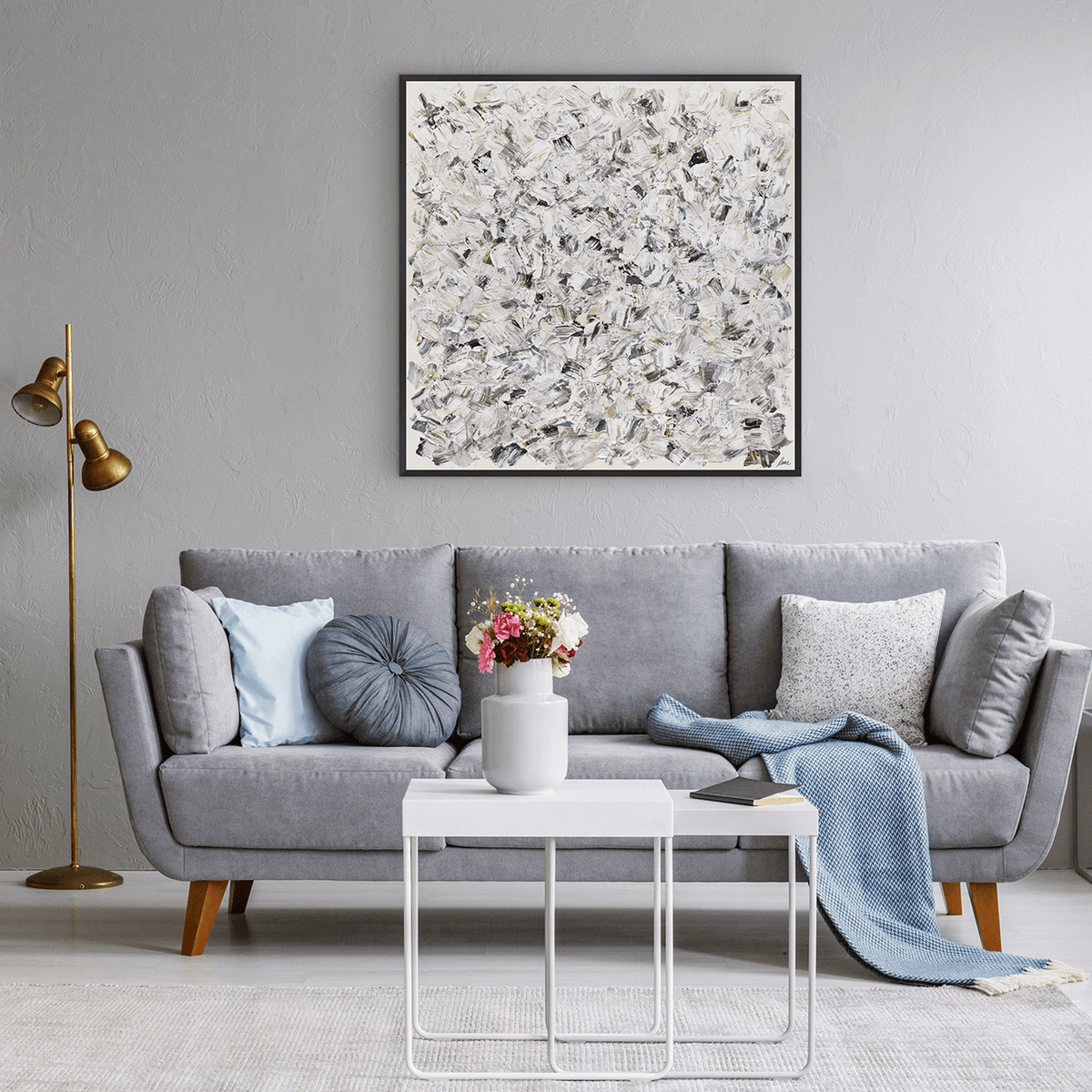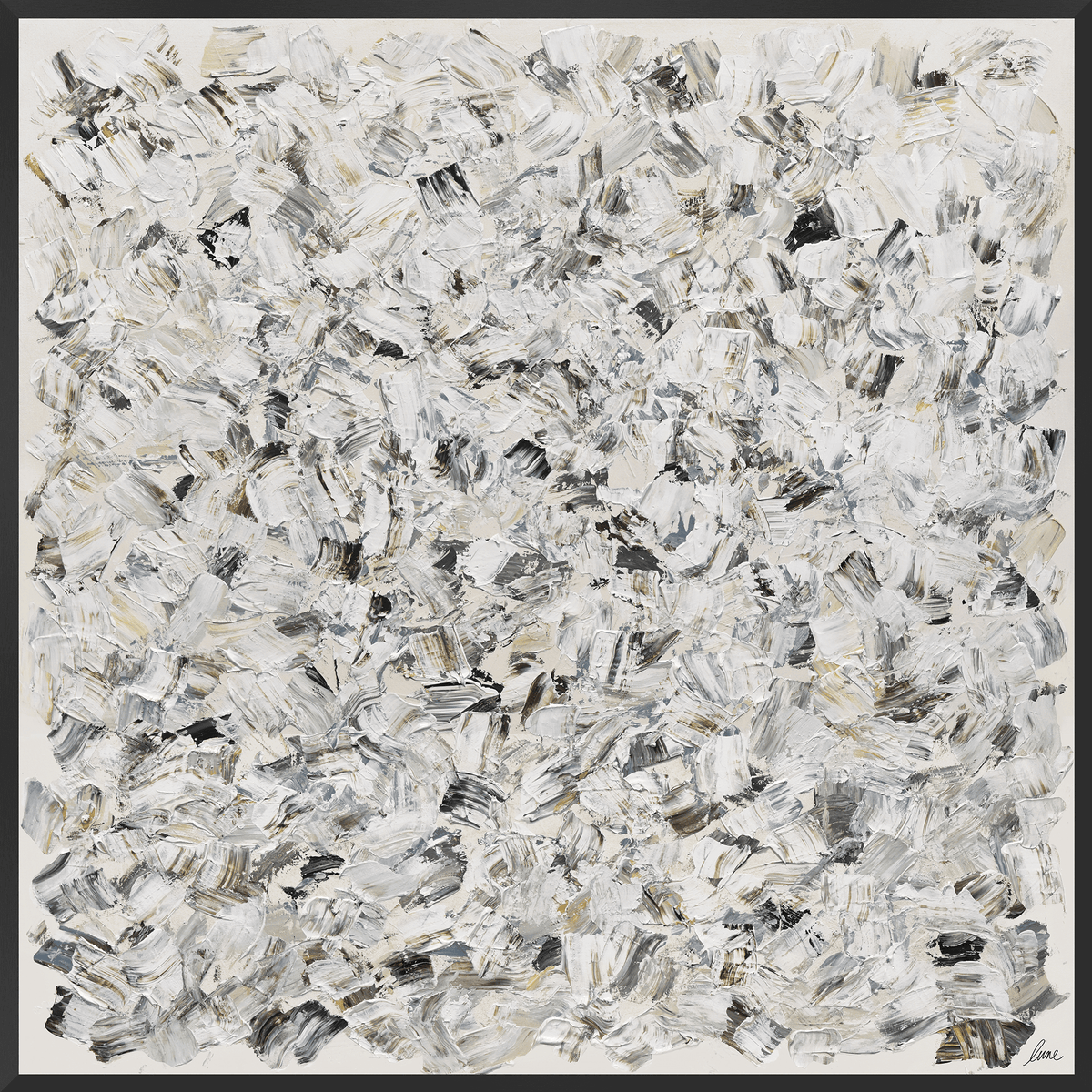 Swish is a modern original abstract painting. This printed and hand-painted piece will add a classic touch to the modern interior. The marriage of bold black details and soft ballet of grey and cream tones create a dramatic impact while maintaining a peaceful quality. The black wood frame encapsulates the piece and allows it to fit effortlessly within any room, while hanging vertically or horizontally. Swish is a printed and hand-painted design, by artist Lune.