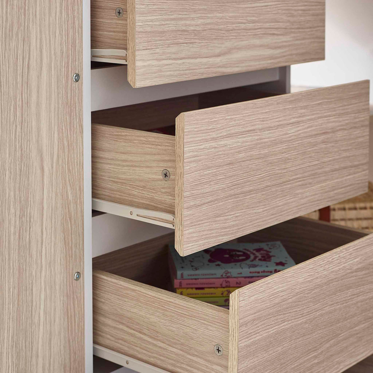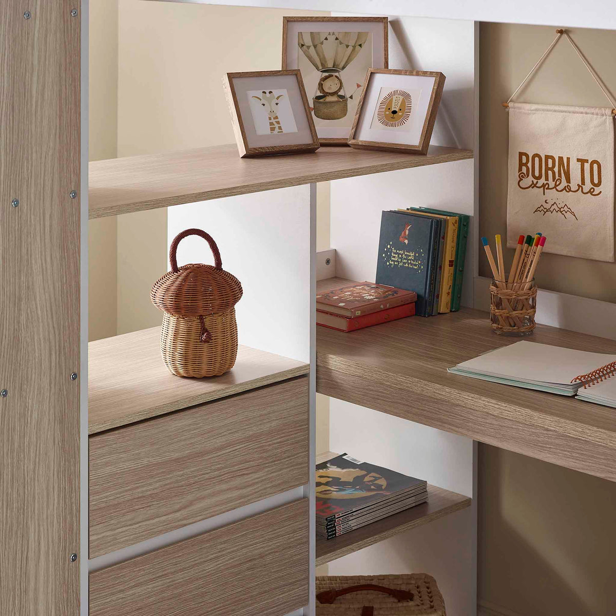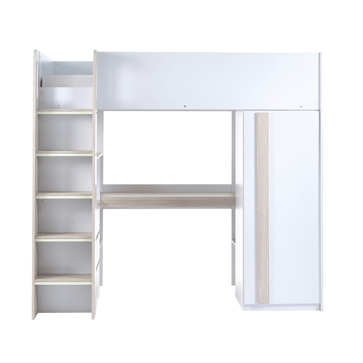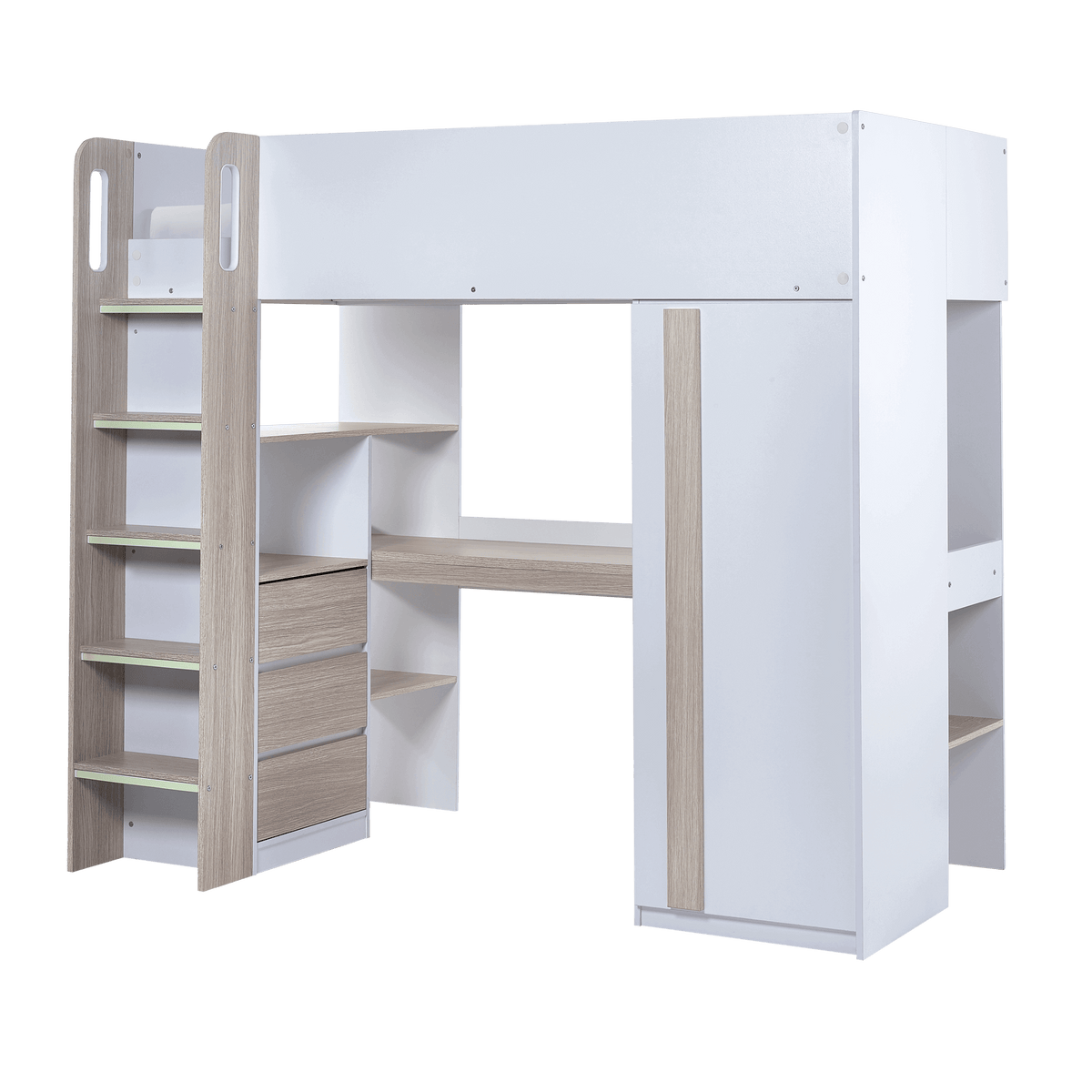 The Tide High Sleeper is a stylish and practical all-in-one solution, designed to meet the needs of kids and teenagers. It combines a comfortable sleeping area with a range of functional features, including a built-in desk for study or play, three spacious pull-out drawers, a one-door wardrobe for clothes, and multiple shelving units for books, toys, and other essentials. Finished in a sleek matt white with warm woodgrain accents, this high sleeper brings a modern, clean aesthetic to any bedroom, making it a versatile fit for different styles of decor.