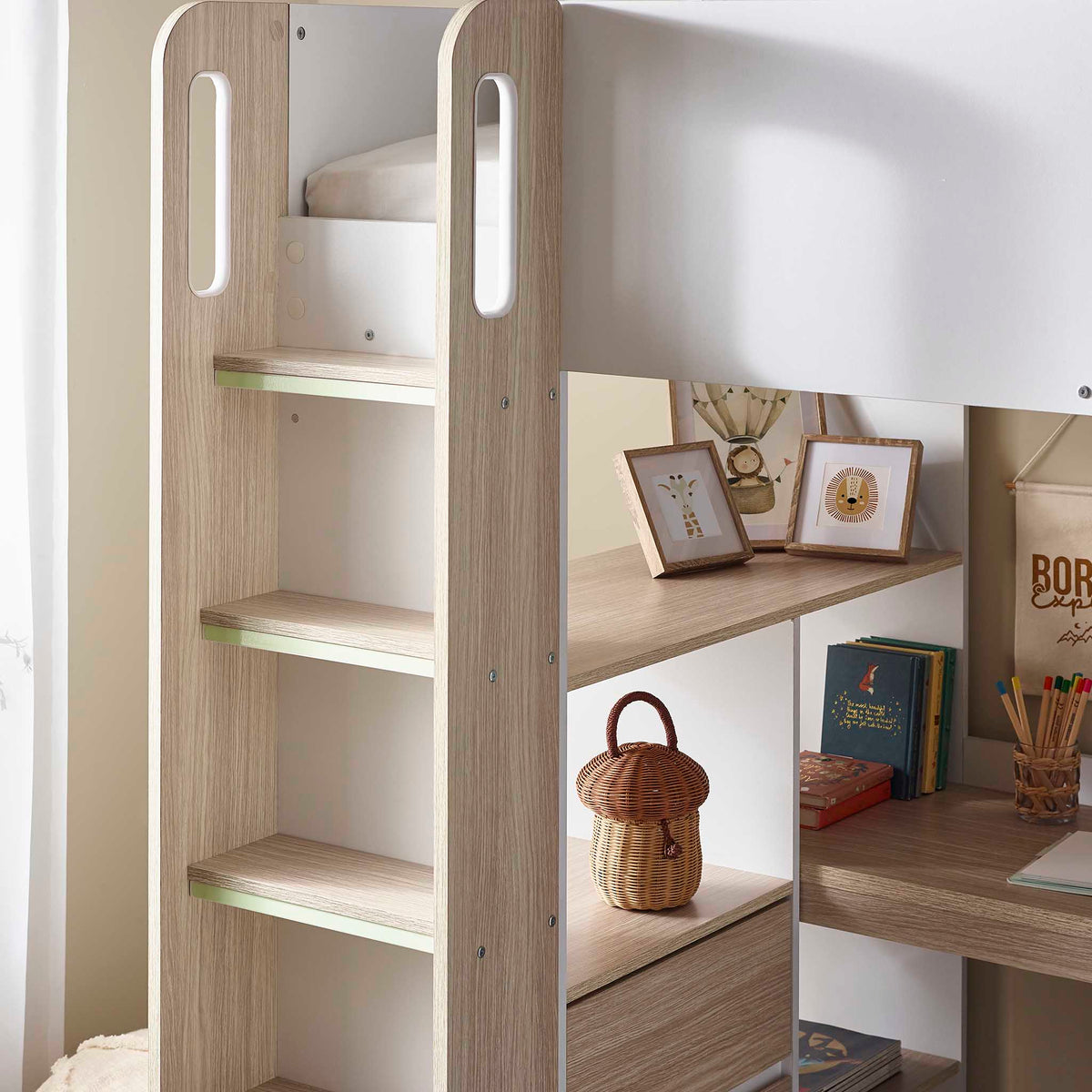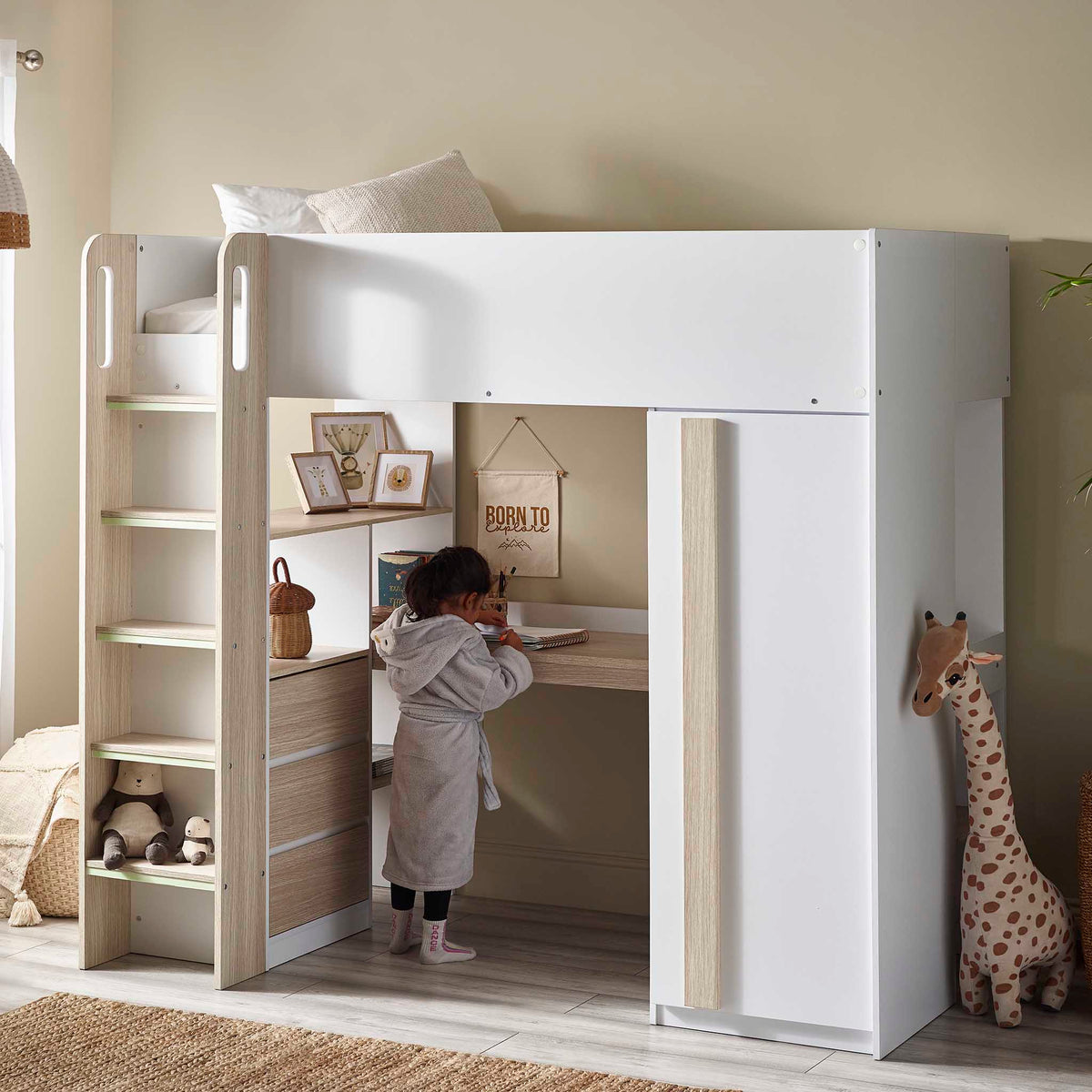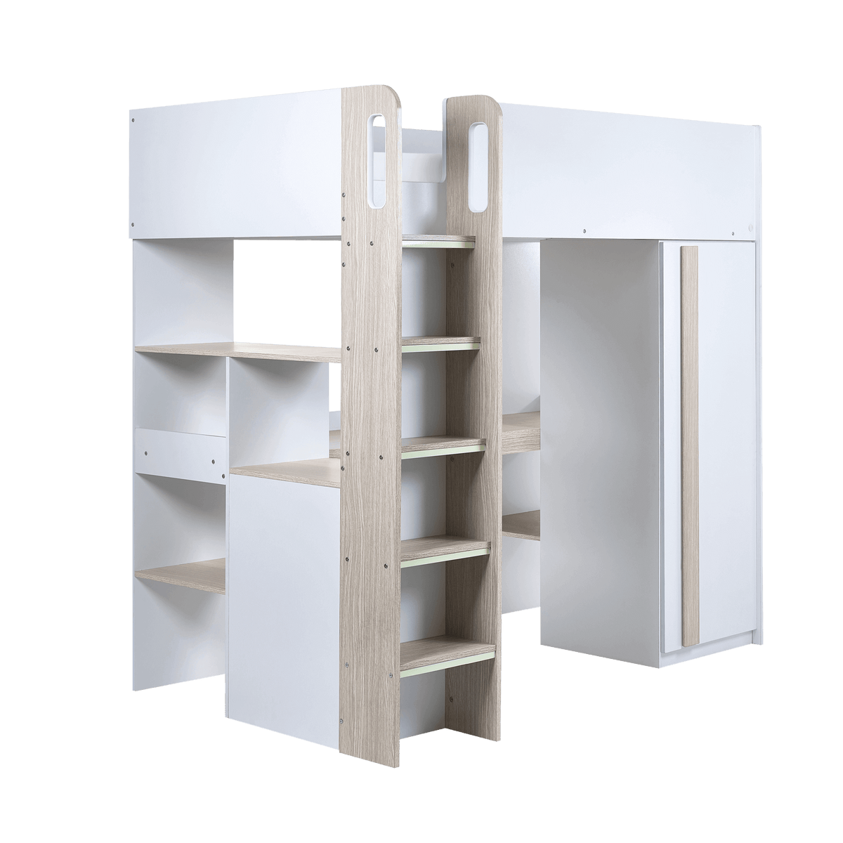 Safety and convenience are key with the Tide High Sleeper. It features a glow-in-the-dark stepped ladder, ensuring easy and safe access to the bed even at night. Ideal for smaller spaces, this bed maximises room layout by combining sleep, study, and storage into a compact design.