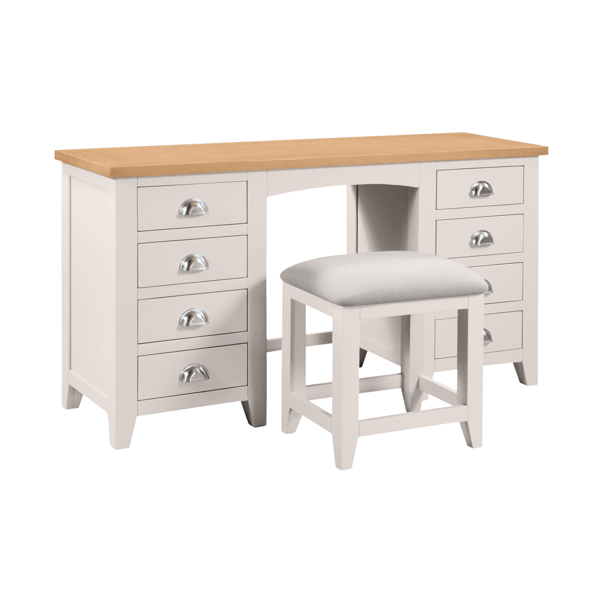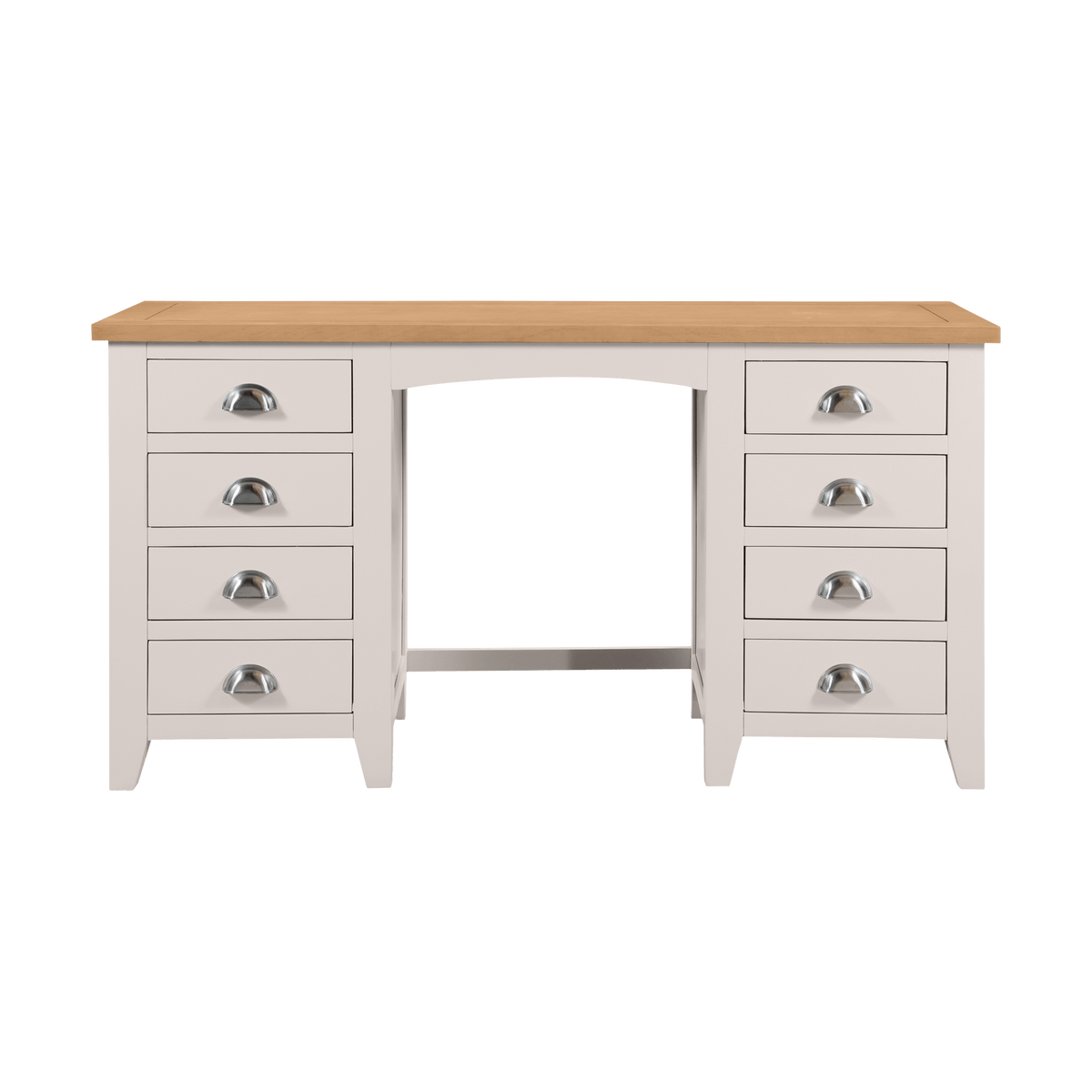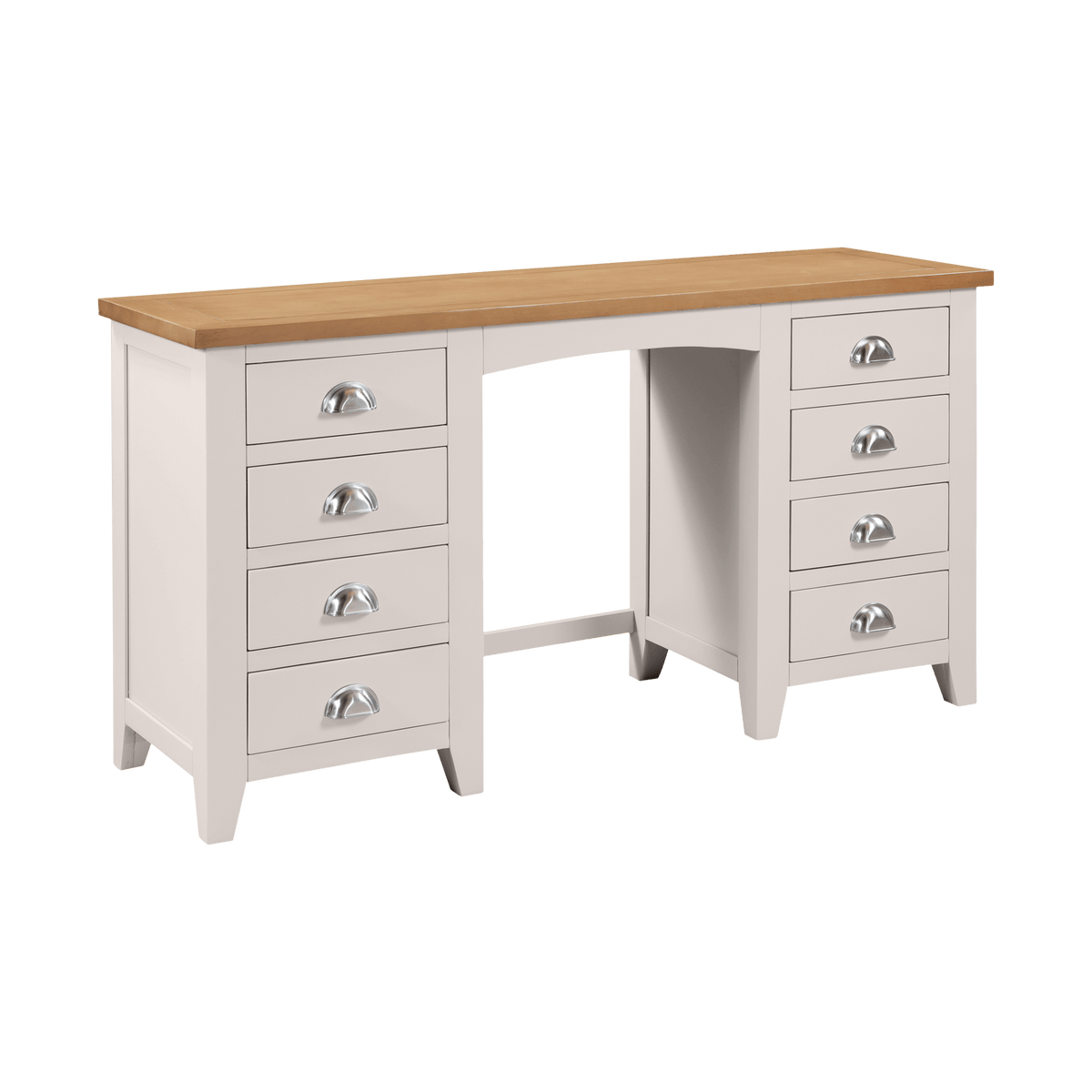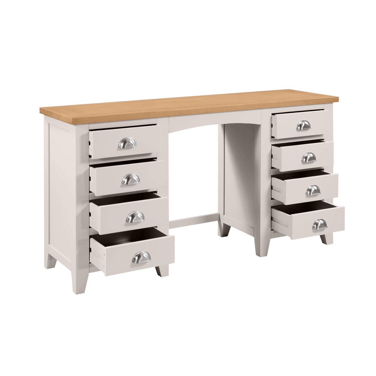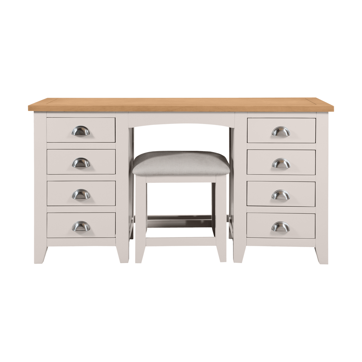 The Trinity Twin Pedestal Dressing Table in Elephant Grey and Pale Oak exudes elegance and functionality. Perfect for your daily routine, it adds a touch of sophistication to your bedroom decor.