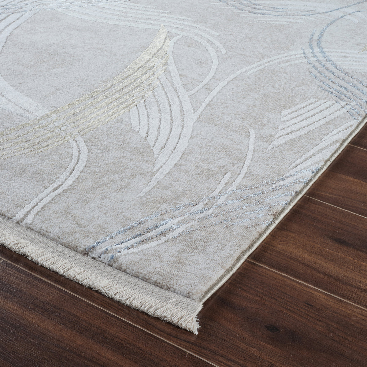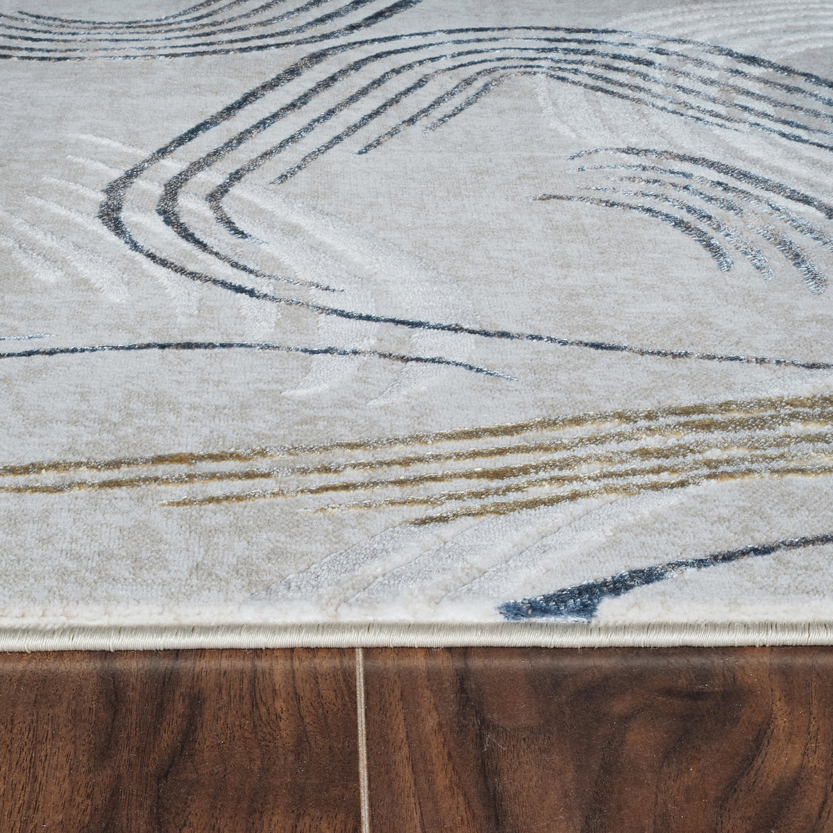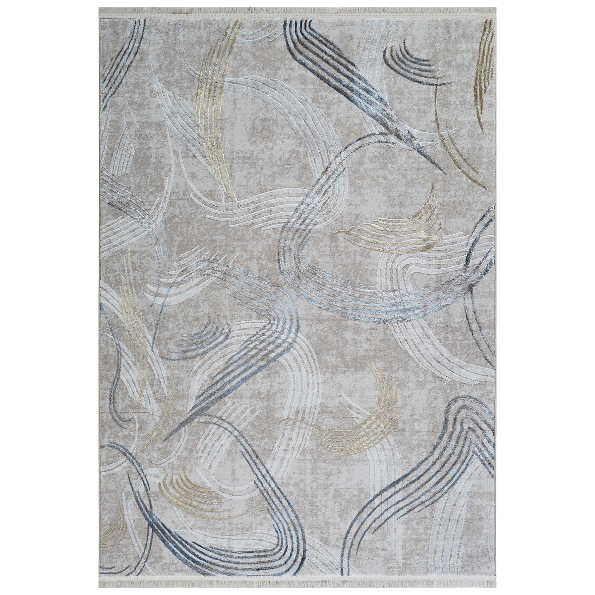 Our Troya Curves Grey/Blue Rug features a abstract design with sweeping, curved lines in muted shades of blue, beige, and gold, set against a neutral taupe background. The pattern is dynamic yet elegant, creating a sense of movement while maintaining a sophisticated look.