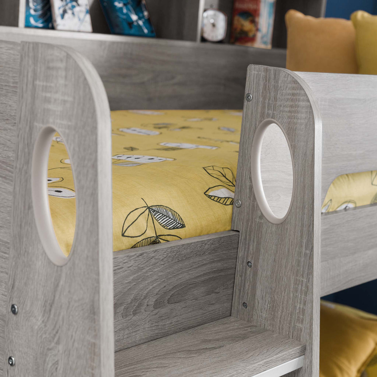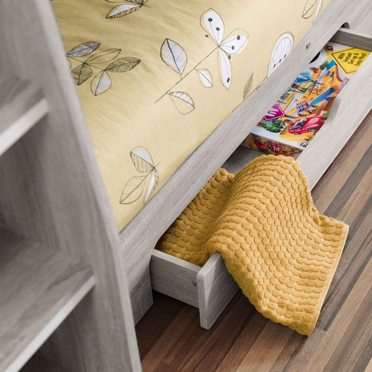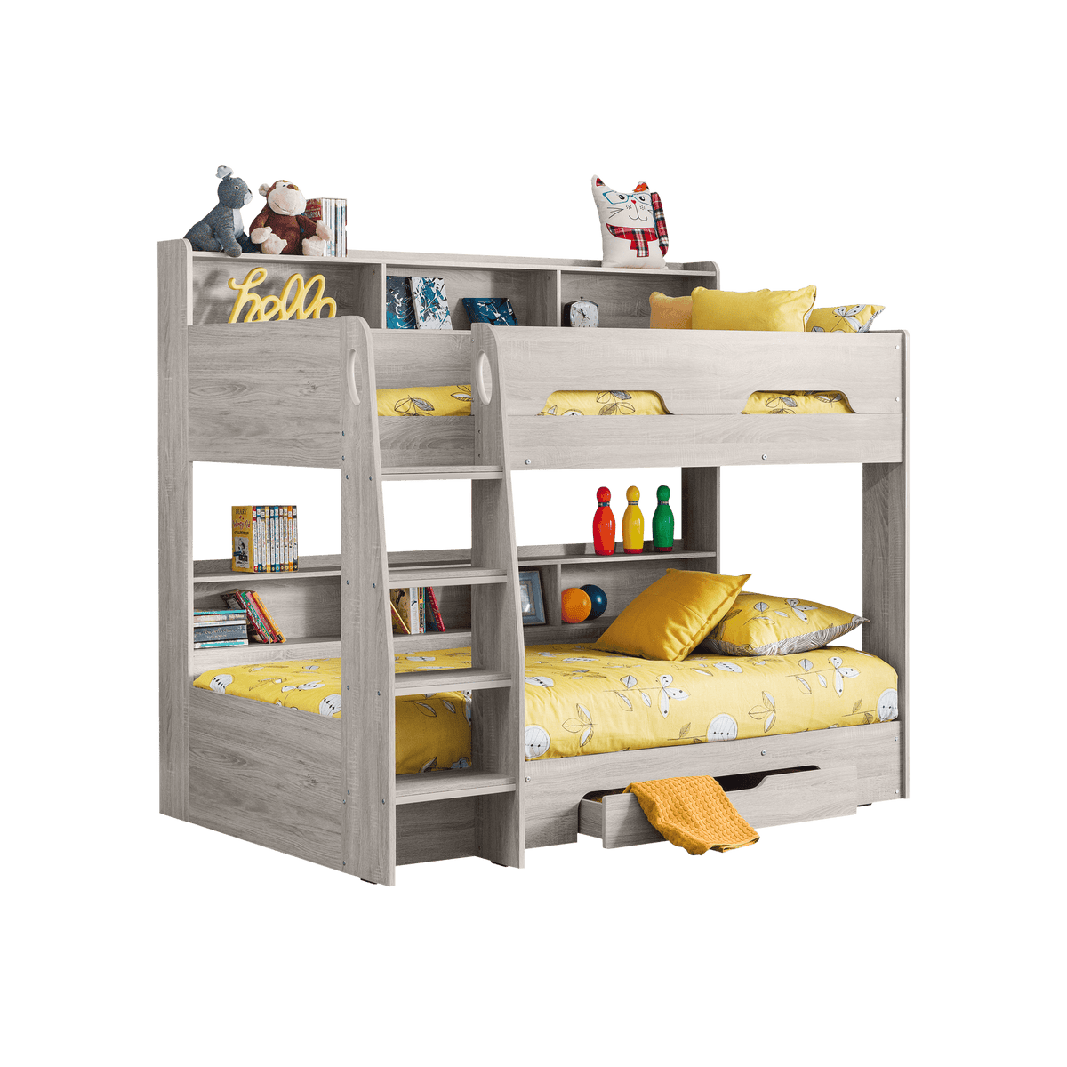 The Ursus Bunk Bed features a light grey wood finish that complements a variety of room decors. Beyond its aesthetic appeal, the bunk also offers practical storage solutions with built-in shelving in the headboard of each bunk, ideal for toys, books, etc. Additionally, a spacious pull-out drawer beneath the bottom bunk offers extra storage for essentials.