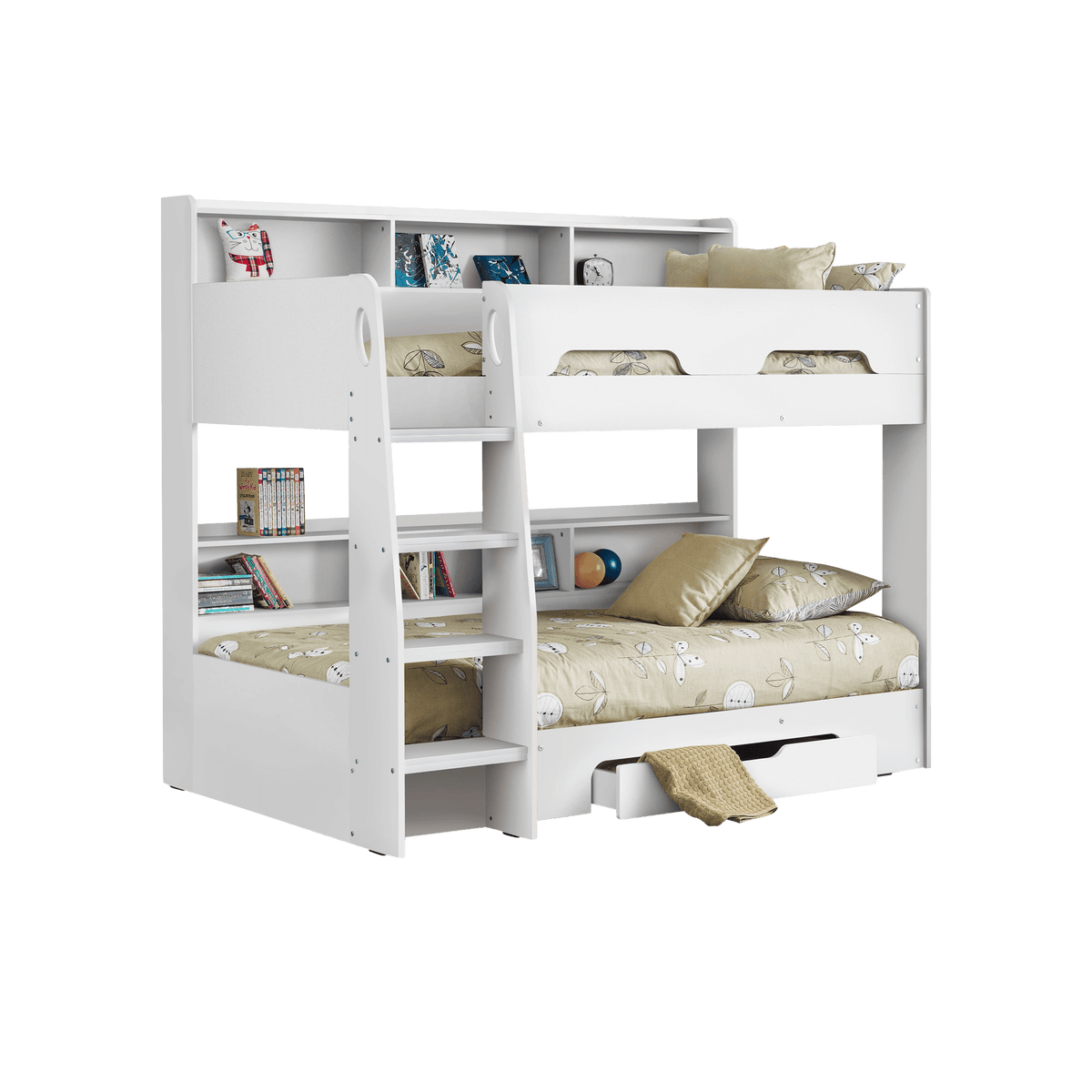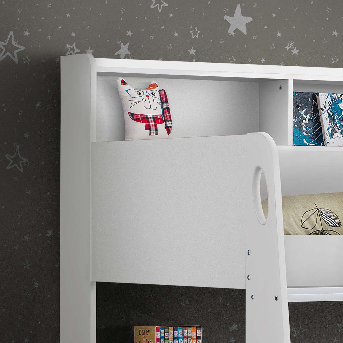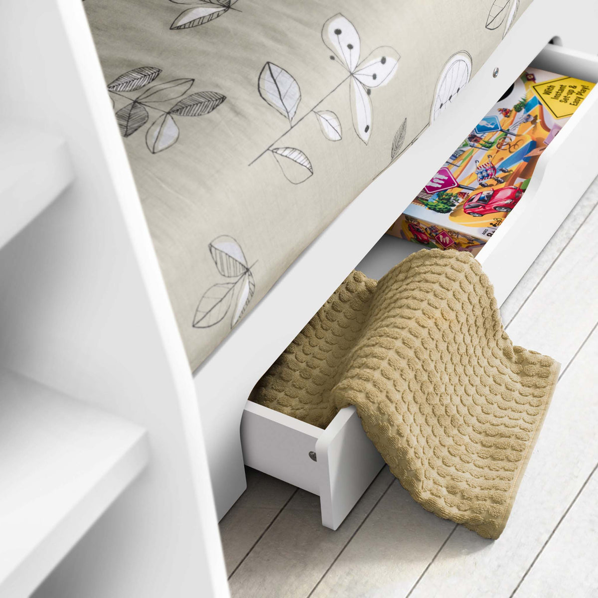 The Ursus Bunk Bed features a light grey wood finish that complements a variety of room decors. Beyond its aesthetic appeal, the bunk also offers practical storage solutions with built-in shelving in the headboard of each bunk, ideal for toys, books, etc. Additionally, a spacious pull-out drawer beneath the bottom bunk offers extra storage for essentials.