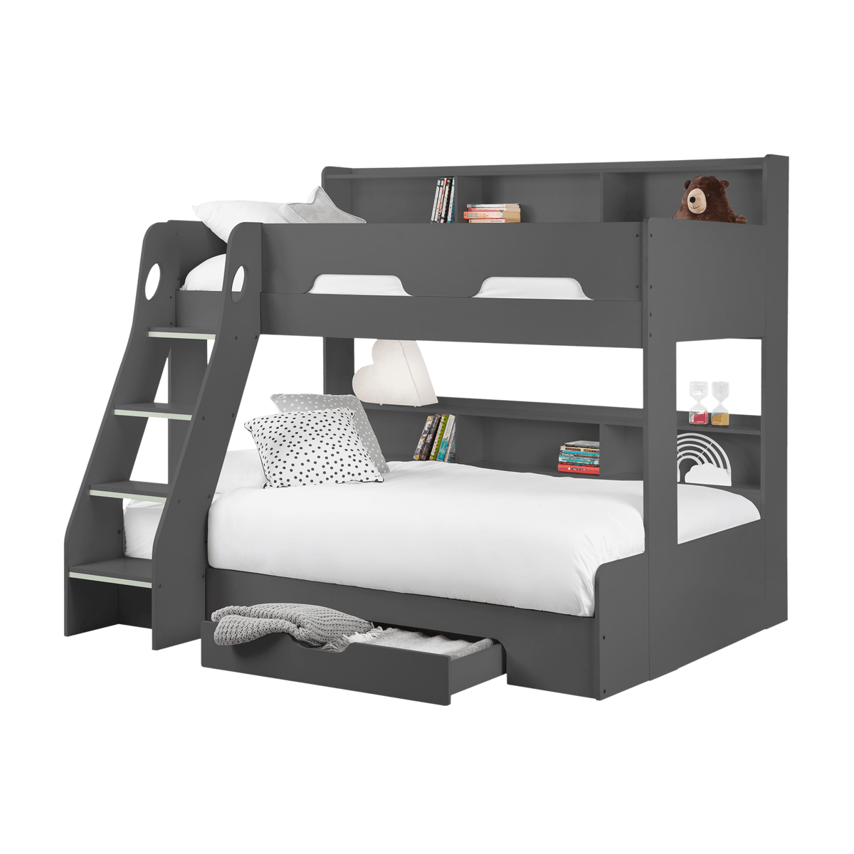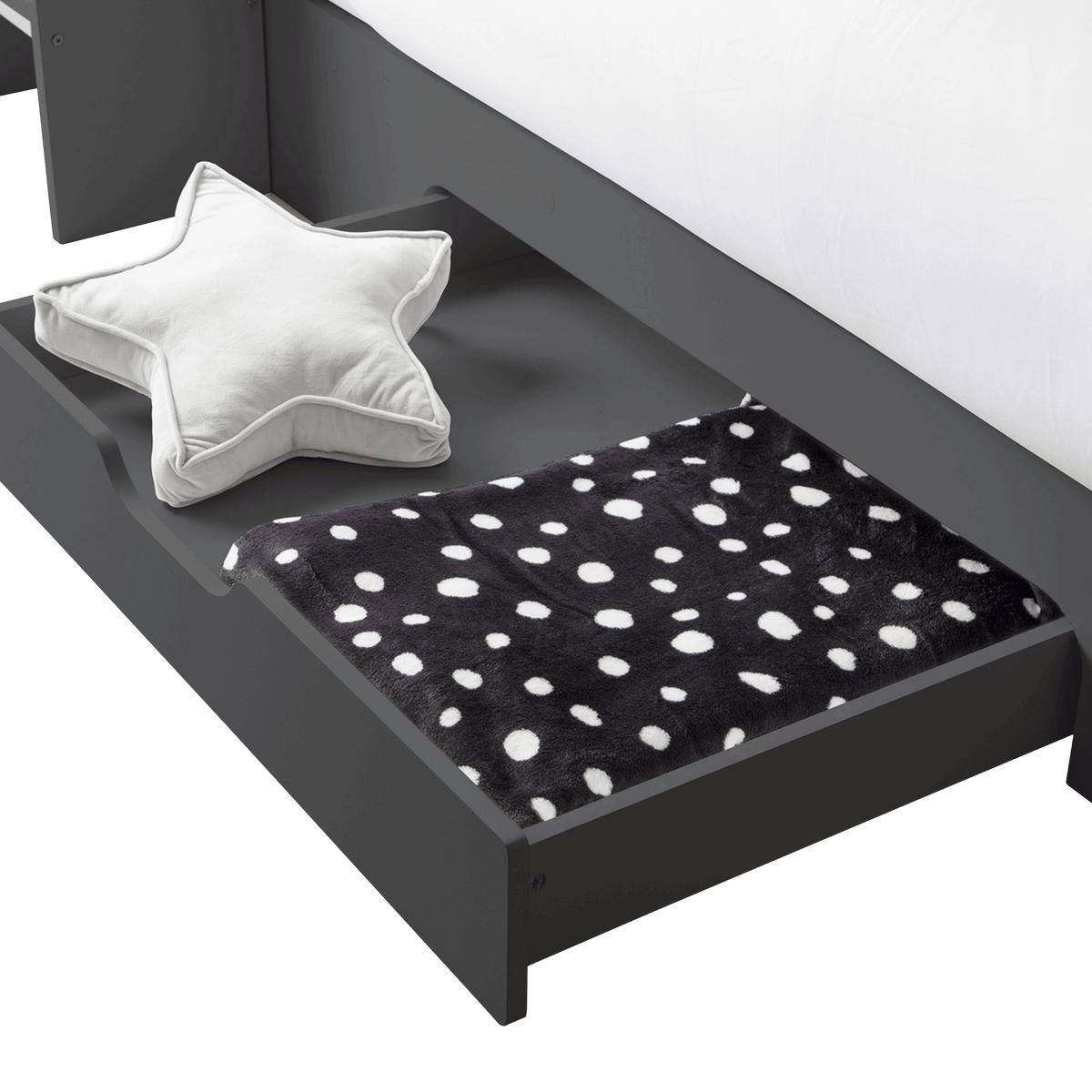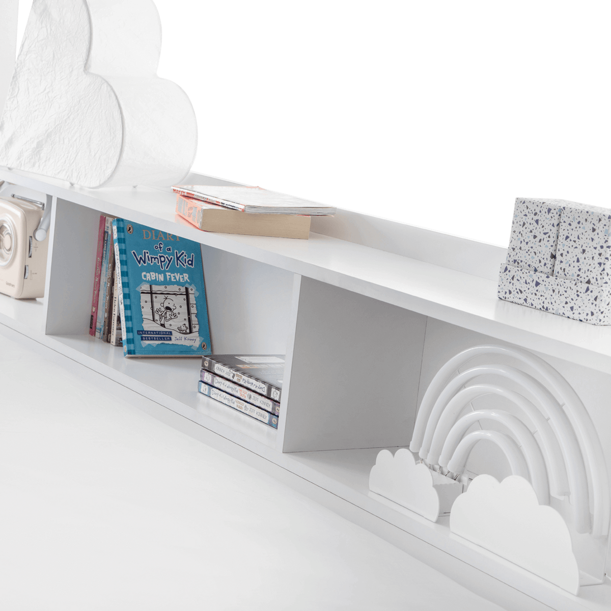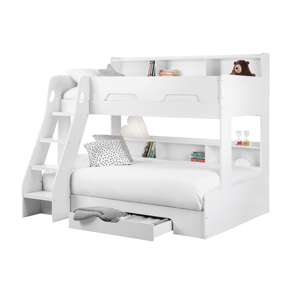 The design includes a handy pull-out drawer for extra storage and extensive shelving for books, toys, or decorative items, all thoughtfully equipped with a raised lip to prevent items from slipping off.