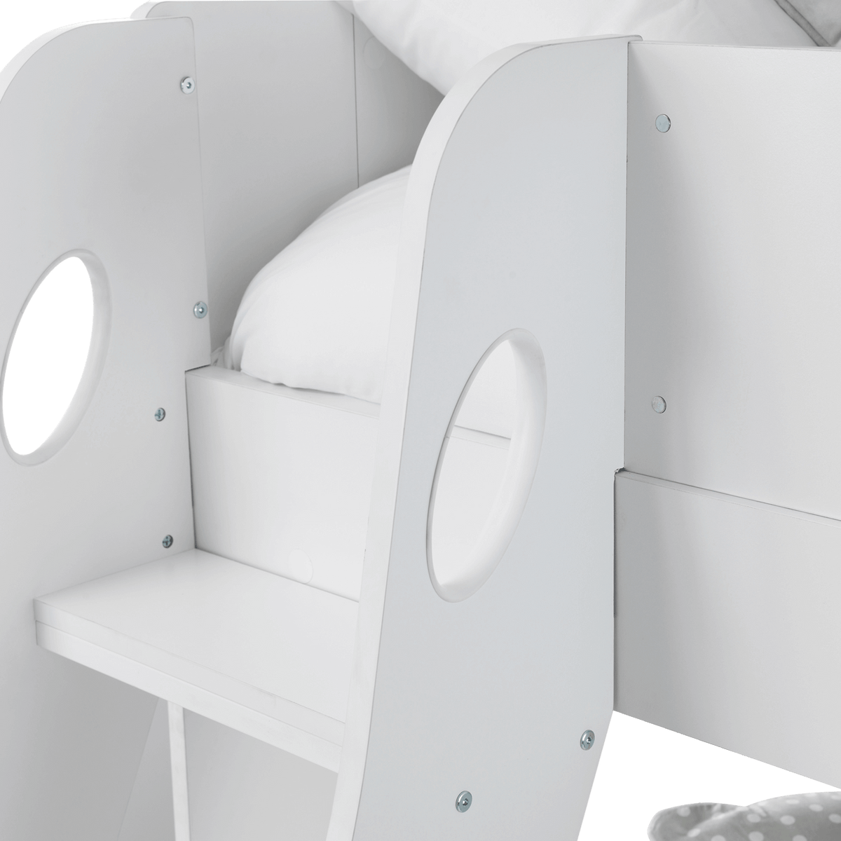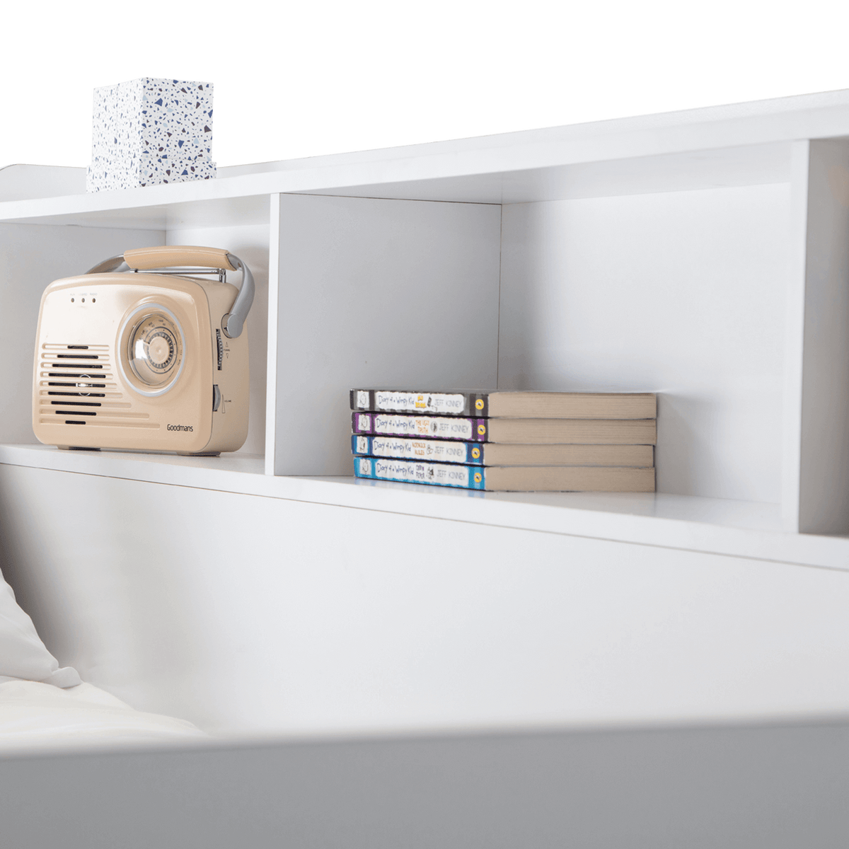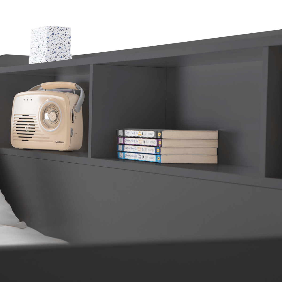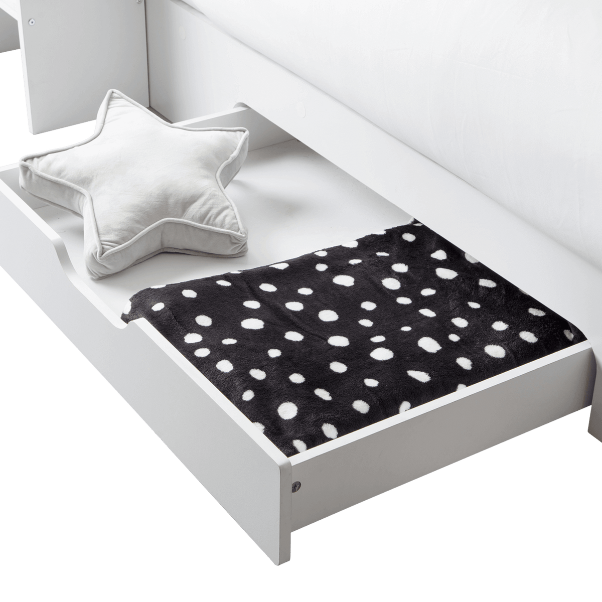 The design includes a handy pull-out drawer for extra storage and extensive shelving for books, toys, or decorative items, all thoughtfully equipped with a raised lip to prevent items from slipping off.