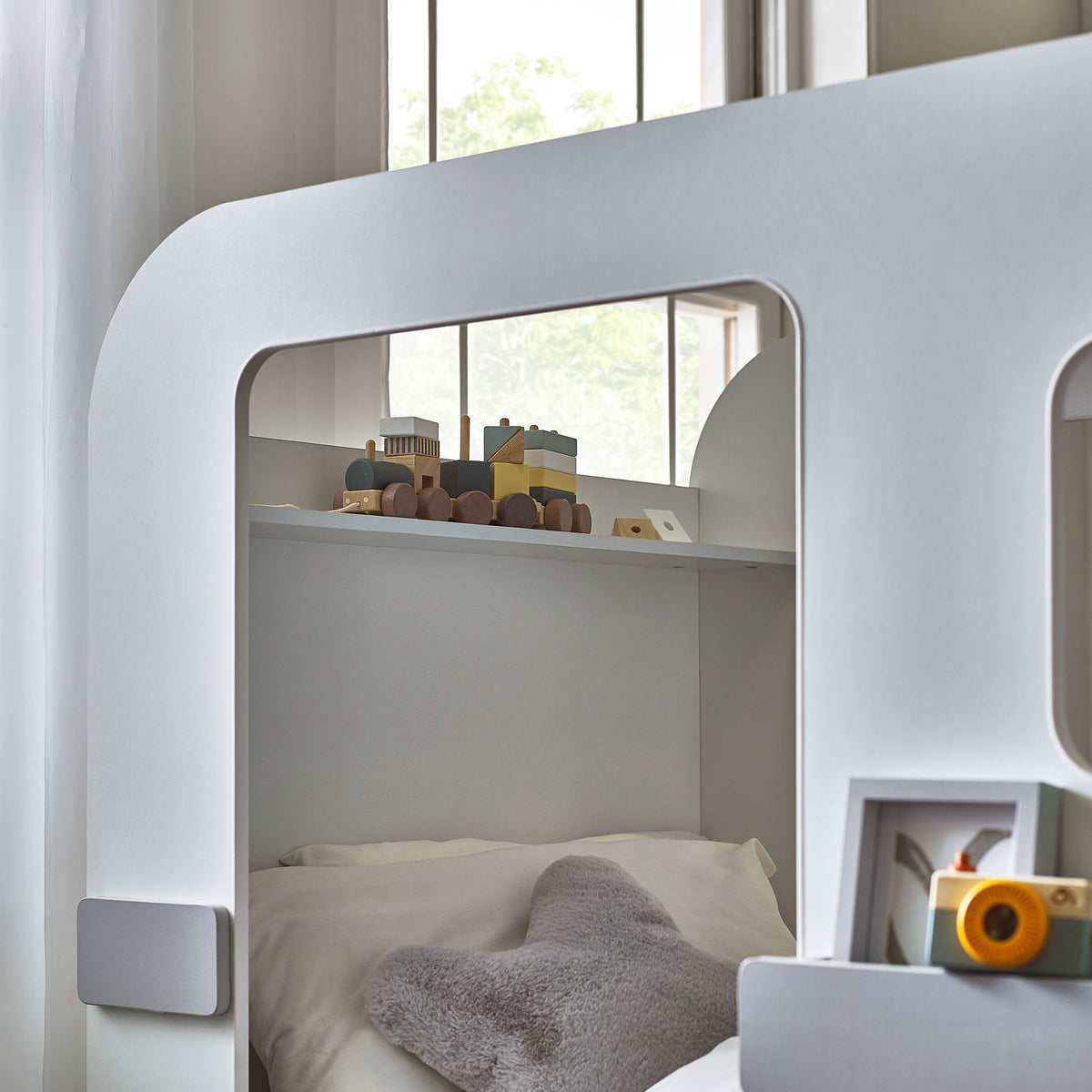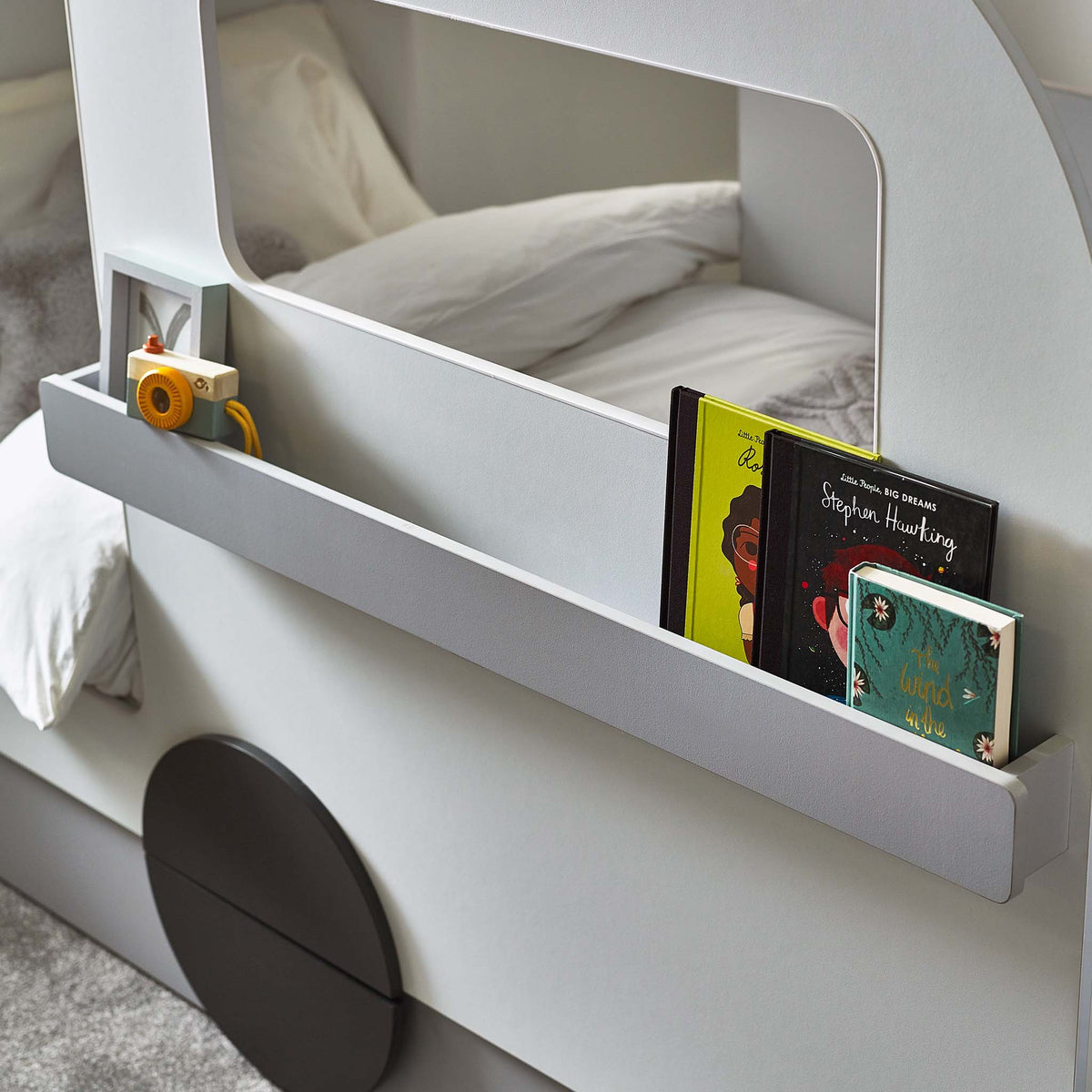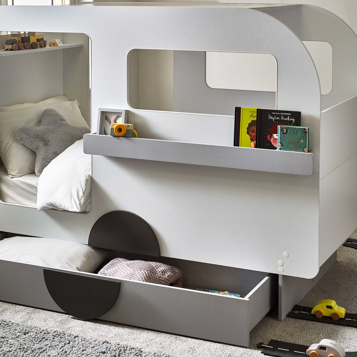 Equipped with shelves inside and at the front, along with a convenient pull-out drawer at the bottom, it helps keep books, toys, and essentials neatly organised and easily accessible. The Voyager Caravan Bed is more than just a place to sleep; it’s a delightful adventure hub, making it a cherished addition to your child’s room.