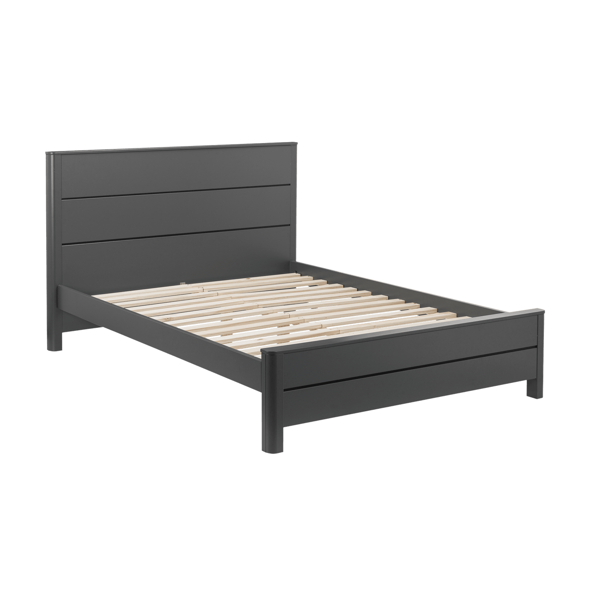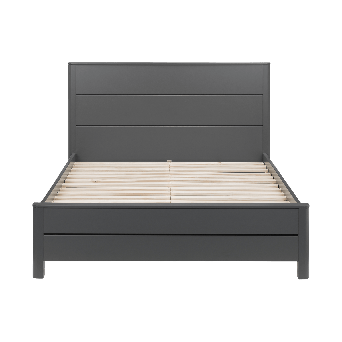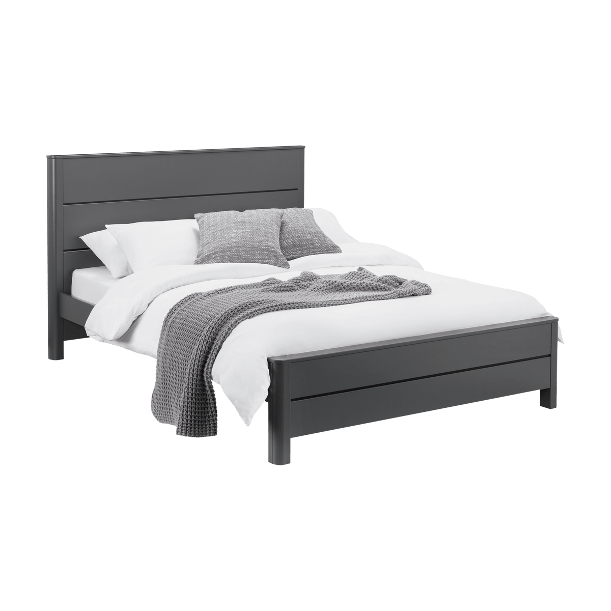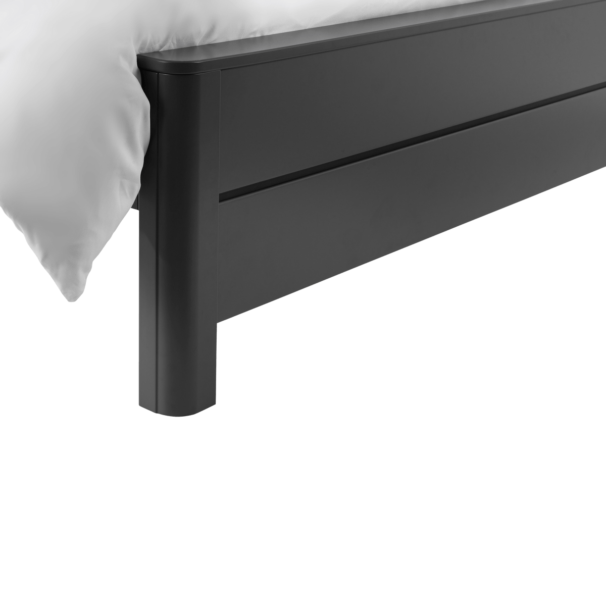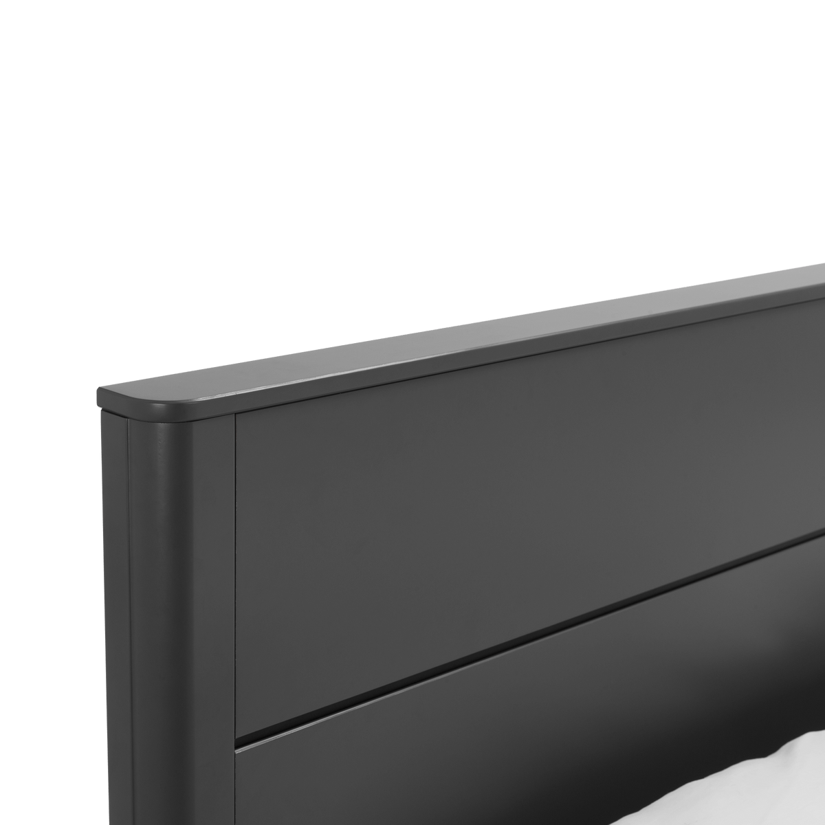 The Williamsburg Bedframe is finished in a sophisticated Storm Grey shade, complemented by satin black wooden legs and handles, offering a modern touch. Rounded corners provide a softer, more inviting appearance, while the overall structure reflects a modern, retro aesthetic that blends seamlessly with various decor styles.