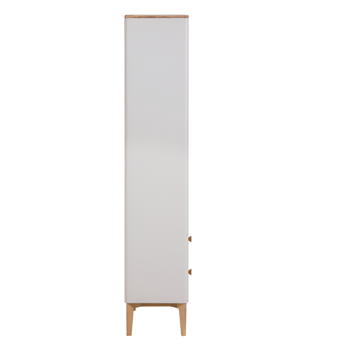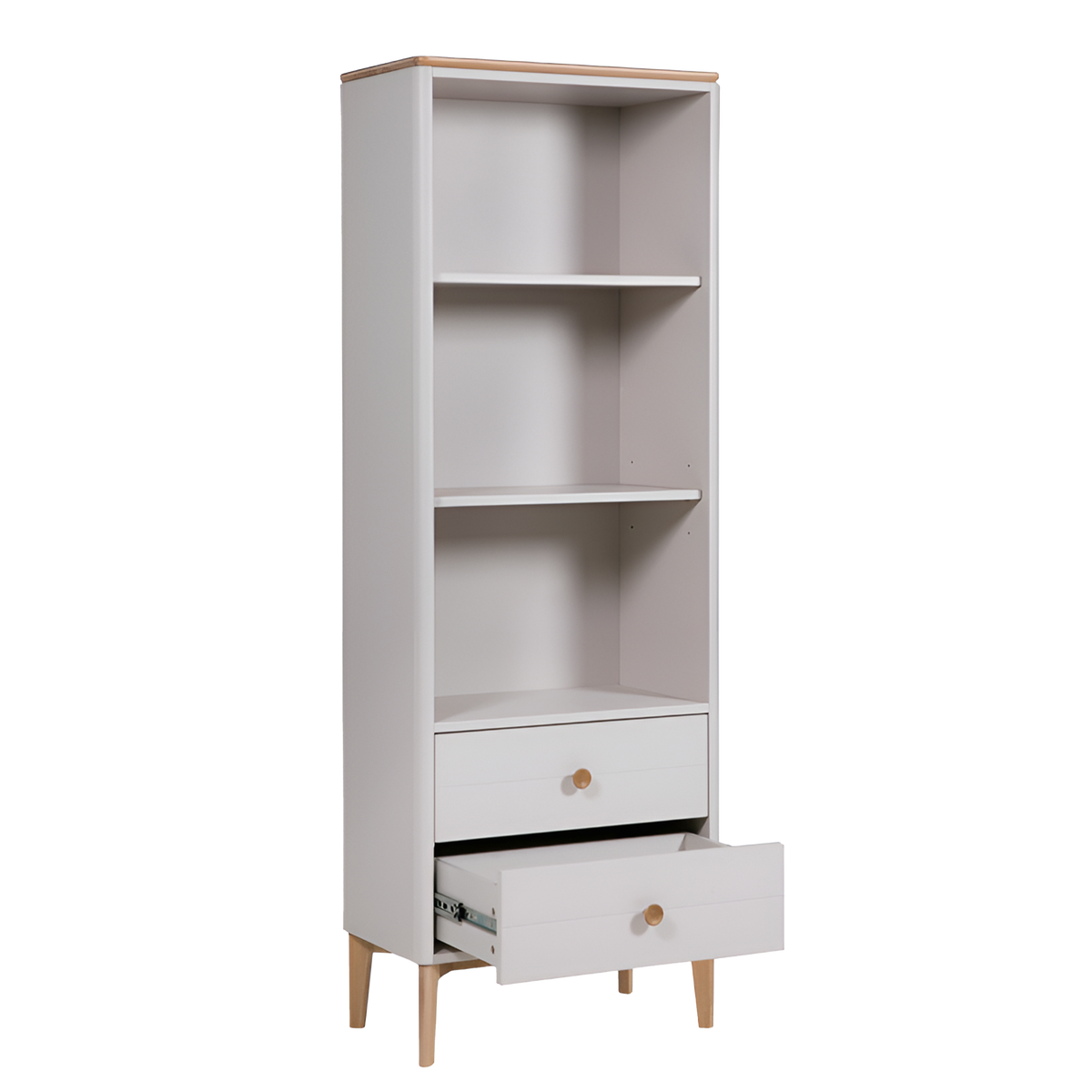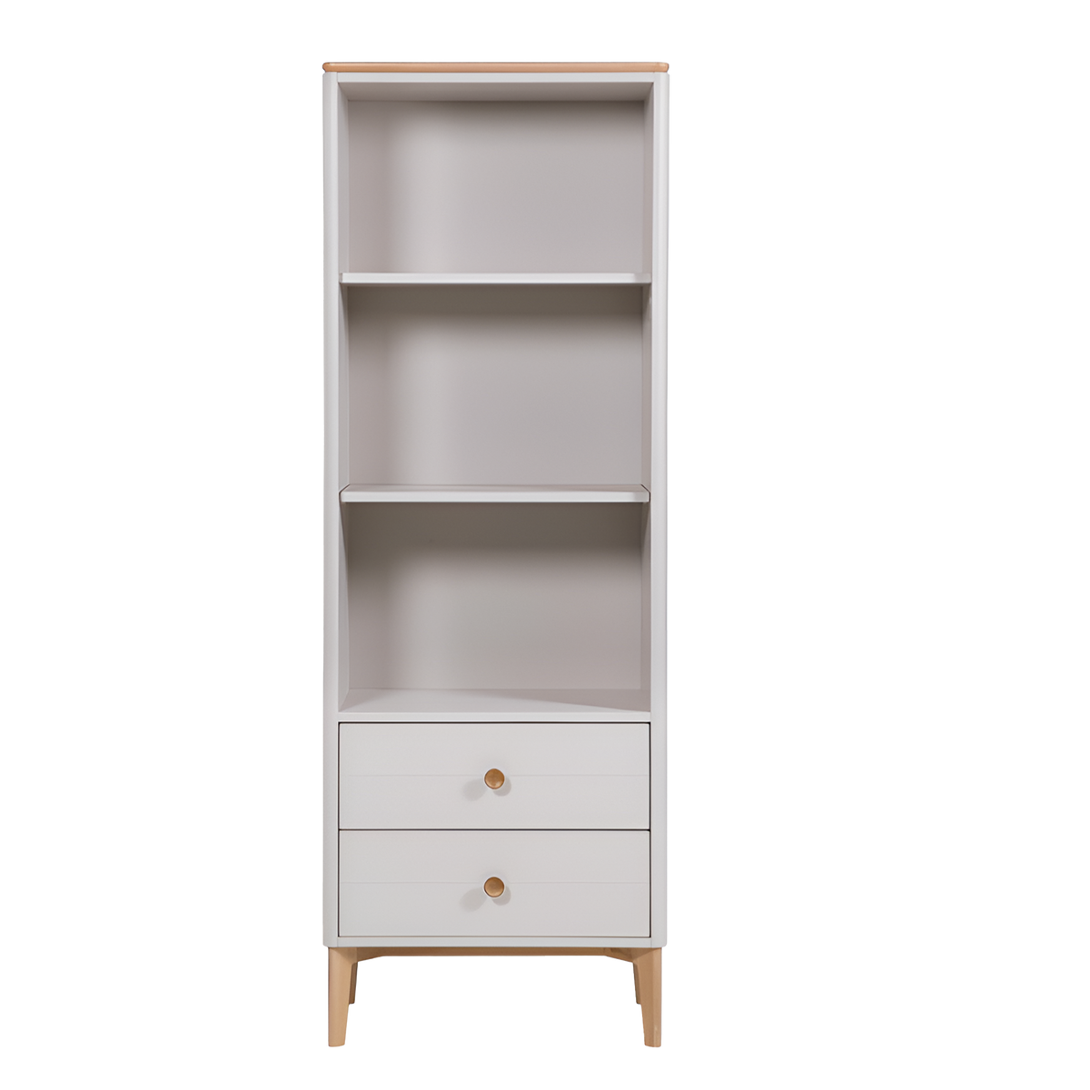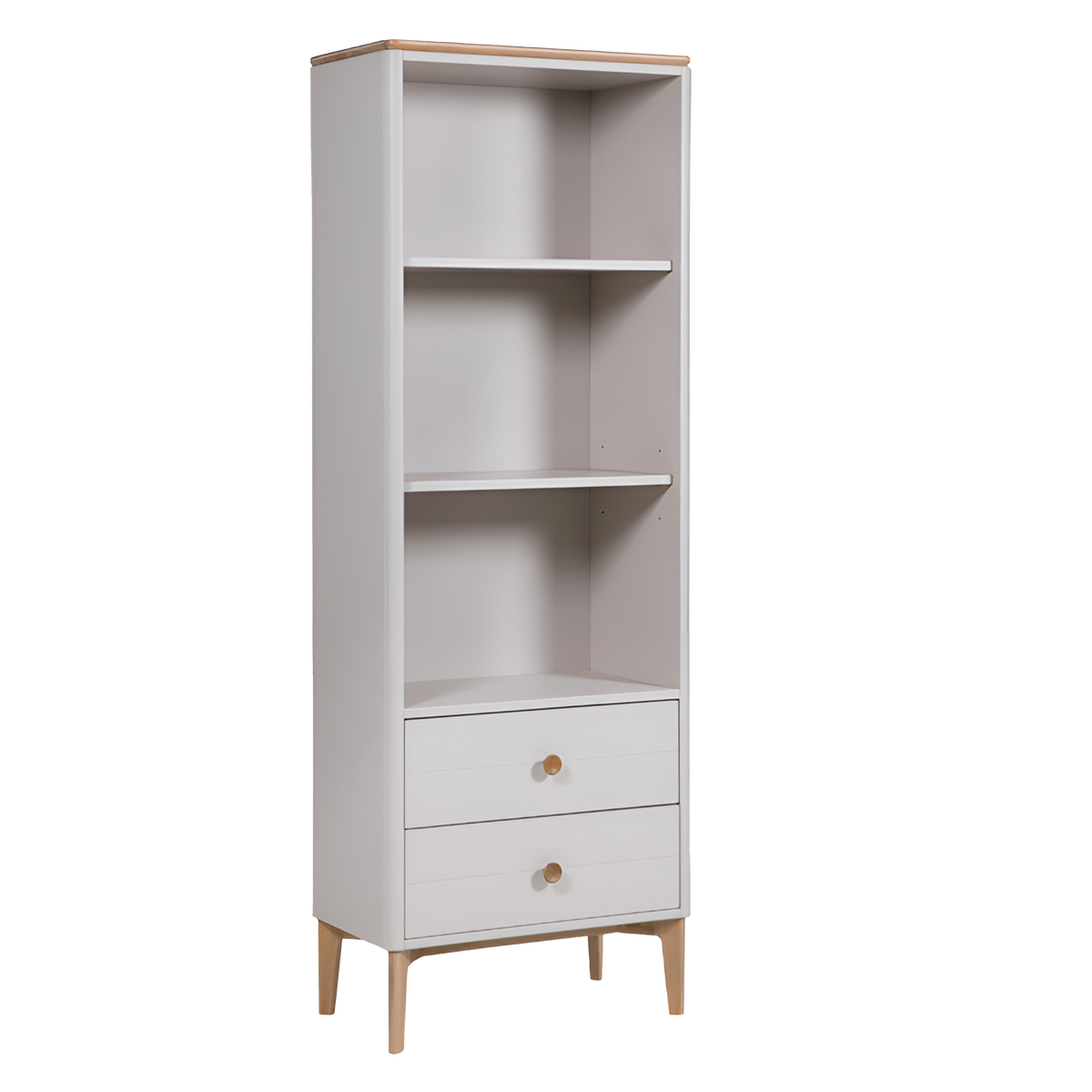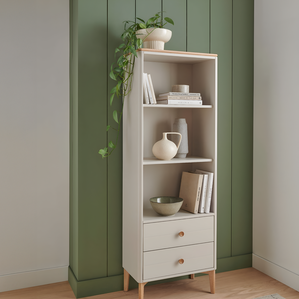 Introducing the Wycombe open storage unit . This stunning Scandinavian-inspired piece is crafted using only the highest quality American white oak and finished with a soft dove grey paint. Featuring two drawers and three shelves, the top shelf measures 304mm and provides ample space for your display items or personal belongings.