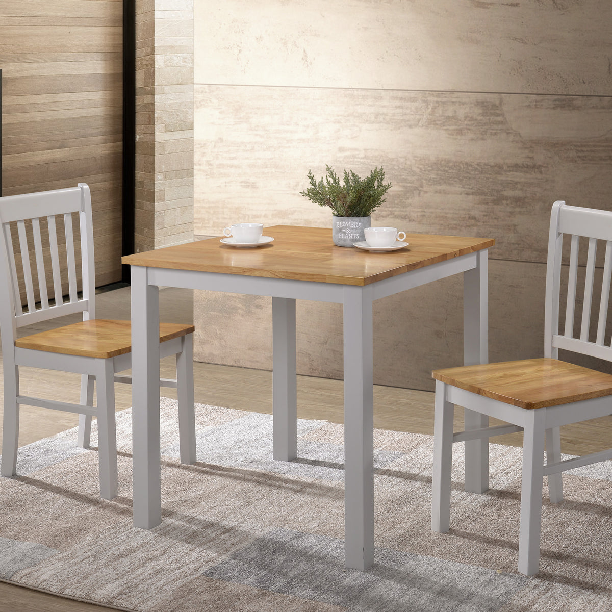 This modern dining set features a square wooden table and four chairs. The set offers a stylish and comfortable dining experience. The table's clean lines and grey finish create a contemporary look, while the warm oak wood top adds a touch of natural warmth. The chairs' comfortable design and combination of grey and oak finishes complement the table's aesthetic. The overall style of the set is versatile, making it suitable for various home decor styles.